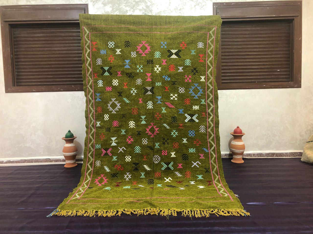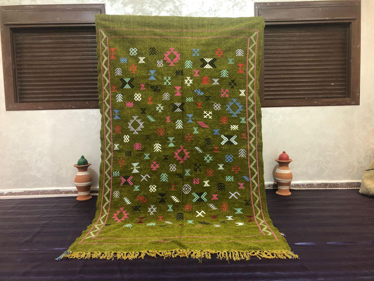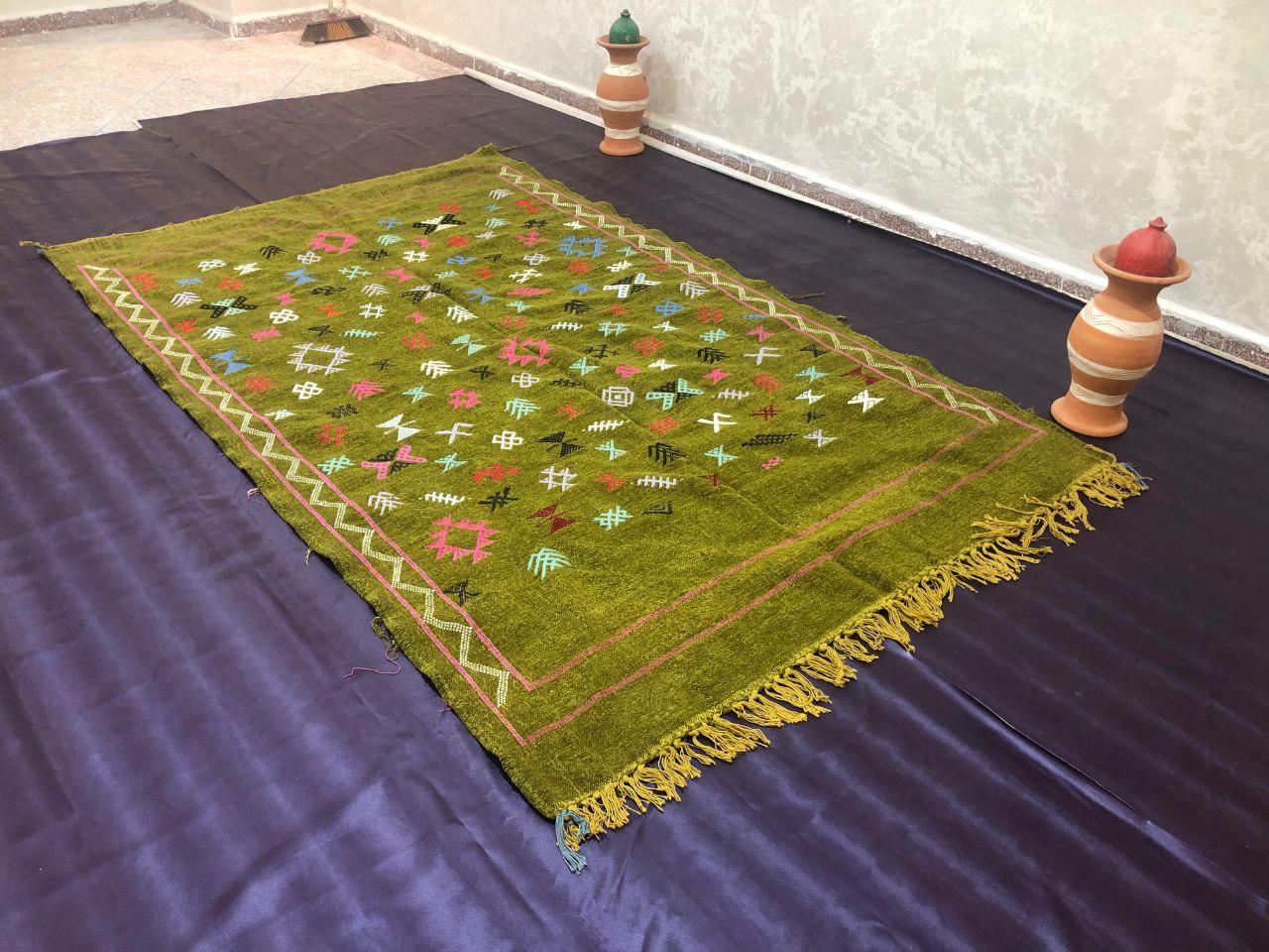 Green Moroccan Kilim Rug: Colorful Berber Wool Rug