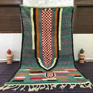A Moroccan Berber Colorful rug is a traditional handwoven floor covering that originates from the indigenous Berber people of Morocco. These rugs are known for their intricate patterns and bold, geometric designs, which are created using a variety of natural dyes and High-quality Wool. Moroccan boujad rugs are versatile and can be used to add a touch of bohemian chic to any room, from a living room or bedroom to a home office or entryway. They are durable and easy to maintain, making them a practical choice for high-traffic areas. Whether you're looking to add a pop of color to your space or create a warm and welcoming atmosphere, a Moroccan Berber rug is a great choice.