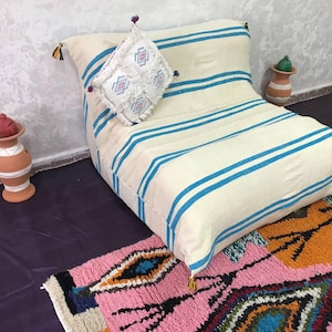 Material : Soft sourced from sheep Type : Floor cushion crafted from authentic vintage Boujaad rugs Region : High Atlas Mountains of Morocco Colors : Refer to the detailed close-up images for accurate color representation, including fringes and pile textures. Condition : Pristine condition—clean, free of stains, and ready to enhance your space! ⚠️ Important Note : Our floor pillows are shipped unstuffed. Simply add your preferred filler once received!