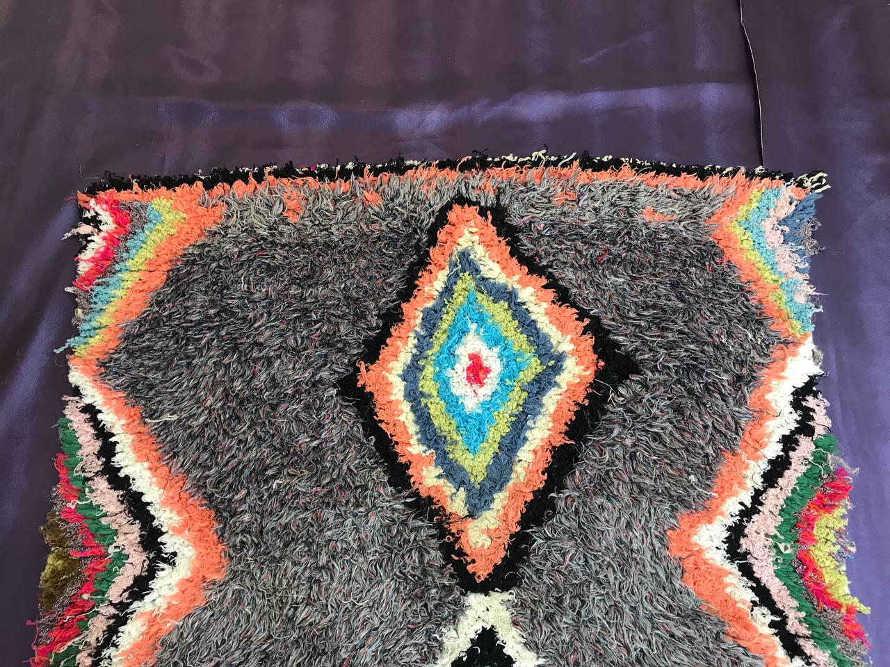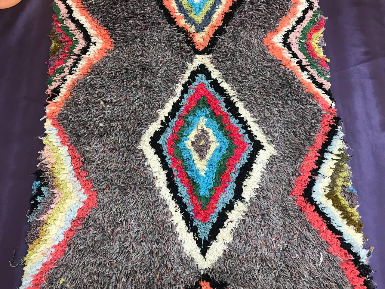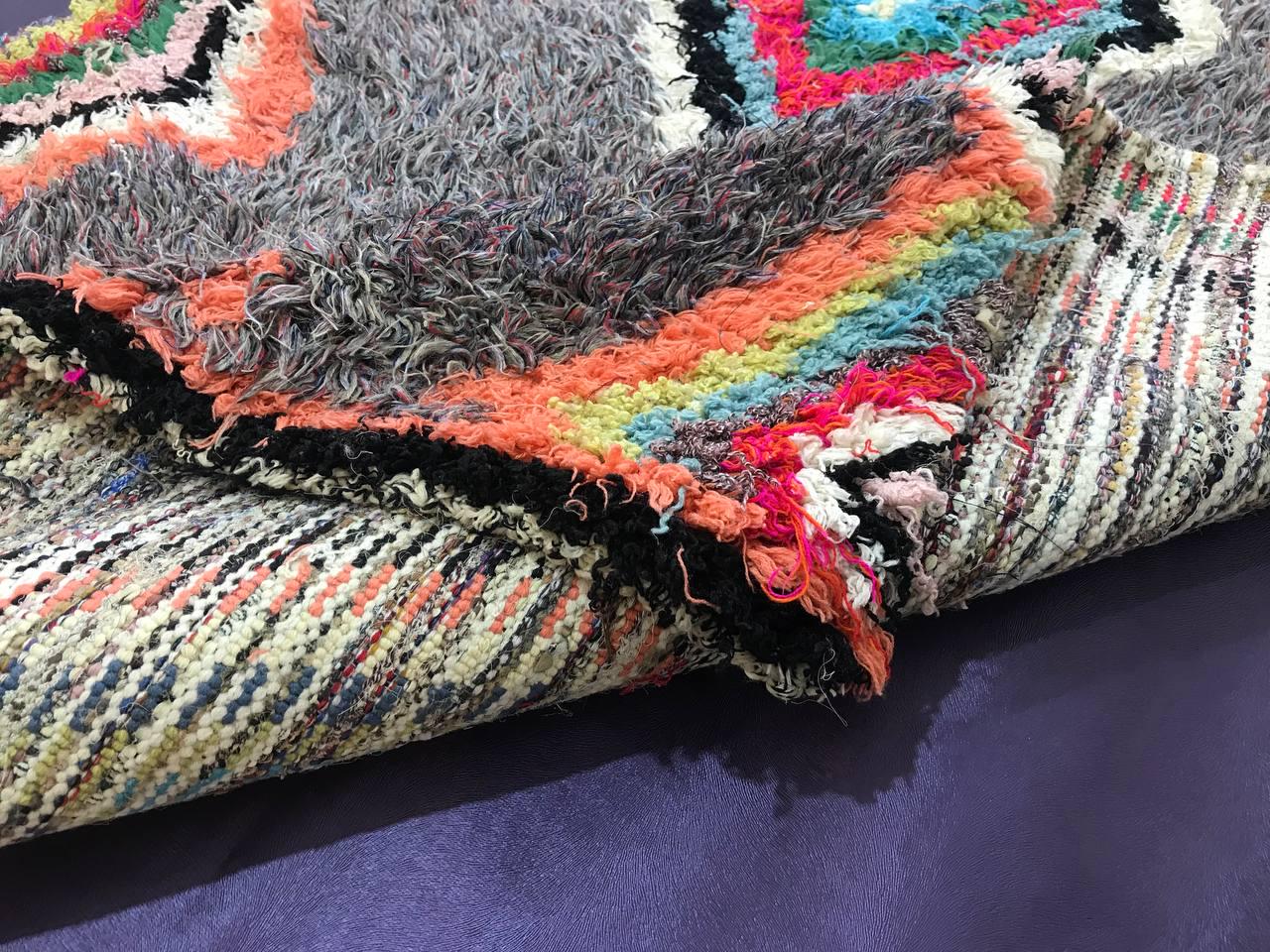 Boujad rugs are traditionally hand-woven by women with natural and soft wool, featuring bright red, pinks, mauve, red, or orange backgrounds, along with irregular geometric patterns reflecting the artistic blend of Arabic and Berber cultures in Morocco. The colors are made from the natural dyes of flowers, henna, leaves, and berries.