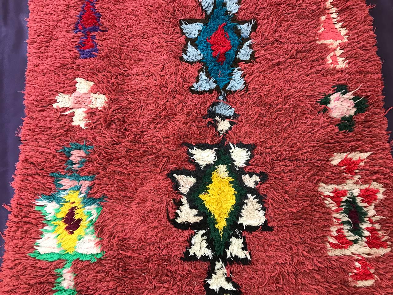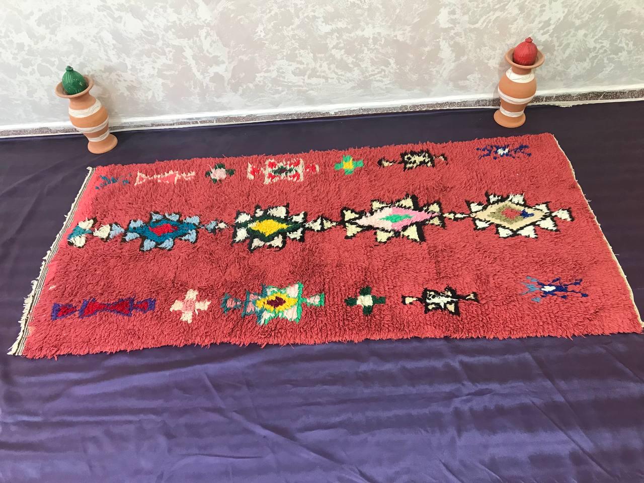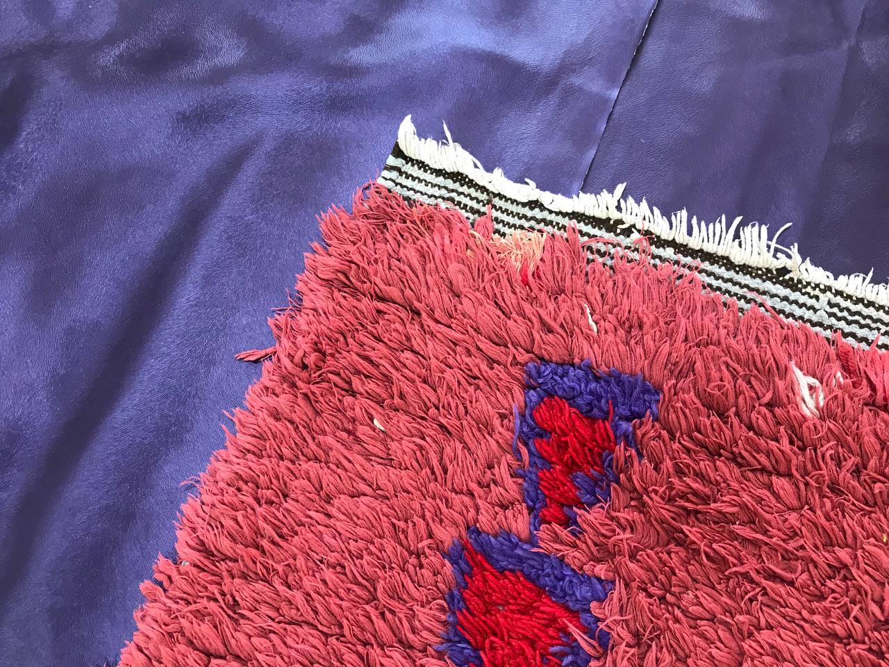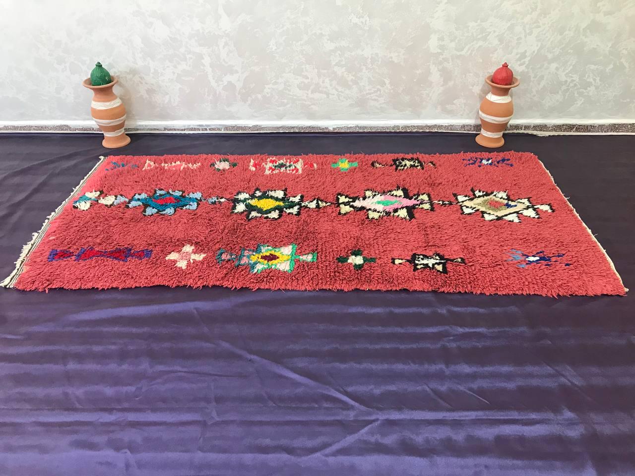 Boujad rugs are traditionally hand-woven by women with natural and soft wool, featuring bright red, pinks, mauve, red, or orange backgrounds, along with irregular geometric patterns reflecting the artistic blend of Arabic and Berber cultures in Morocco. The colors are made from the natural dyes of flowers, henna, leaves, and berries.