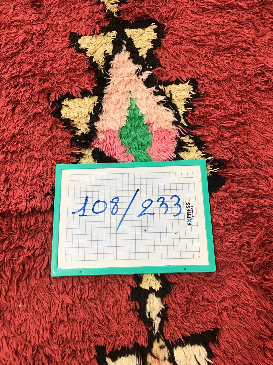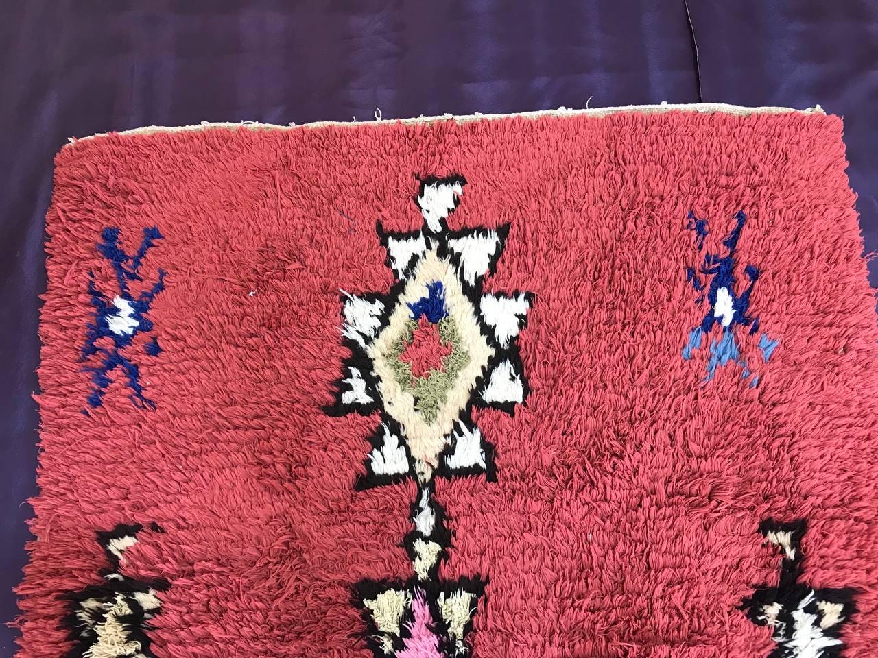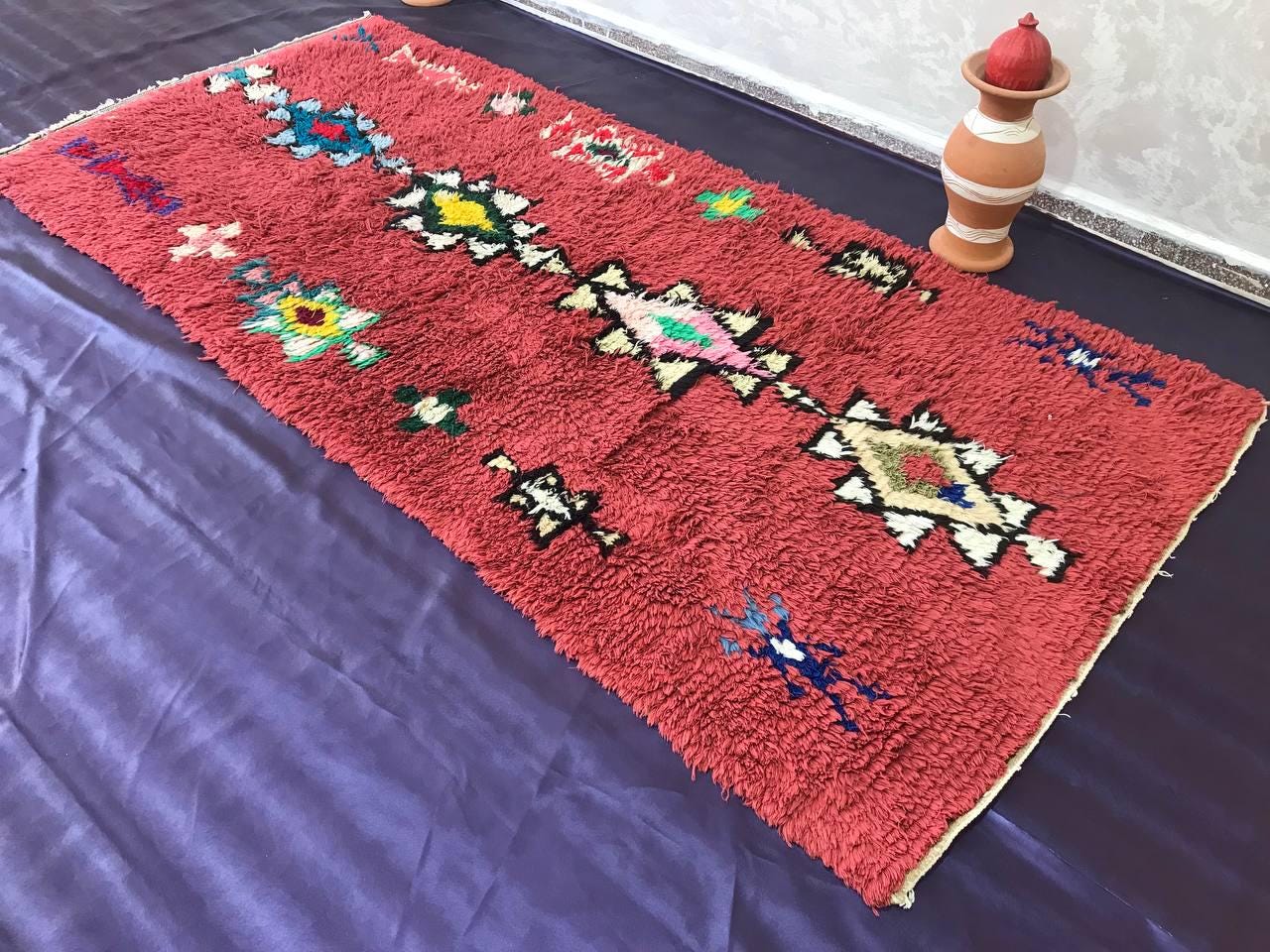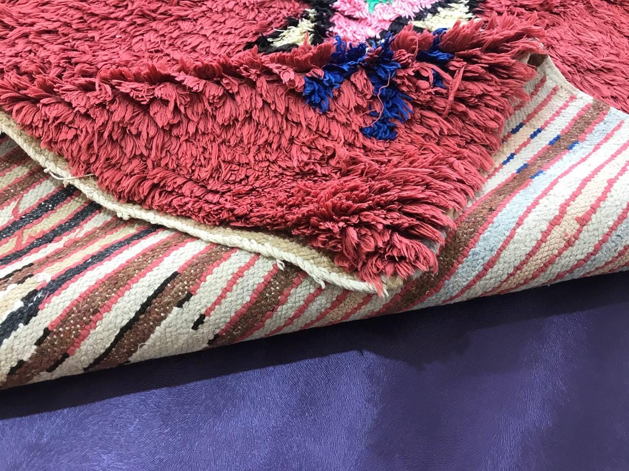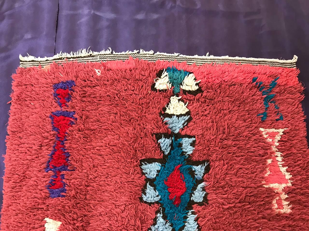Boujad rugs are traditionally hand-woven by women with natural and soft wool, featuring bright red, pinks, mauve, red, or orange backgrounds, along with irregular geometric patterns reflecting the artistic blend of Arabic and Berber cultures in Morocco. The colors are made from the natural dyes of flowers, henna, leaves, and berries.