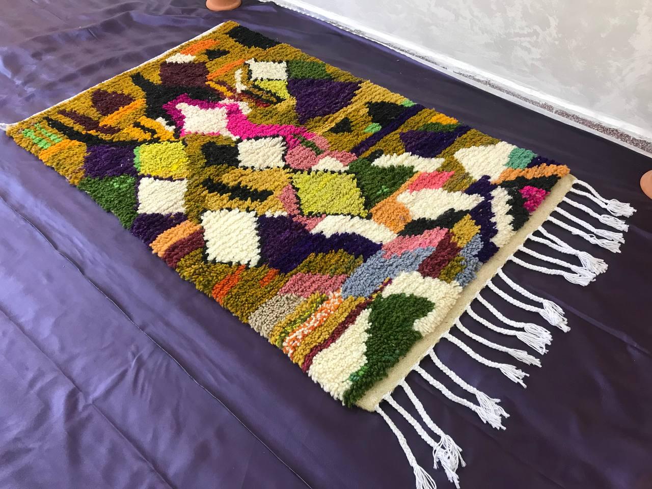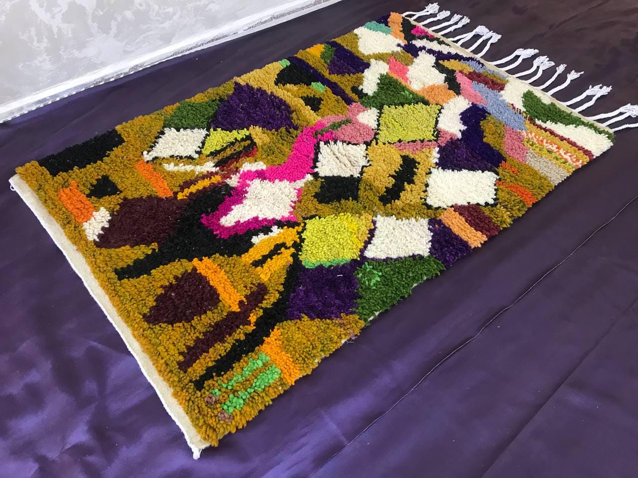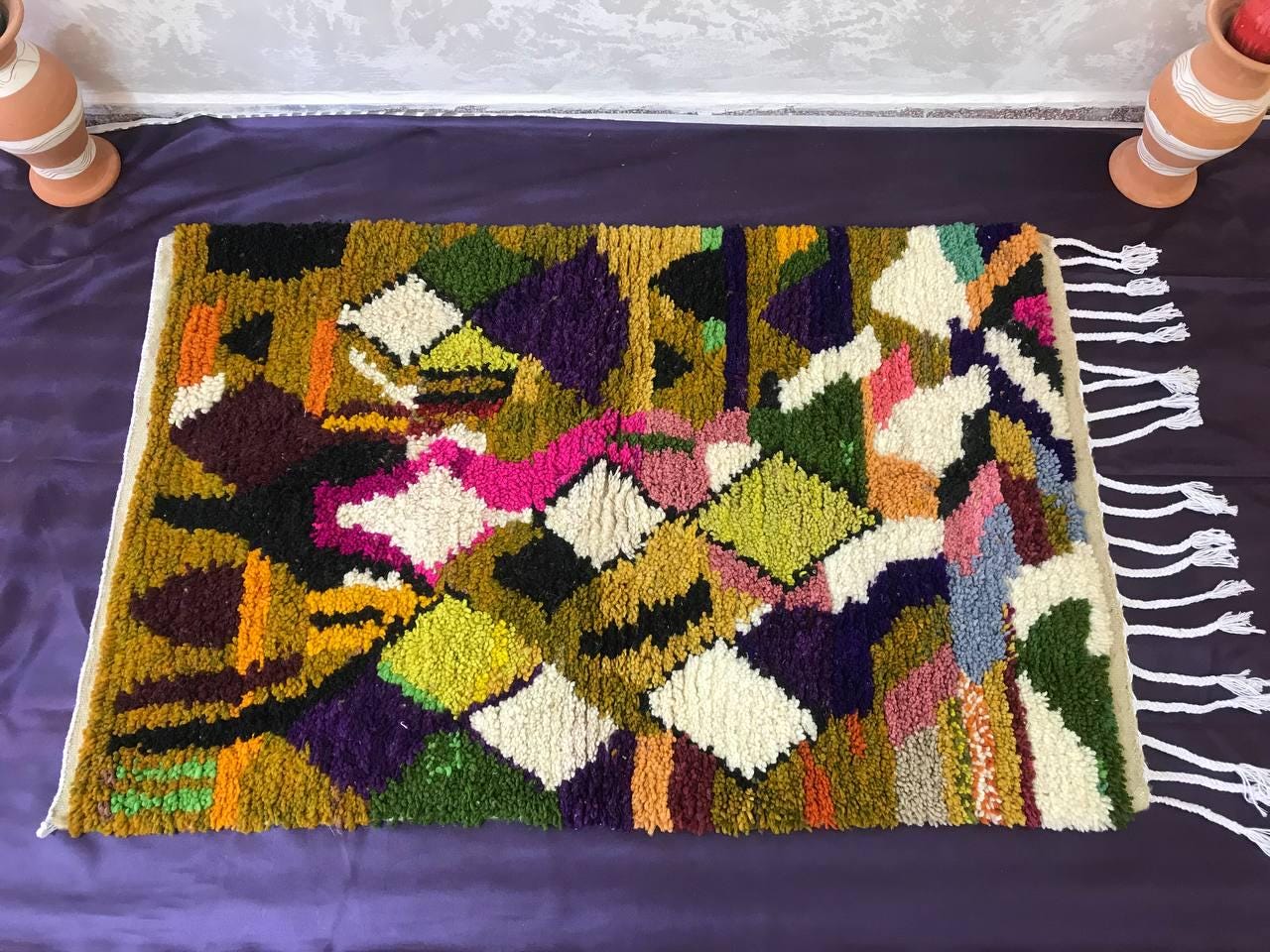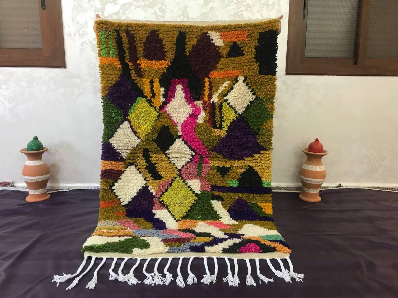 A Moroccan Berber Colorful rug is a traditional handwoven floor covering that originates from the indigenous Berber people of Morocco. These rugs are known for their intricate patterns and bold, geometric designs, which are created using a variety of natural dyes and High-quality Wool. Moroccan boujad rugs are versatile and can be used to add a touch of bohemian chic to any room, from a living room or bedroom to a home office or entryway. They are durable and easy to maintain, making them a practical choice for high-traffic areas. Whether you're looking to add a pop of color to your space or create a warm and welcoming atmosphere, a Moroccan Berber rug is a great choice. 📌 Shipping: insured, trackable, Fast, and FREE Worldwide by FedEx or DHL (2 to 5 days delivery). ❖ Cleaning: all rugs are carefully cleaned before shipping. ❖ Colors: Please take a look at the pictures. ❖ Texture: Moroccan / soft / Shag. ❖ Technique: Hand-Knotted ❖ Construction: Handmade ❖ Location: Indoor Use Only ❖ Material: Your order is made entirely by hand from natural wool, which means there will be natural (and beautiful) variations in pattern and color. Wool shrinks. ❖ Pattern: Because the product is handcrafted, the pattern and Colors may vary slightly from one piece to another. ❖ Size: While we try our best to ensure consistent sizing, it is possible for final sizes to vary by a few inches more or less. ❖ Tassels: One side is the Traditional way of making the rugs. 📌Ships tightly rolled in a protective bag. Any slight creasing will disappear within a few days. Shedding loose fibers is normal with new rugs. Shedding will diminish with regular vacuuming. If you have any questions or queries, please feel free to contact me via messages. Mountain Rug green boujaad custom,custom moroccan rug green wool,Berber Rug Green wool moroccan rug