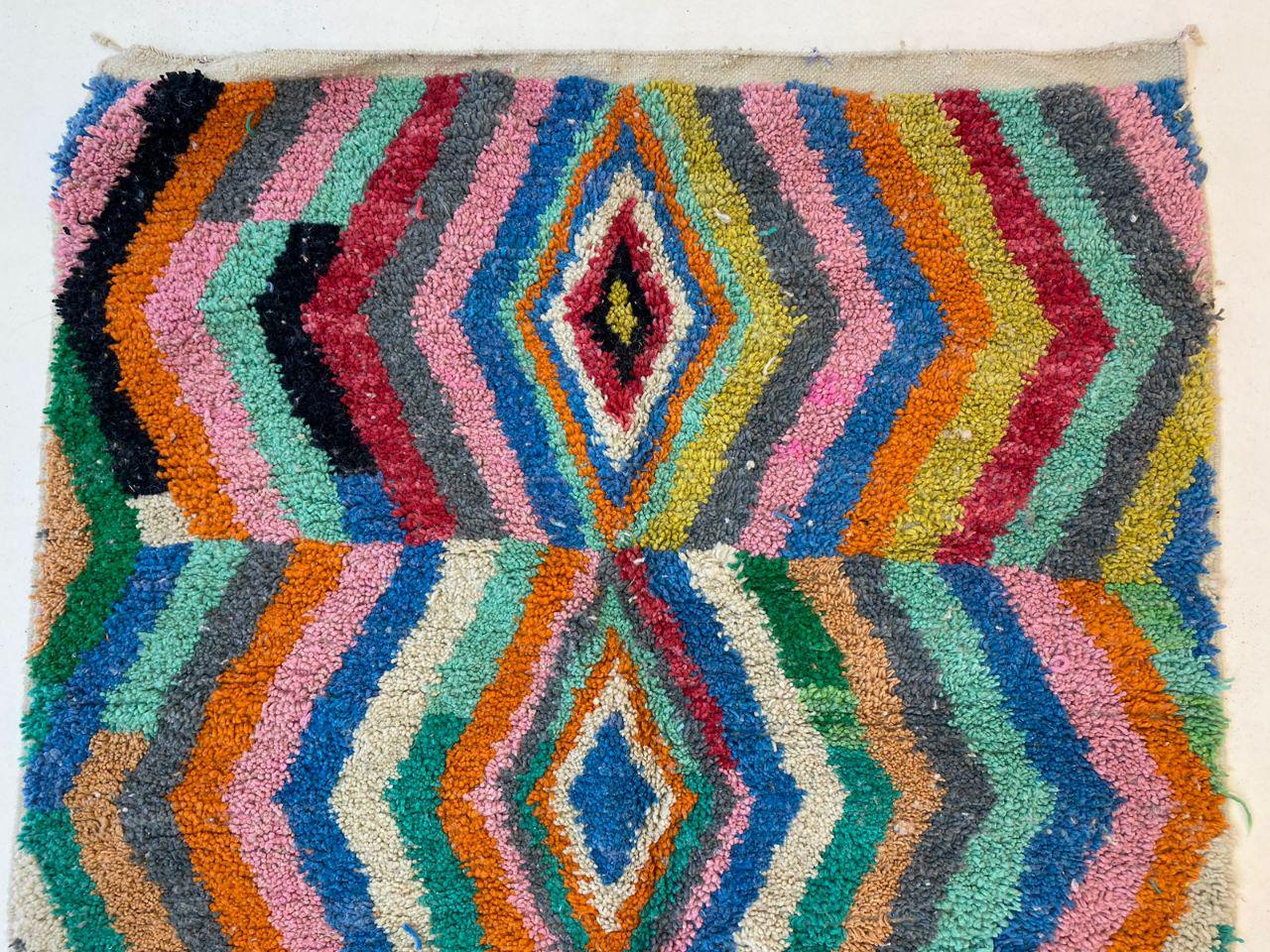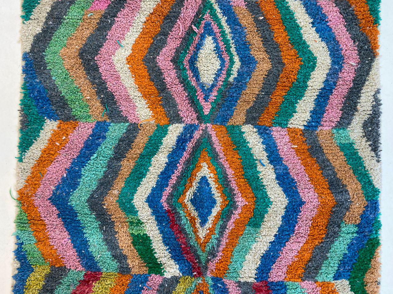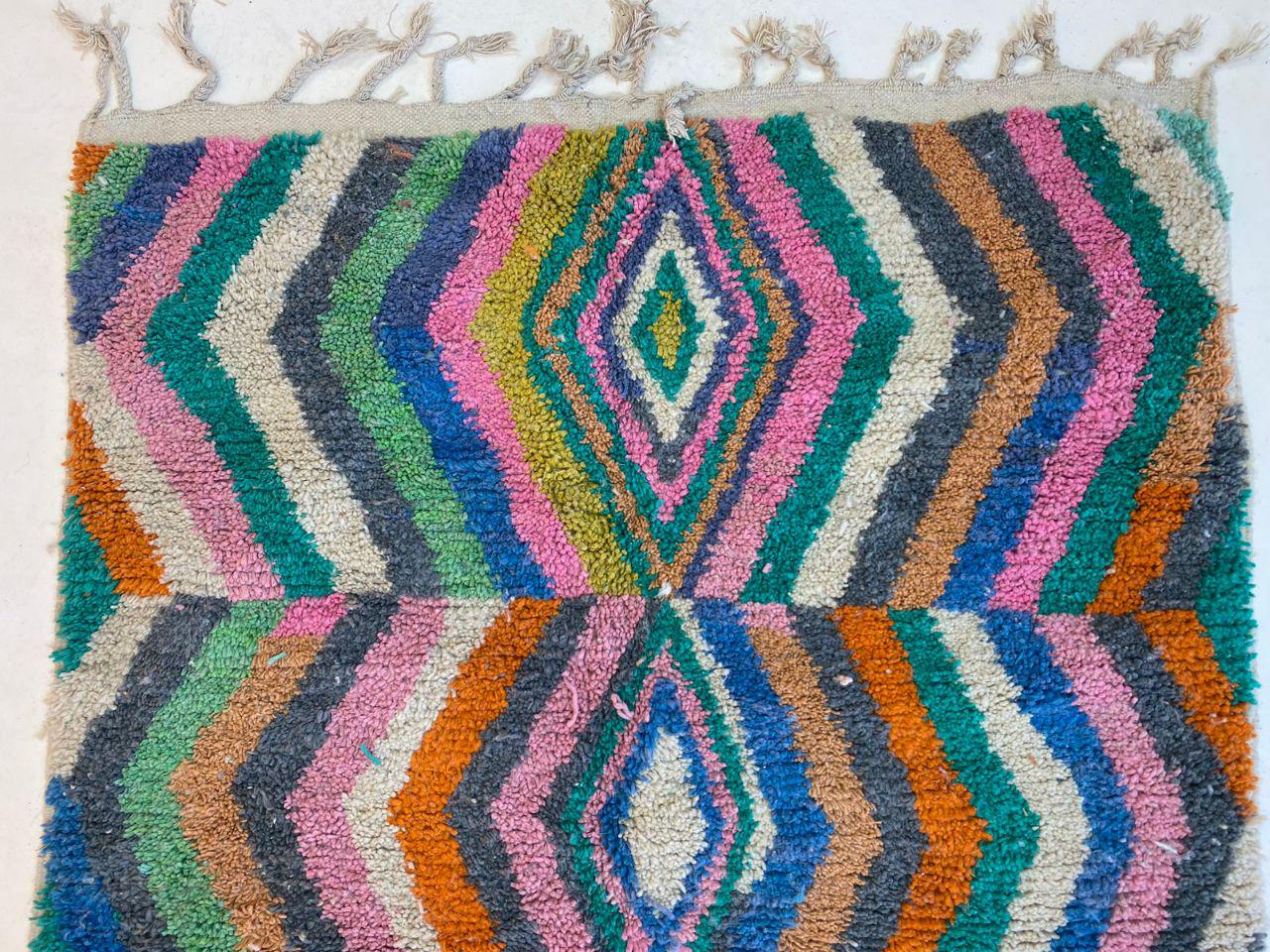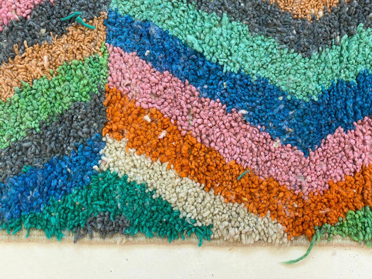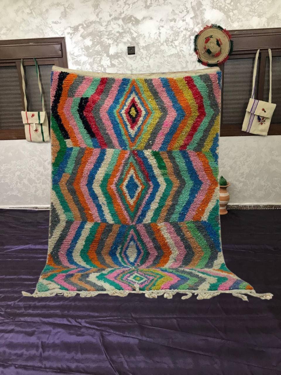 A Moroccan Berber Colorful rug is a traditional handwoven floor covering that originates from the indigenous Berber people of Morocco. These rugs are known for their intricate patterns and bold, geometric designs, which are created using a variety of natural dyes and High-quality Wool. Moroccan boujad rugs are versatile and can be used to add a touch of bohemian chic to any room, from a living room or bedroom to a home office or entryway. They are durable and easy to maintain, making them a practical choice for high-traffic areas. Whether you're looking to add a pop of color to your space or create a warm and welcoming atmosphere, a Moroccan Berber rug is a great choice.
