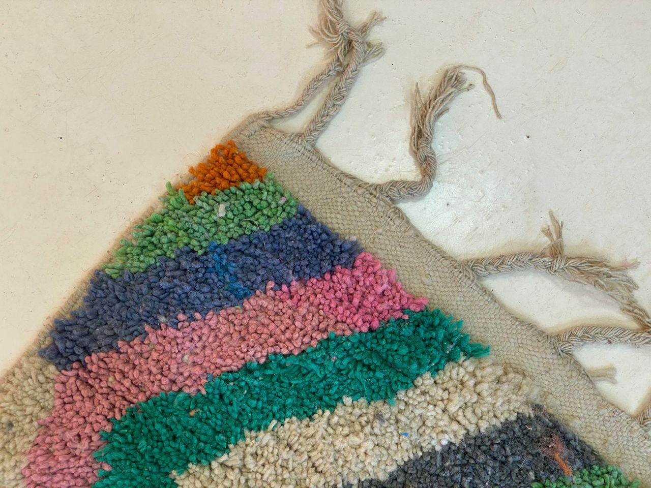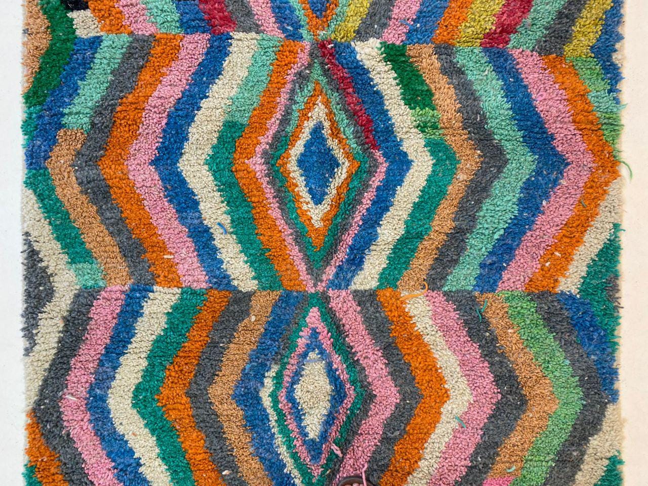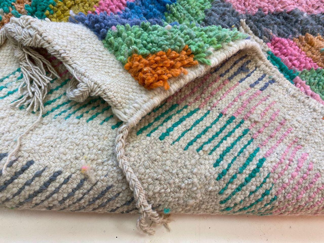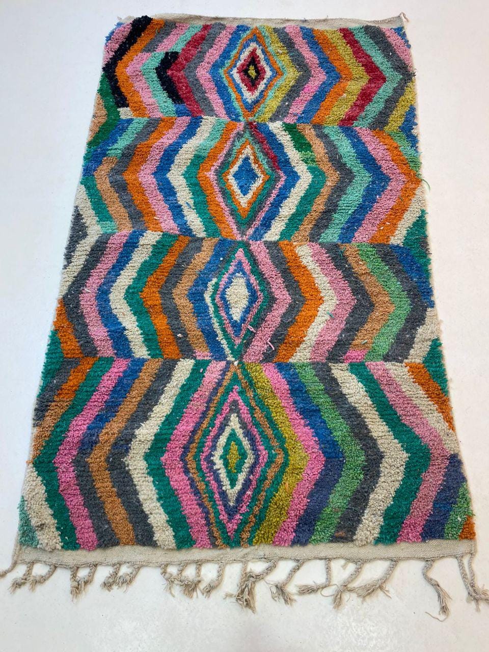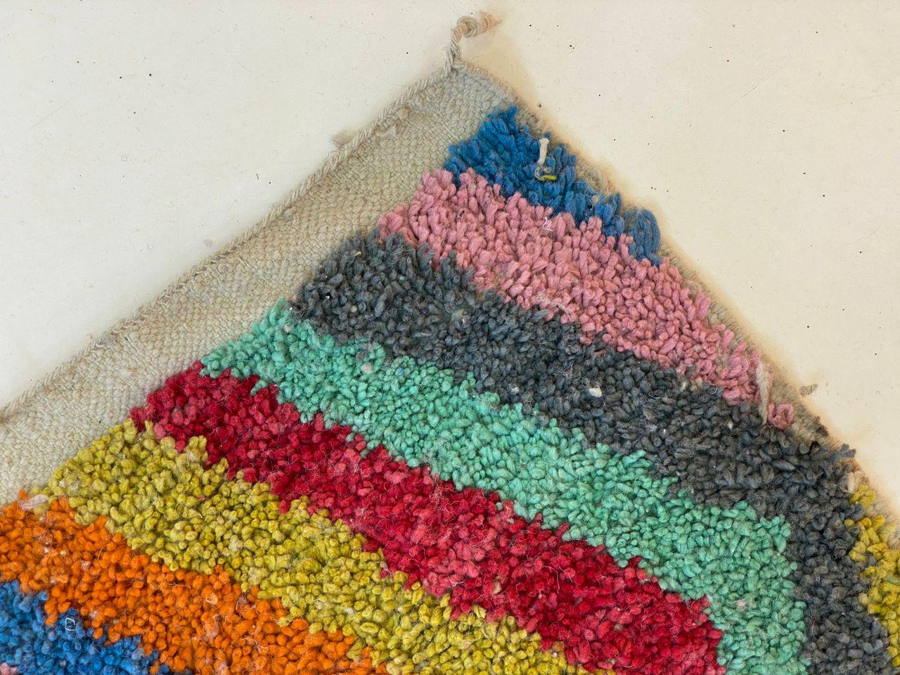 A Moroccan Berber Colorful rug is a traditional handwoven floor covering that originates from the indigenous Berber people of Morocco. These rugs are known for their intricate patterns and bold, geometric designs, which are created using a variety of natural dyes and High-quality Wool. Moroccan boujad rugs are versatile and can be used to add a touch of bohemian chic to any room, from a living room or bedroom to a home office or entryway. They are durable and easy to maintain, making them a practical choice for high-traffic areas. Whether you're looking to add a pop of color to your space or create a warm and welcoming atmosphere, a Moroccan Berber rug is a great choice.