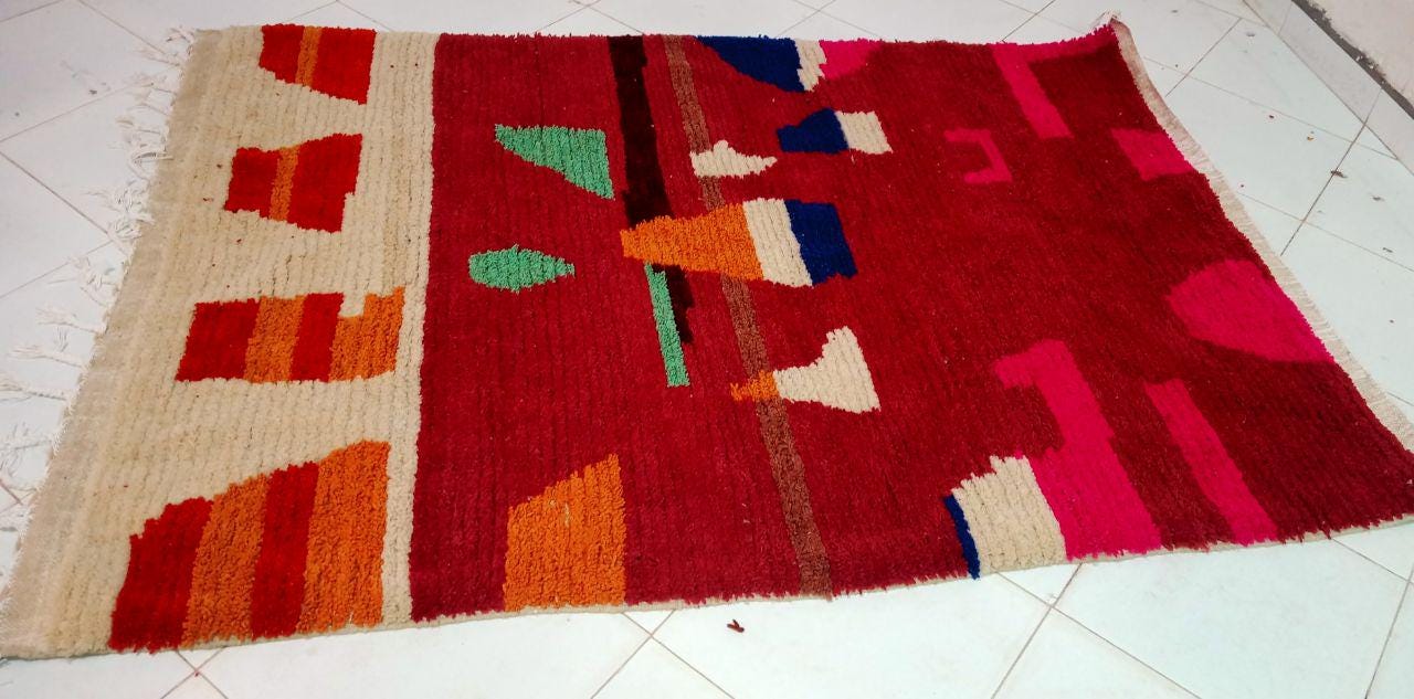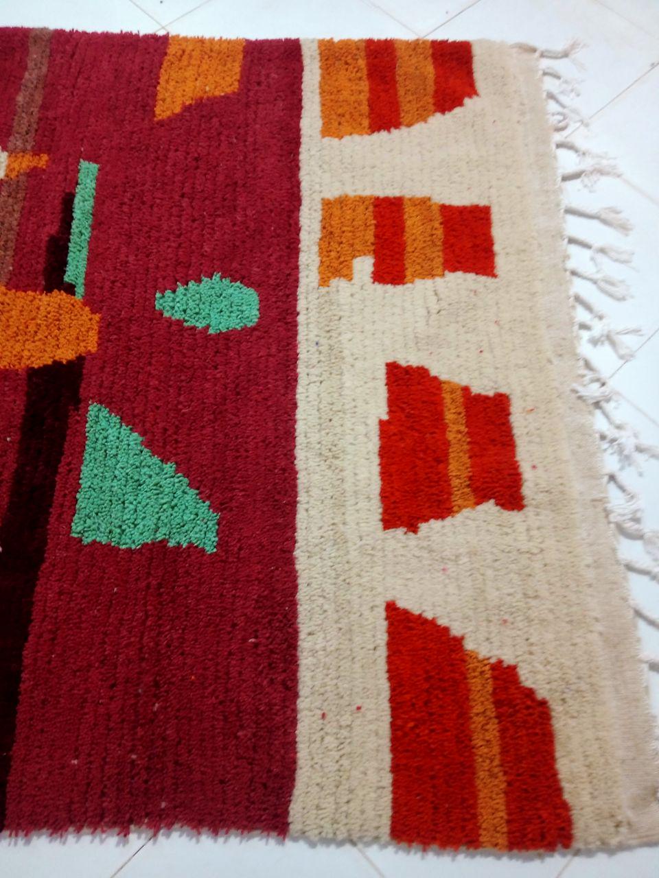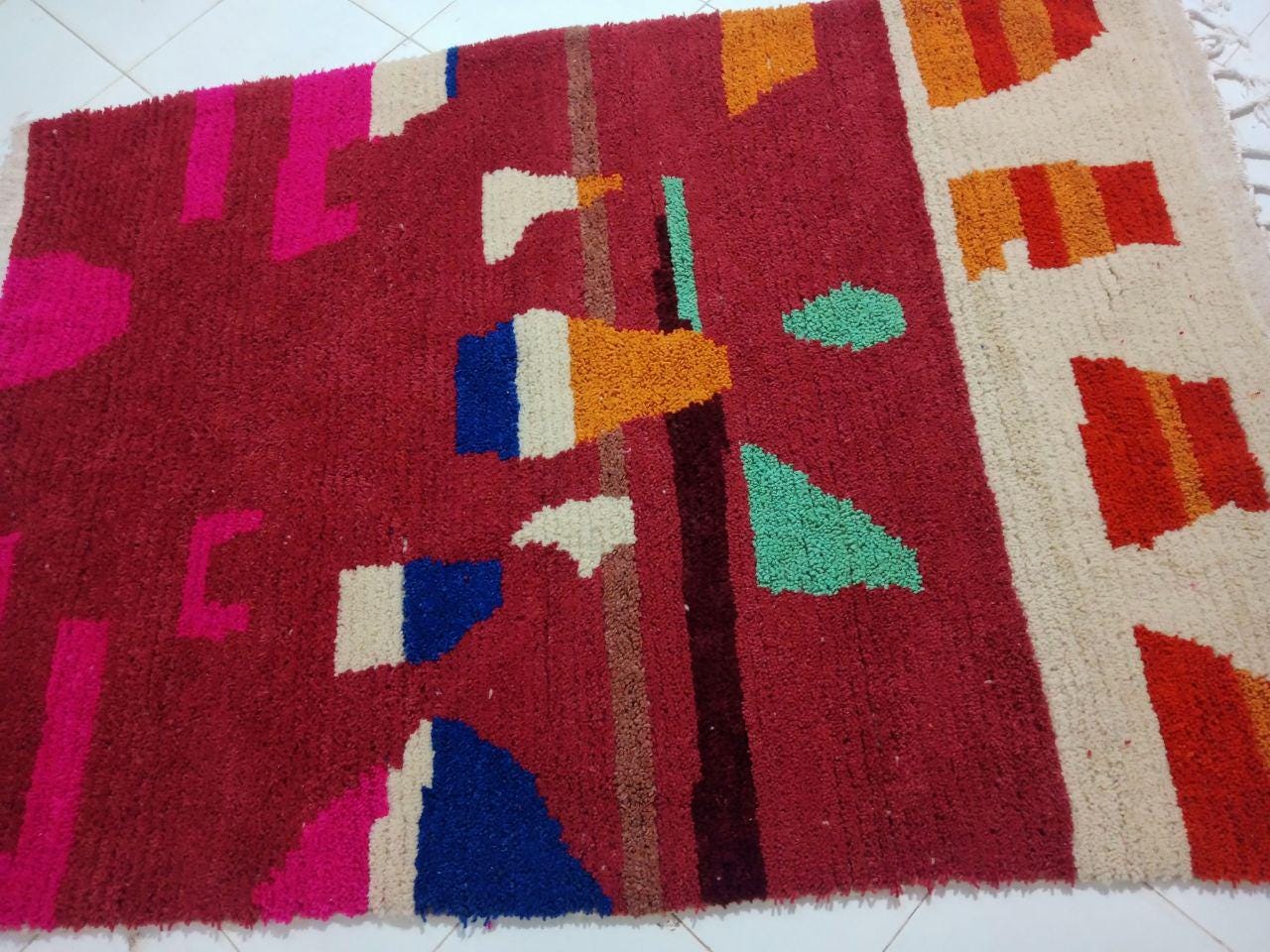 A Moroccan Berber Colorful rug is a traditional handwoven floor covering that originates from the indigenous Berber people of Morocco. These rugs are known for their intricate patterns and bold, geometric designs, which are created using a variety of natural dyes and High-quality Wool. Moroccan boujad rugs are versatile and can be used to add a touch of bohemian chic to any room, from a living room or bedroom to a home office or entryway. They are durable and easy to maintain, making them a practical choice for high-traffic areas. Whether you're looking to add a pop of color to your space or create a warm and welcoming atmosphere, a Moroccan Berber rug is a great choice. 📌 Shipping: insured, trackable, Fast, and FREE Worldwide by FedEx or DHL (2 to 5 days delivery). ❖ Cleaning: all rugs are carefully cleaned before shipping. ❖ Colors: Please take a look at the pictures. ❖ Texture: Moroccan / soft / Shag. ❖ Technique: Hand-Knotted ❖ Construction: Handmade ❖ Location: Indoor Use Only ❖ Material: Your order is made entirely by hand from natural wool, which means there will be natural (and beautiful) variations in pattern and color. Wool shrinks. ❖ Pattern: Because the product is handcrafted, the pattern and Colors may vary slightly from one piece to another. ❖ Size: While we try our best to ensure consistent sizing, it is possible for final sizes to vary by a few inches more or less. ❖ Tassels: One side is the Traditional way of making the rugs. 📌Ships tightly rolled in a protective bag. Any slight creasing will disappear within a few days. Shedding loose fibers is normal with new rugs. Shedding will diminish with regular vacuuming. If you have any questions or queries, please feel free to contact me via messages.