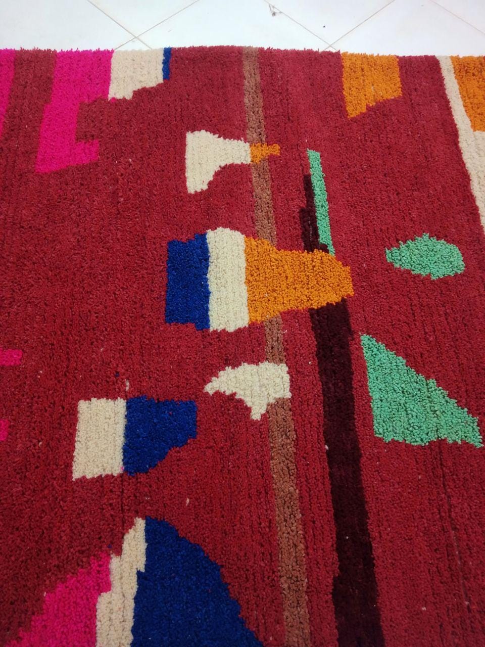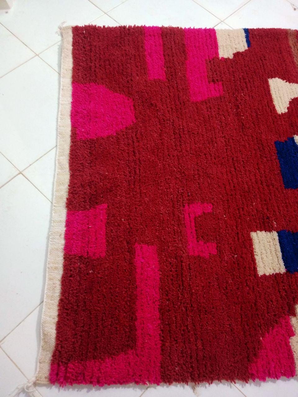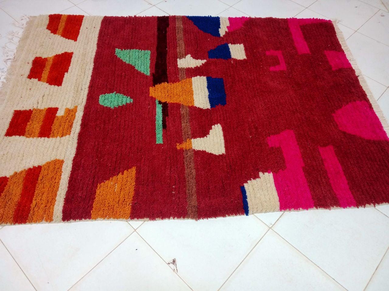 A Moroccan Berber Colorful rug is a traditional handwoven floor covering that originates from the indigenous Berber people of Morocco. These rugs are known for their intricate patterns and bold, geometric designs, which are created using a variety of natural dyes and High-quality Wool. Moroccan boujad rugs are versatile and can be used to add a touch of bohemian chic to any room, from a living room or bedroom to a home office or entryway. They are durable and easy to maintain, making them a practical choice for high-traffic areas. Whether you're looking to add a pop of color to your space or create a warm and welcoming atmosphere, a Moroccan Berber rug is a great choice. 📌 Shipping: insured, trackable, Fast, and FREE Worldwide by FedEx or DHL (2 to 5 days delivery). ❖ Cleaning: all rugs are carefully cleaned before shipping. ❖ Colors: Please take a look at the pictures. ❖ Texture: Moroccan / soft / Shag. ❖ Technique: Hand-Knotted ❖ Construction: Handmade ❖ Location: Indoor Use Only ❖ Material: Your order is made entirely by hand from natural wool, which means there will be natural (and beautiful) variations in pattern and color. Wool shrinks. ❖ Pattern: Because the product is handcrafted, the pattern and Colors may vary slightly from one piece to another. ❖ Size: While we try our best to ensure consistent sizing, it is possible for final sizes to vary by a few inches more or less. ❖ Tassels: One side is the Traditional way of making the rugs. 📌Ships tightly rolled in a protective bag. Any slight creasing will disappear within a few days. Shedding loose fibers is normal with new rugs. Shedding will diminish with regular vacuuming. If you have any questions or queries, please feel free to contact me via messages.