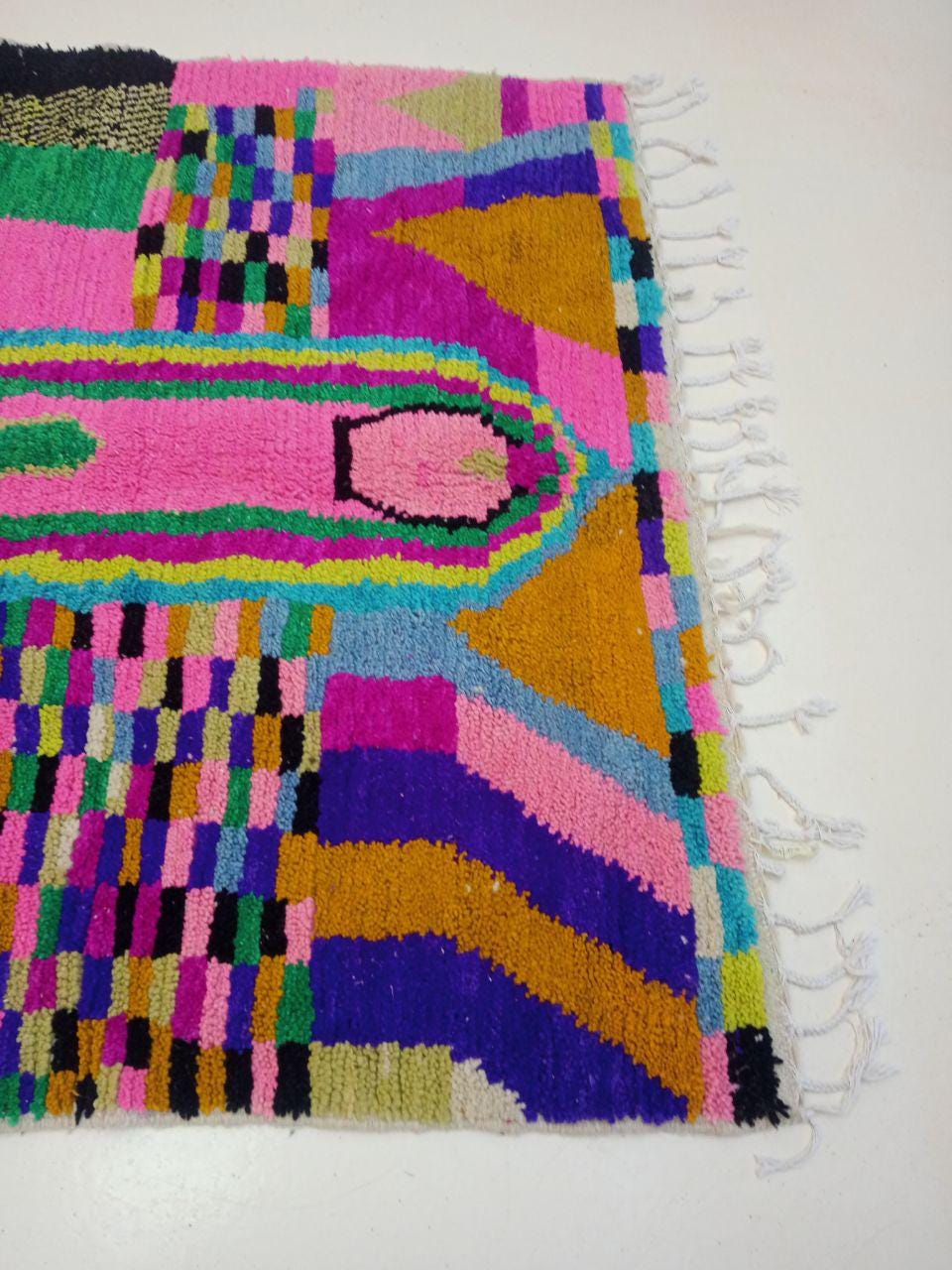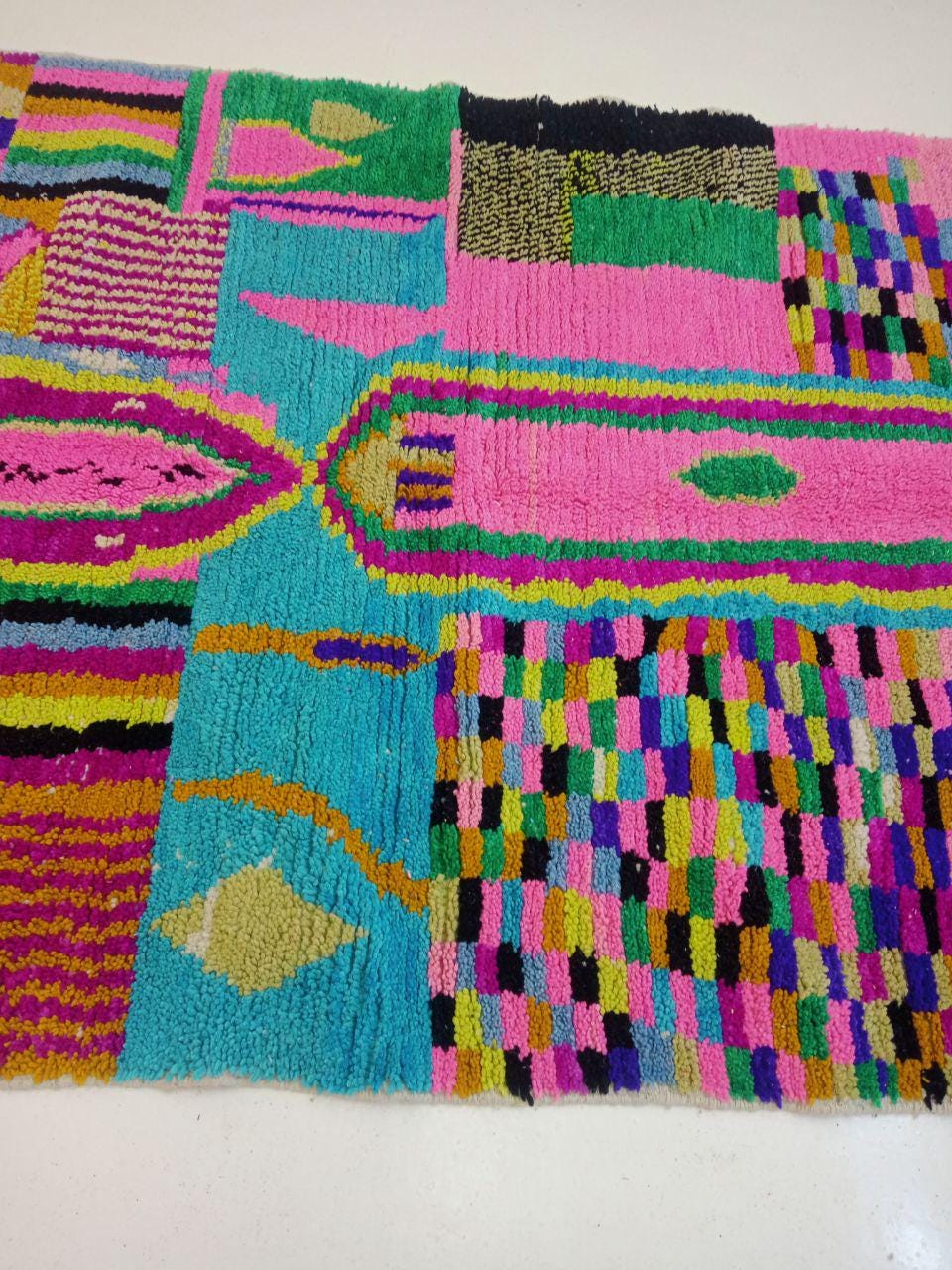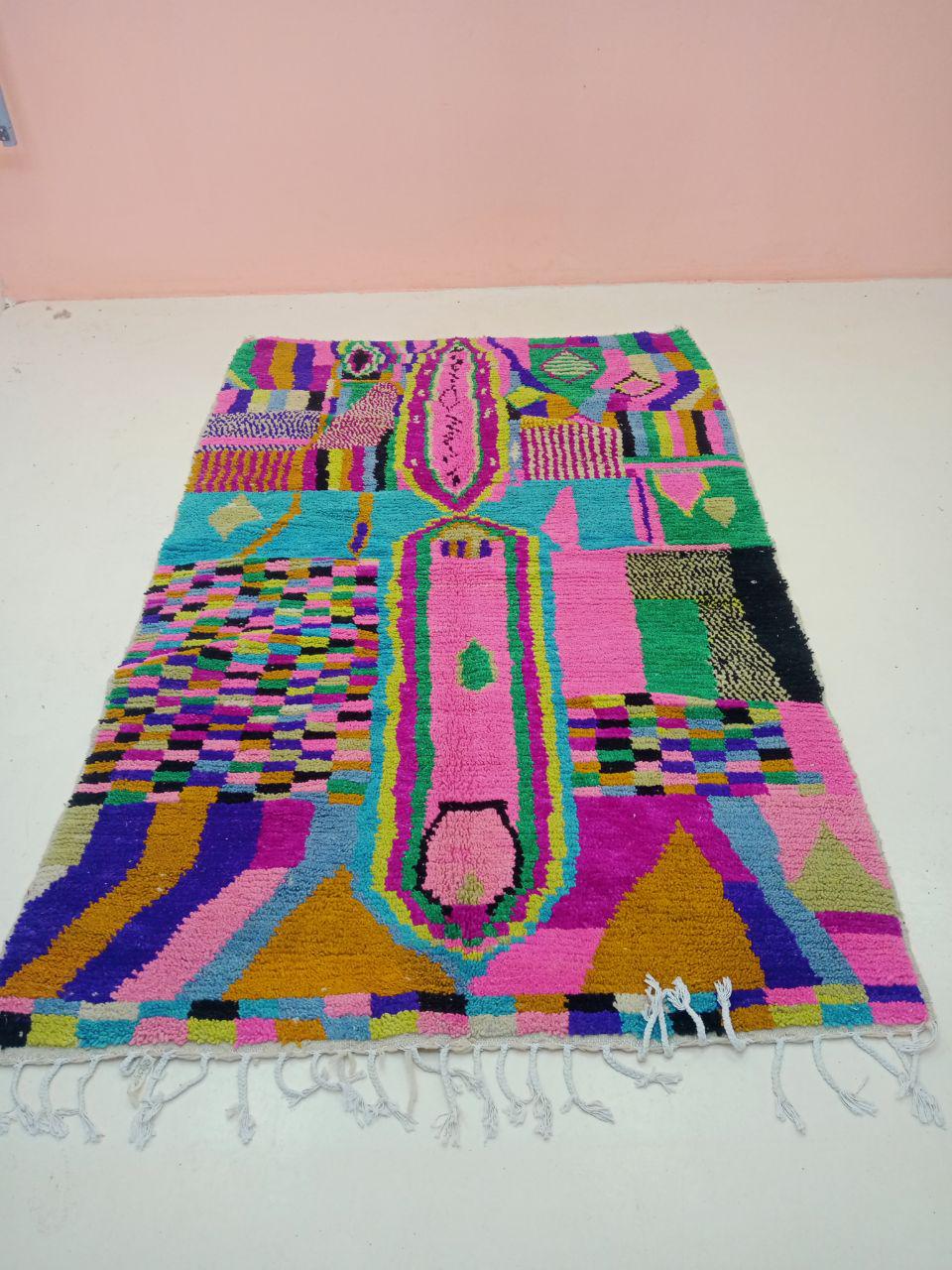 A Moroccan Berber Colorful rug is a traditional handwoven floor covering that originates from the indigenous Berber people of Morocco. These rugs are known for their intricate patterns and bold, geometric designs, which are created using a variety of natural dyes and High-quality Wool. Moroccan boujad rugs are versatile and can be used to add a touch of bohemian chic to any room, from a living room or bedroom to a home office or entryway. They are durable and easy to maintain, making them a practical choice for high-traffic areas. Whether you're looking to add a pop of color to your space or create a warm and welcoming atmosphere, a Moroccan Berber rug is a great choice. 📌 Shipping: insured, trackable, Fast, and FREE Worldwide by FedEx or DHL (2 to 5 days delivery). ❖ Cleaning: all rugs are carefully cleaned before shipping. ❖ Colors: Please take a look at the pictures. ❖ Texture: Moroccan / soft / Shag. ❖ Technique: Hand-Knotted ❖ Construction: Handmade ❖ Location: Indoor Use Only ❖ Material: Your order is made entirely by hand from natural wool, which means there will be natural (and beautiful) variations in pattern and color. Wool shrinks. ❖ Pattern: Because the product is handcrafted, the pattern and Colors may vary slightly from one piece to another. ❖ Size: While we try our best to ensure consistent sizing, it is possible for final sizes to vary by a few inches more or less. ❖ Tassels: One side is the Traditional way of making the rugs. 📌Ships tightly rolled in a protective bag. Any slight creasing will disappear within a few days. Shedding loose fibers is normal with new rugs. Shedding will diminish with regular vacuuming. If you have any questions or queries, please feel free to contact me via messages.