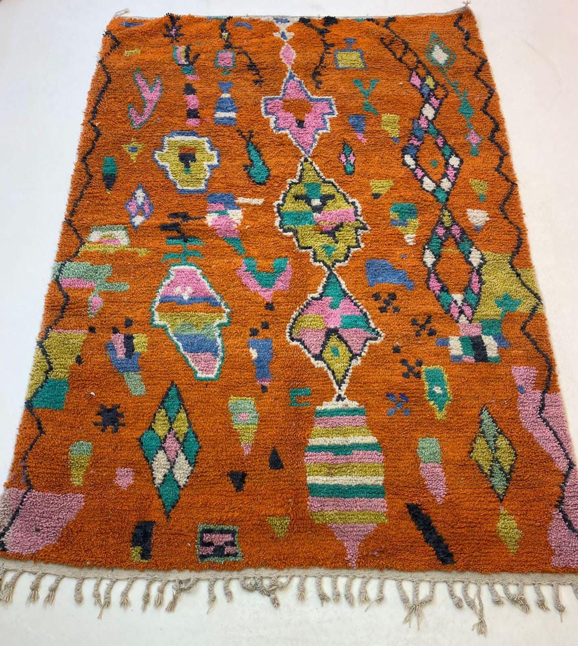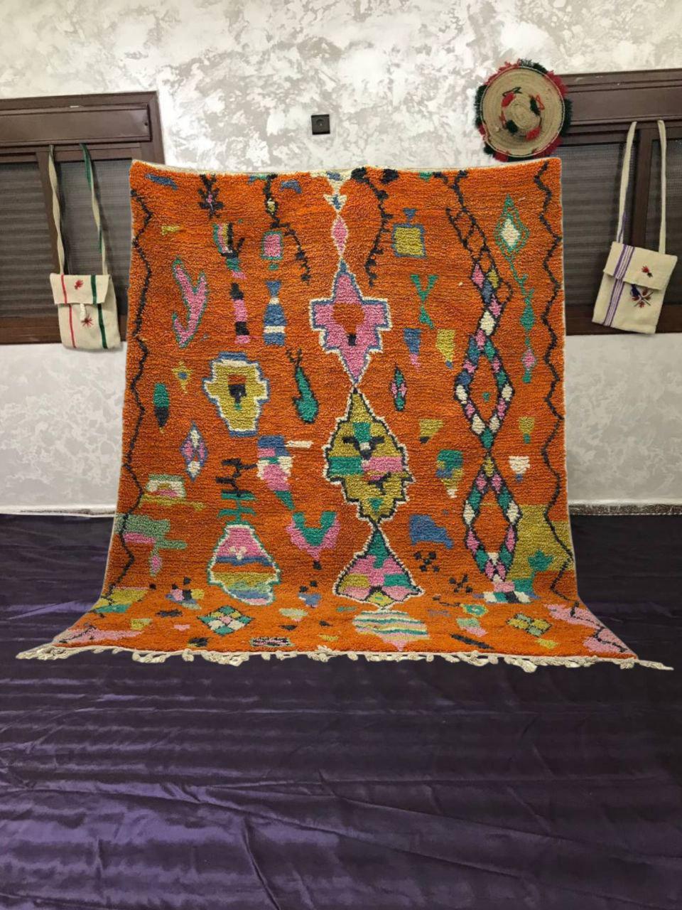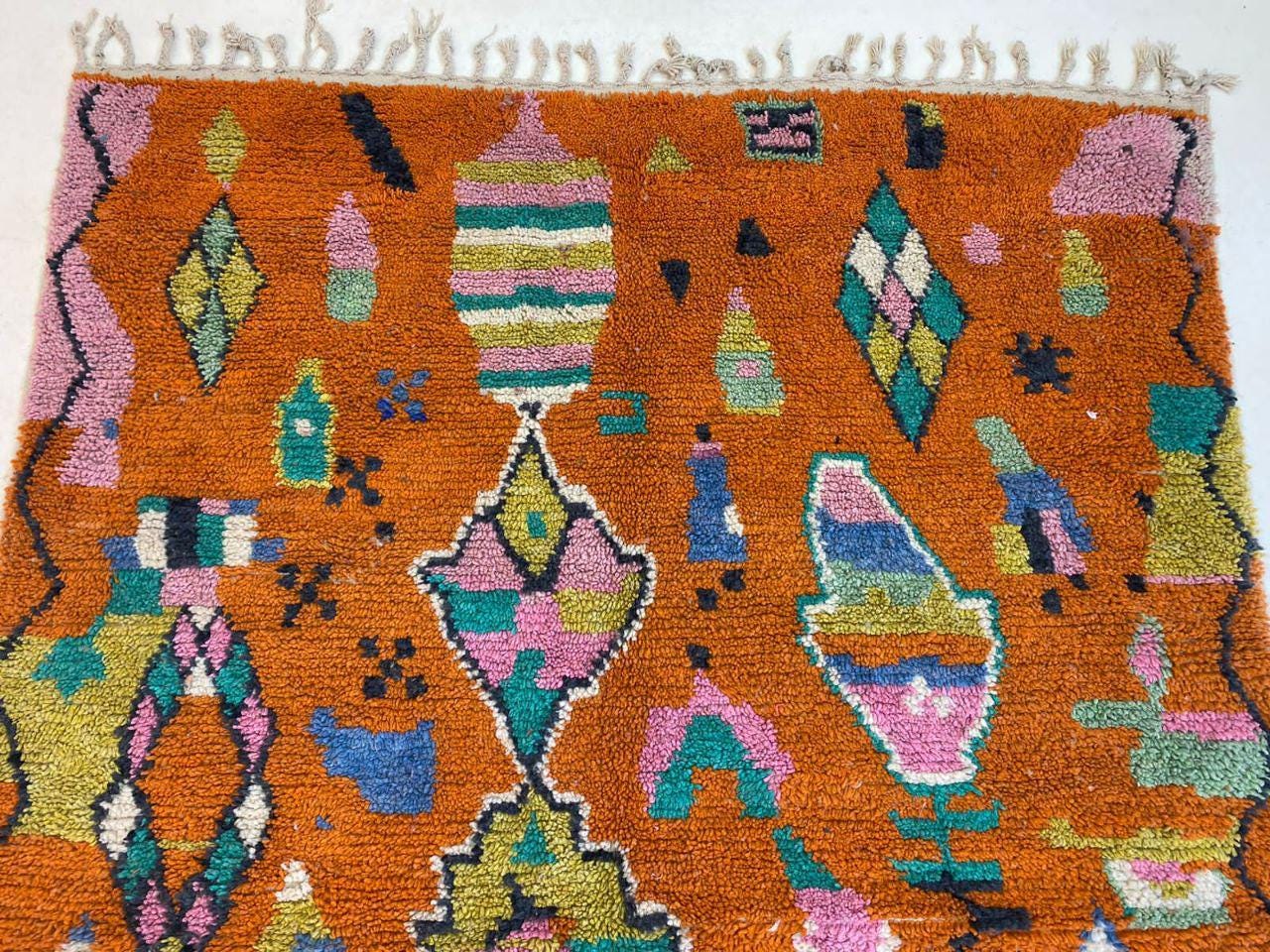 A Moroccan Berber Colorful rug is a traditional handwoven floor covering that originates from the indigenous Berber people of Morocco. These rugs are known for their intricate patterns and bold, geometric designs, which are created using a variety of natural dyes and High-quality Wool. Moroccan boujad rugs are versatile and can be used to add a touch of bohemian chic to any room, from a living room or bedroom to a home office or entryway. They are durable and easy to maintain, making them a practical choice for high-traffic areas. Whether you're looking to add a pop of color to your space or create a warm and welcoming atmosphere, a Moroccan Berber rug is a great choice. 📌 Shipping: insured, trackable, Fast, and FREE Worldwide by FedEx or DHL (2 to 5 days delivery). ❖ Cleaning: all rugs are carefully cleaned before shipping. ❖ Colors: Please take a look at the pictures. ❖ Texture: Moroccan / soft / Shag. ❖ Technique: Hand-Knotted ❖ Construction: Handmade ❖ Location: Indoor Use Only ❖ Material: Your order is made entirely by hand from natural wool, which means there will be natural (and beautiful) variations in pattern and color. Wool shrinks. ❖ Pattern: Because the product is handcrafted, the pattern and Colors may vary slightly from one piece to another. ❖ Size: While we try our best to ensure consistent sizing, it is possible for final sizes to vary by a few inches more or less. ❖ Tassels: One side is the Traditional way of making the rugs. 📌Ships tightly rolled in a protective bag. Any slight creasing will disappear within a few days. Shedding loose fibers is normal with new rugs. Shedding will diminish with regular vacuuming. If you have any questions or queries, please feel free to contact me via messages. orange rug moroccan,rug orange,authentik rug ,carpet orange 12x14