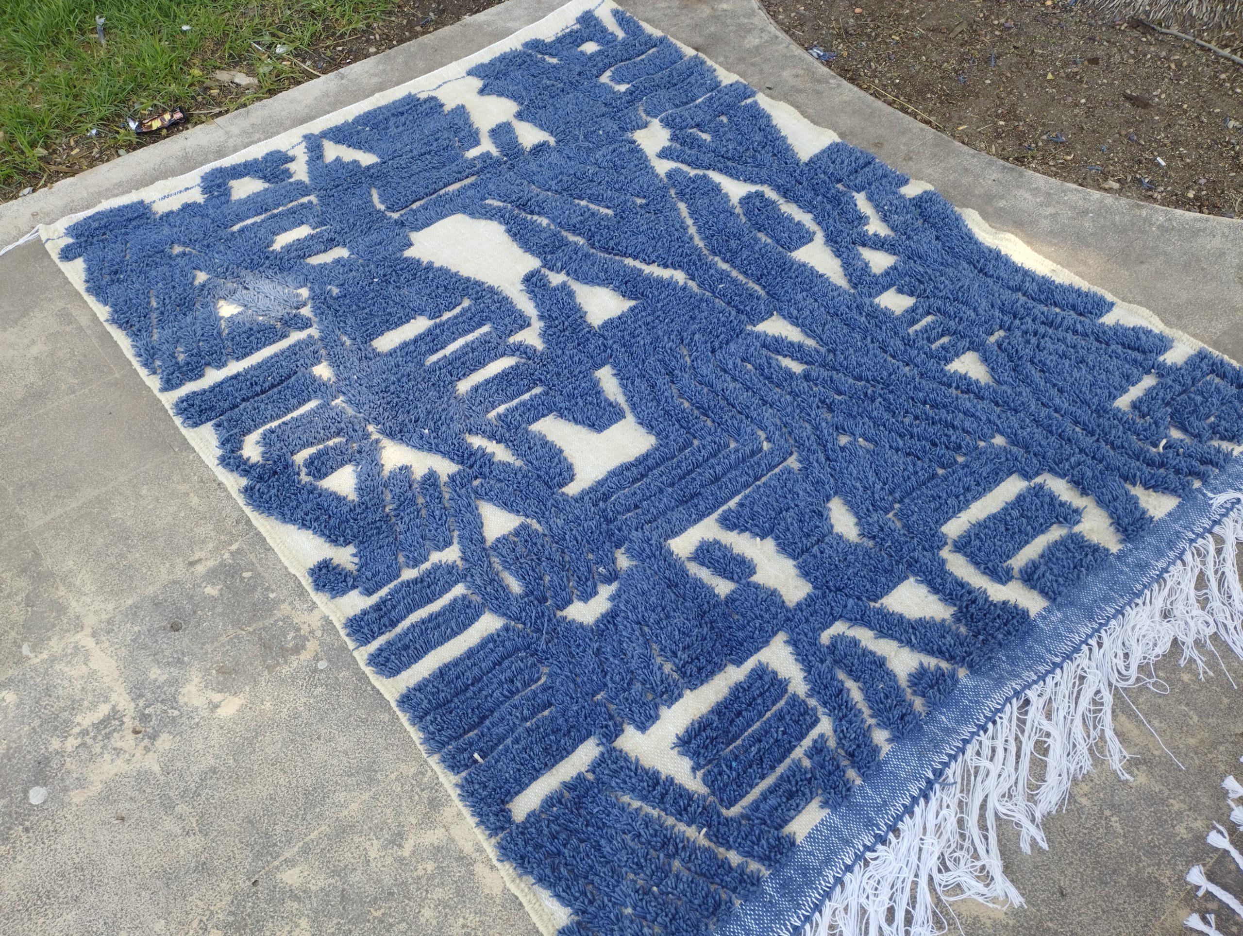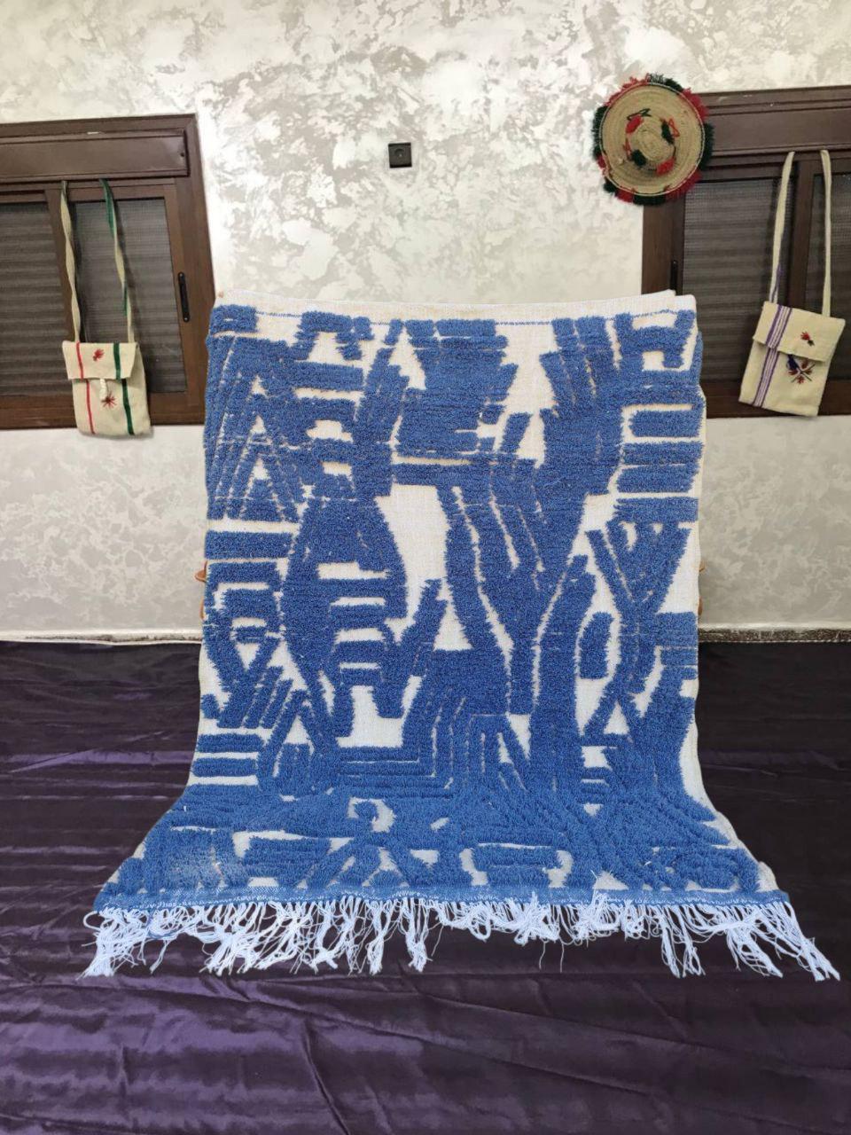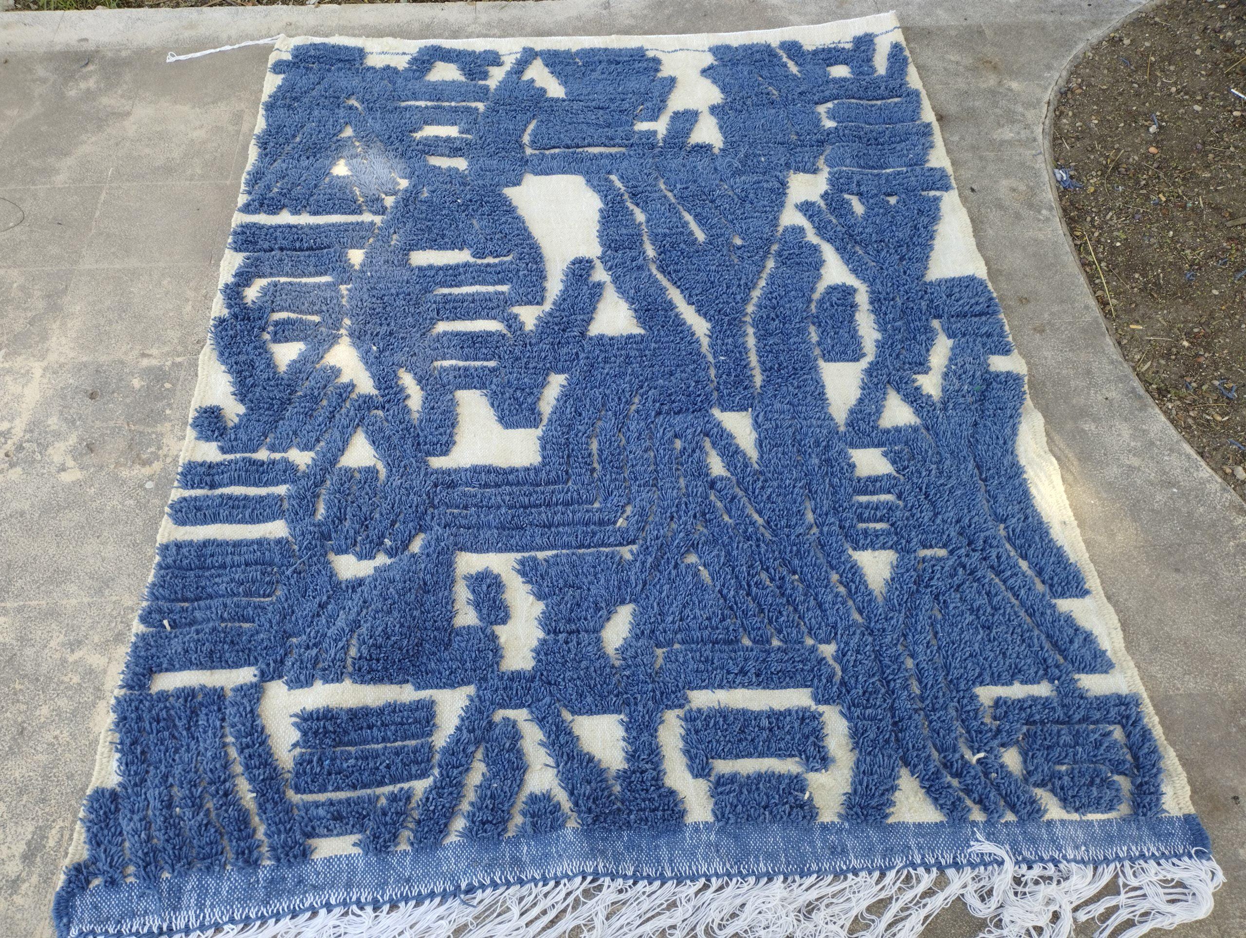 A Moroccan Berber Colorful rug is a traditional handwoven floor covering that originates from the indigenous Berber people of Morocco. These rugs are known for their intricate patterns and bold, geometric designs, which are created using a variety of natural dyes and High-quality Wool. Moroccan boujad rugs are versatile and can be used to add a touch of bohemian chic to any room, from a living room or bedroom to a home office or entryway. They are durable and easy to maintain, making them a practical choice for high-traffic areas. Whether you're looking to add a pop of color to your space or create a warm and welcoming atmosphere, a Moroccan Berber rug is a great choice. 📌 Shipping: insured, trackable, Fast, and FREE Worldwide by FedEx or DHL (2 to 5 days delivery). ❖ Cleaning: all rugs are carefully cleaned before shipping. ❖ Colors: Please take a look at the pictures. ❖ Texture: Moroccan / soft / Shag. ❖ Technique: Hand-Knotted ❖ Construction: Handmade ❖ Location: Indoor Use Only ❖ Material: Your order is made entirely by hand from natural wool, which means there will be natural (and beautiful) variations in pattern and color. Wool shrinks. ❖ Pattern: Because the product is handcrafted, the pattern and Colors may vary slightly from one piece to another. ❖ Size: While we try our best to ensure consistent sizing, it is possible for final sizes to vary by a few inches more or less. ❖ Tassels: One side is the Traditional way of making the rugs. 📌Ships tightly rolled in a protective bag. Any slight creasing will disappear within a few days. Shedding loose fibers is normal with new rugs. Shedding will diminish with regular vacuuming. If you have any questions or queries, please feel free to contact me via messages. handtufted beni ourain rug blue,gorgeous indigo blue rug,luxurious handwoven wool rug blue
