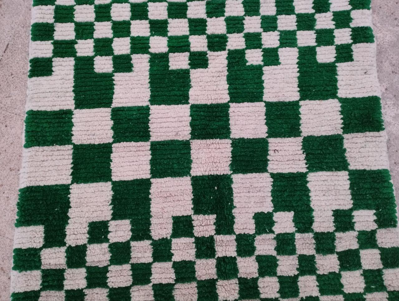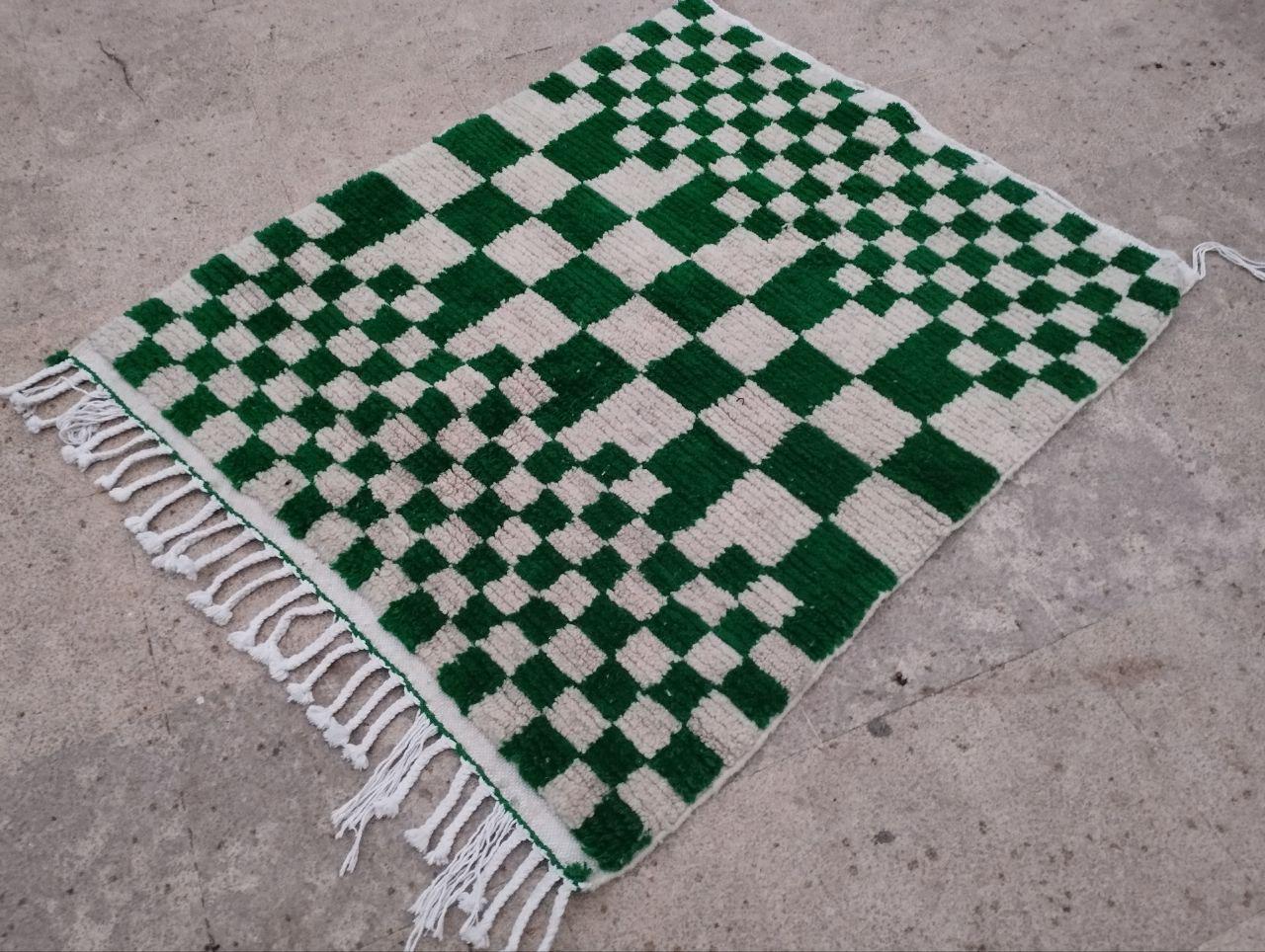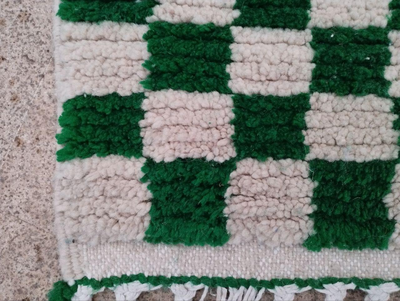 Handmade checkered wool green rug: Bohemian green abstract design, checkerboard carpet style.