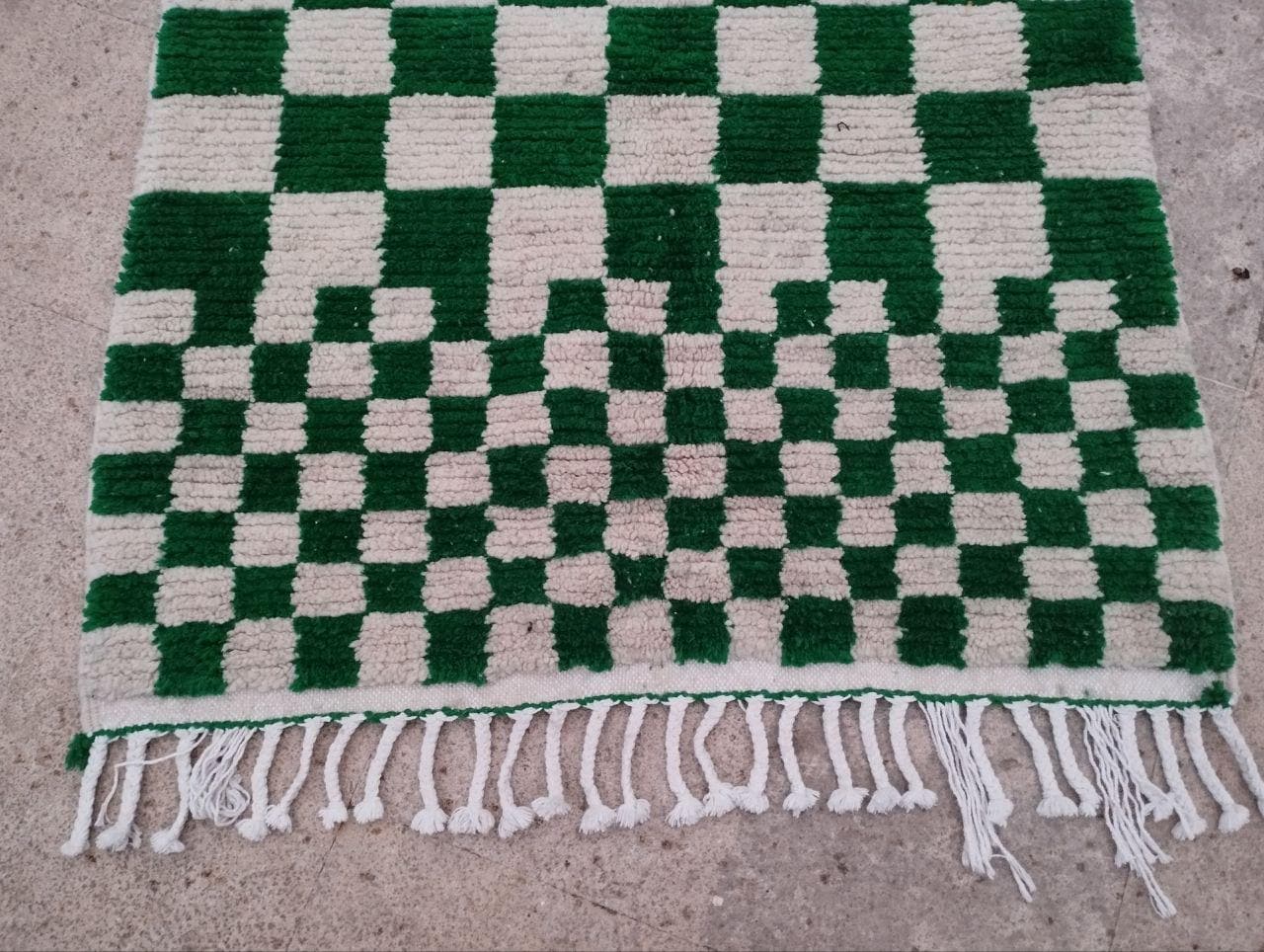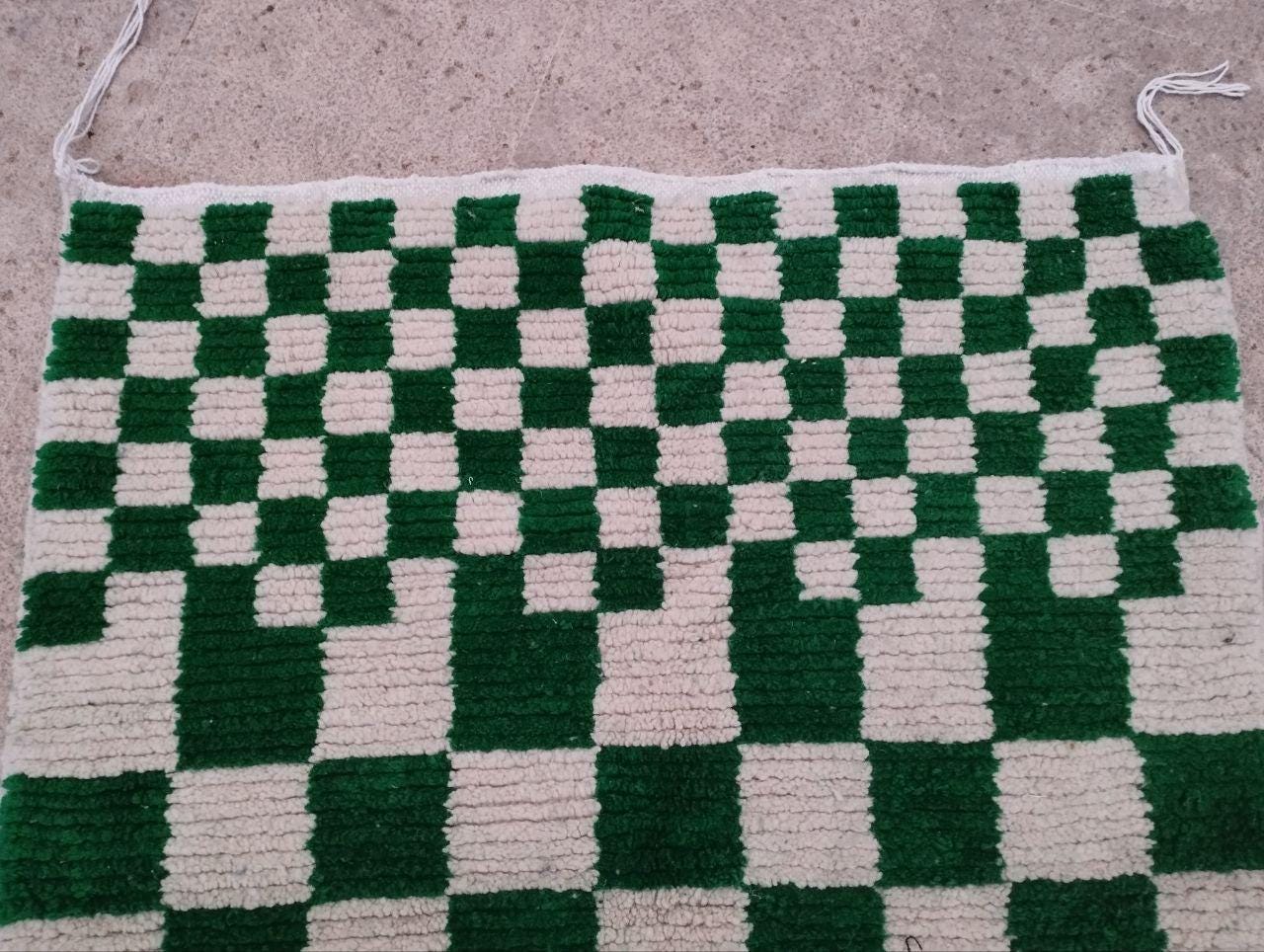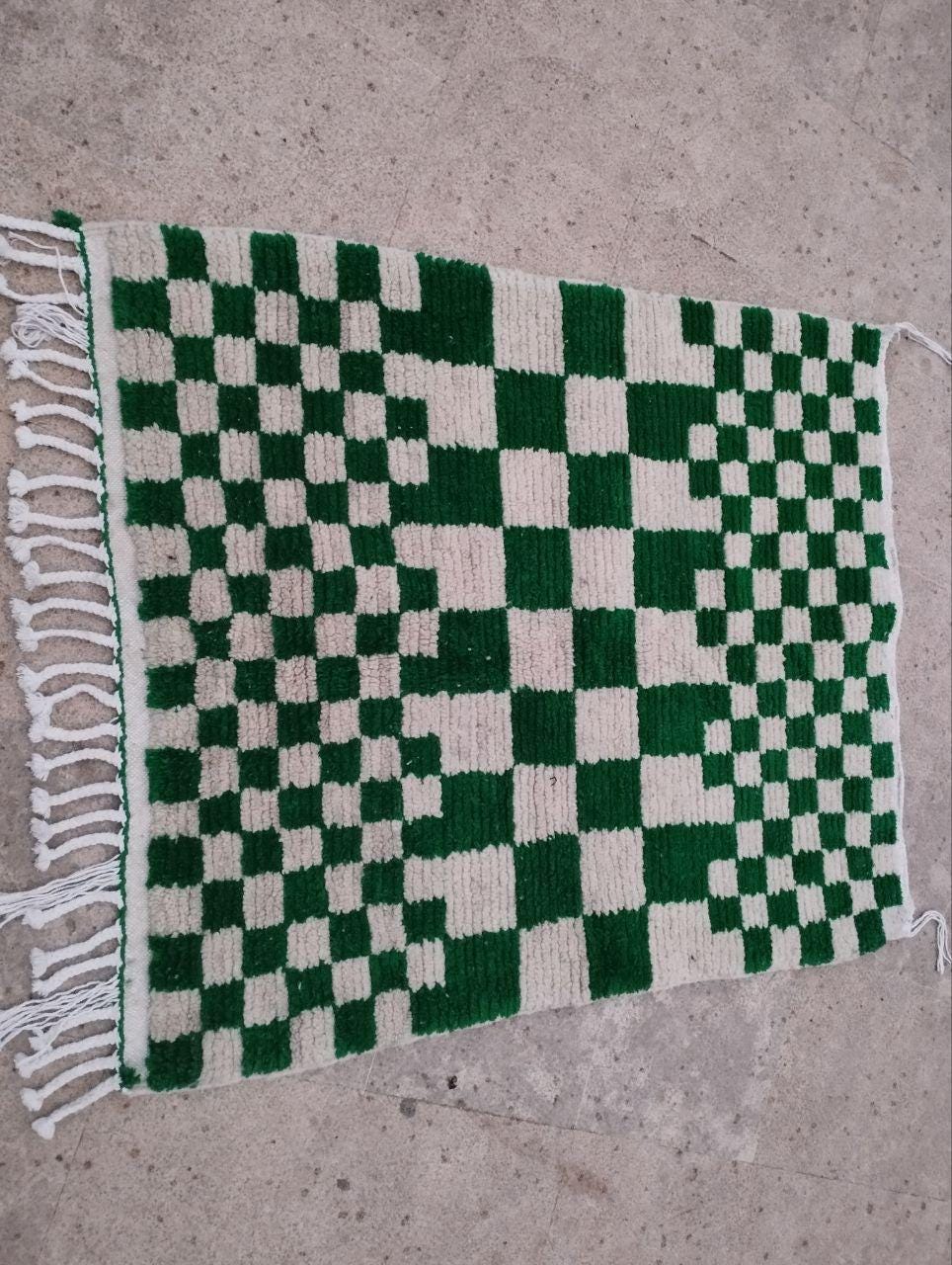 Handmade checkered wool green rug: Bohemian green abstract design, checkerboard carpet style.