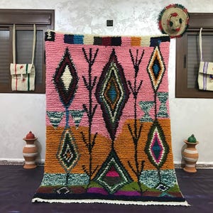 A Moroccan Berber Colorful rug is a traditional handwoven floor covering that originates from the indigenous Berber people of Morocco. These rugs are known for their intricate patterns and bold, geometric designs, which are created using a variety of natural dyes and High-quality Wool. Moroccan boujad rugs are versatile and can be used to add a touch of bohemian chic to any room, from a living room or bedroom to a home office or entryway. They are durable and easy to maintain, making them a practical choice for high-traffic areas. Whether you're looking to add a pop of color to your space or create a warm and welcoming atmosphere, a Moroccan Berber rug is a great choice. 📌 Shipping: insured, trackable, Fast, and FREE Worldwide by FedEx or DHL (2 to 5 days delivery). ❖ Cleaning: all rugs are carefully cleaned before shipping. ❖ Colors: Please take a look at the pictures. ❖ Texture: Moroccan / soft / Shag. ❖ Technique: Hand-Knotted ❖ Construction: Handmade ❖ Location: Indoor Use Only ❖ Material: Your order is made entirely by hand from natural wool, which means there will be natural (and beautiful) variations in pattern and color. Wool shrinks. ❖ Pattern: Because the product is handcrafted, the pattern and Colors may vary slightly from one piece to another. ❖ Size: While we try our best to ensure consistent sizing, it is possible for final sizes to vary by a few inches more or less. ❖ Tassels: One side is the Traditional way of making the rugs. 📌Ships tightly rolled in a protective bag. Any slight creasing will disappear within a few days. Shedding loose fibers is normal with new rugs. Shedding will diminish with regular vacuuming. If you have any questions or queries, please feel free to contact me via messages.