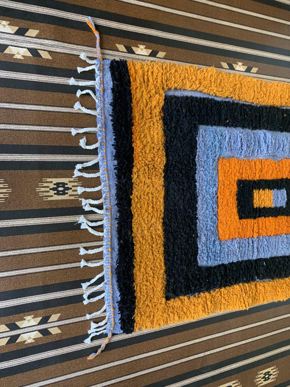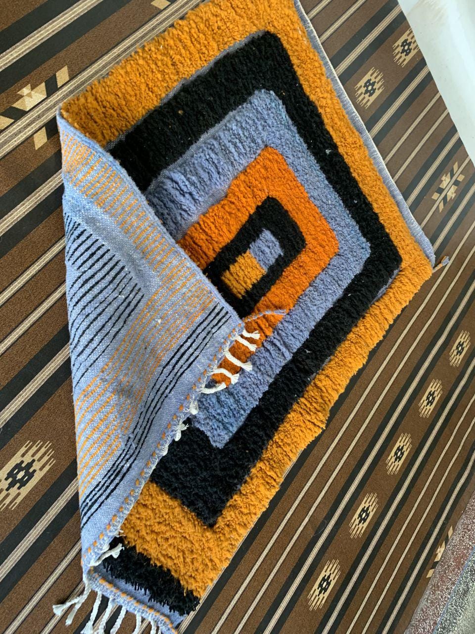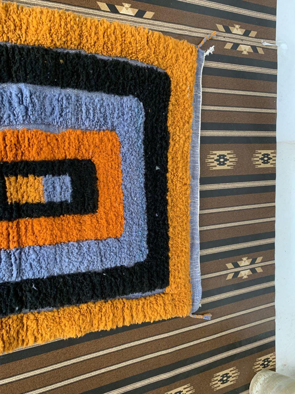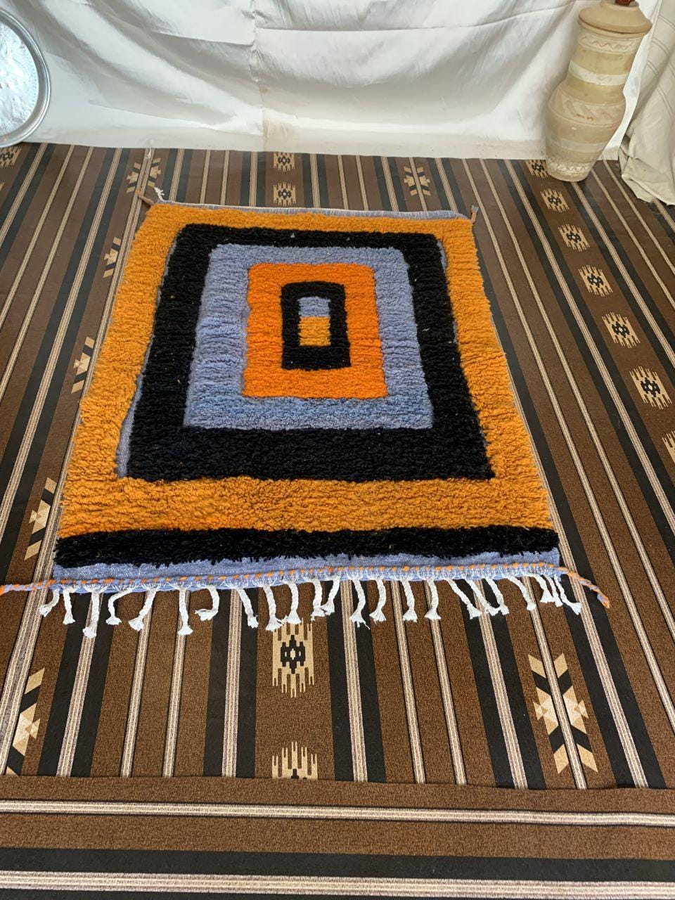 A Moroccan Berber Colorful rug is a traditional handwoven floor covering that originates from the indigenous Berber people of Morocco. These rugs are known for their intricate patterns and bold, geometric designs, which are created using a variety of natural dyes and High-quality Wool. Moroccan boujad rugs are versatile and can be used to add a touch of bohemian chic to any room, from a living room or bedroom to a home office or entryway. They are durable and easy to maintain, making them a practical choice for high-traffic areas. Whether you're looking to add a pop of color to your space or create a warm and welcoming atmosphere, a Moroccan Berber rug is a great choice. 📌 Shipping: insured, trackable, Fast, and FREE Worldwide by FedEx or DHL (2 to 5 days delivery). ❖ Cleaning: all rugs are carefully cleaned before shipping. ❖ Colors: Please take a look at the pictures. ❖ Texture: Moroccan / soft / Shag. ❖ Technique: Hand-Knotted ❖ Construction: Handmade ❖ Location: Indoor Use Only ❖ Material: Your order is made entirely by hand from natural wool, which means there will be natural (and beautiful) variations in pattern and color. Wool shrinks. ❖ Pattern: Because the product is handcrafted, the pattern and Colors may vary slightly from one piece to another. ❖ Size: While we try our best to ensure consistent sizing, it is possible for final sizes to vary by a few inches more or less. ❖ Tassels: One side is the Traditional way of making the rugs. 📌Ships tightly rolled in a protective bag. Any slight creasing will disappear within a few days. Shedding loose fibers is normal with new rugs. Shedding will diminish with regular vacuuming. If you have any questions or queries, please feel free to contact me via messages. moroccan handmade rug orange and black,rug for living room hand moroccan ,colourful boujaad berber rug