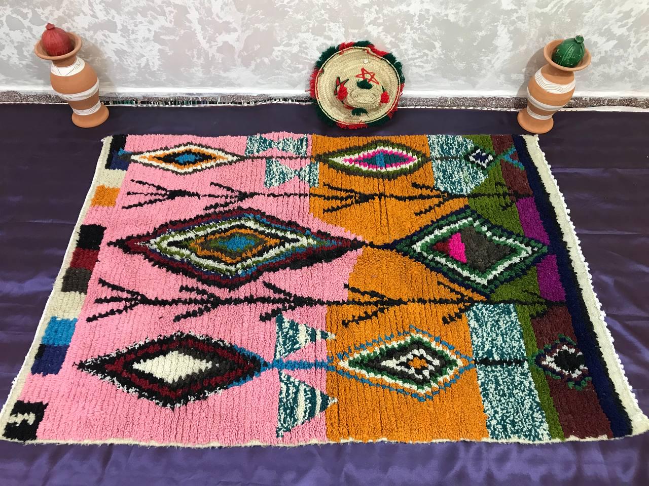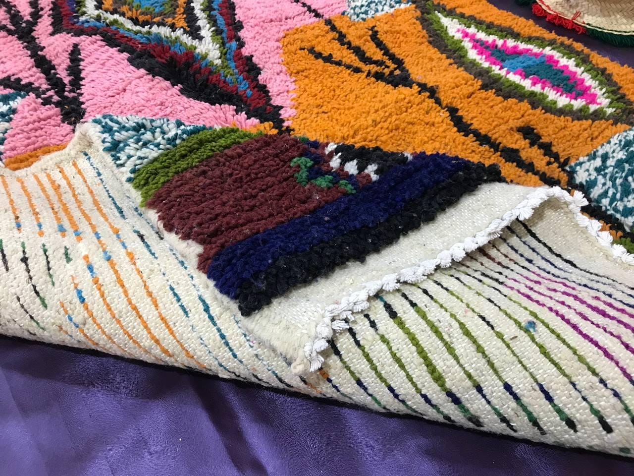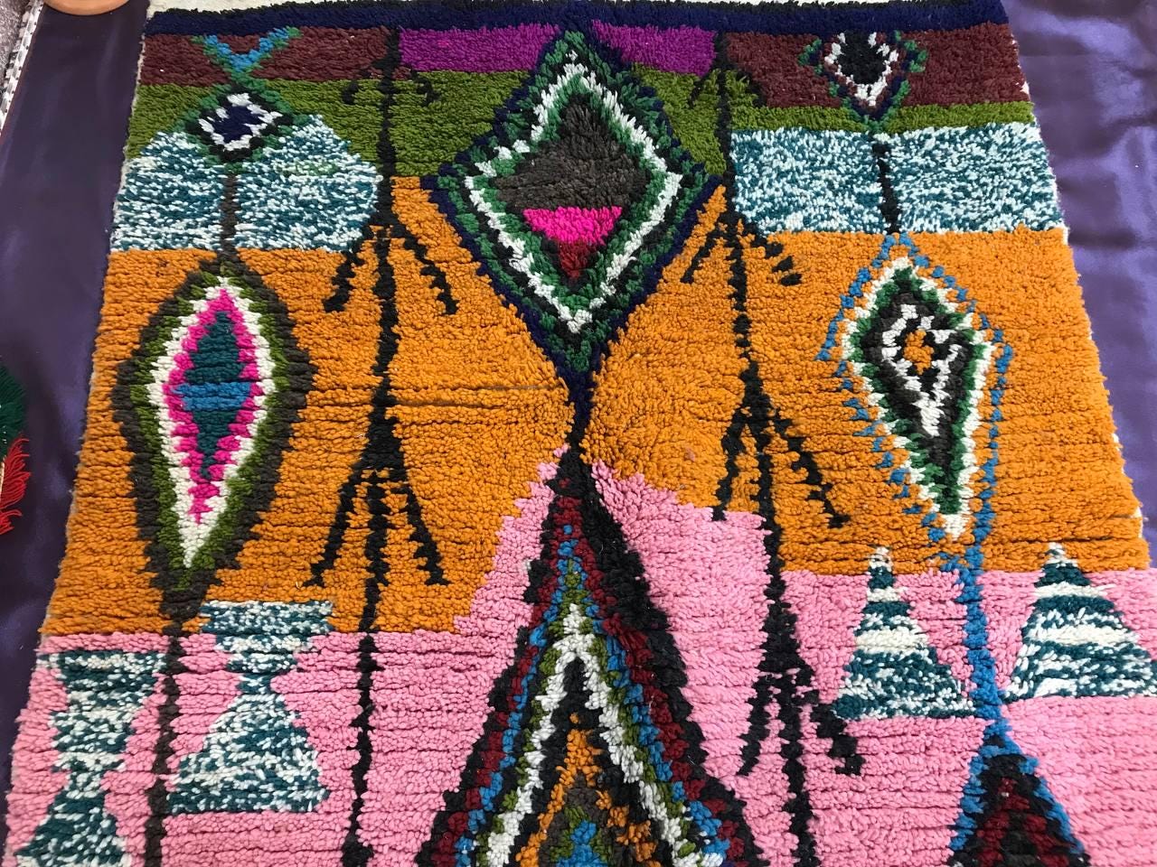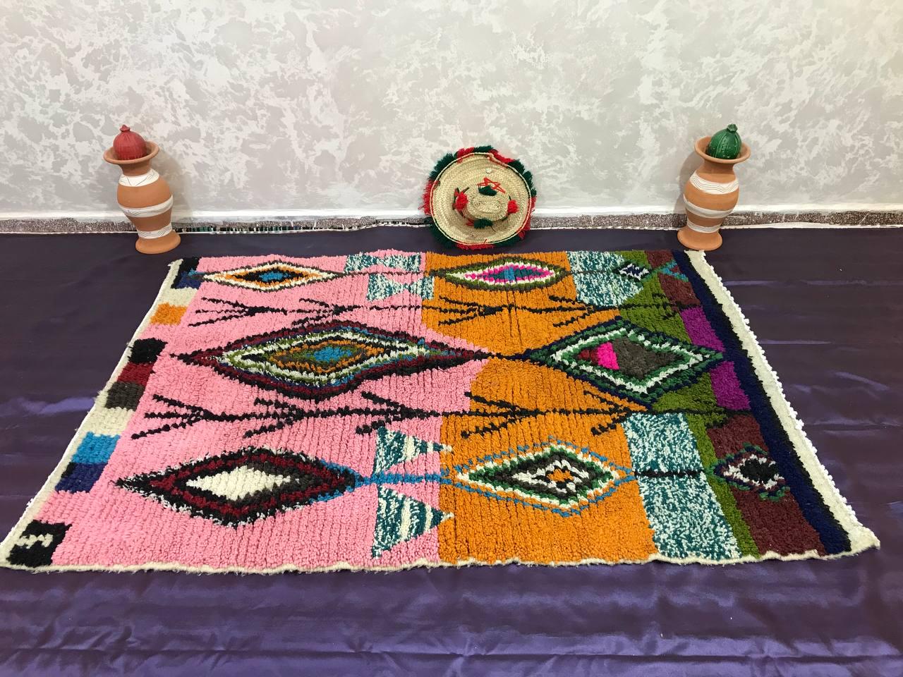 A Moroccan Berber Colorful rug is a traditional handwoven floor covering that originates from the indigenous Berber people of Morocco. These rugs are known for their intricate patterns and bold, geometric designs, which are created using a variety of natural dyes and High-quality Wool. Moroccan boujad rugs are versatile and can be used to add a touch of bohemian chic to any room, from a living room or bedroom to a home office or entryway. They are durable and easy to maintain, making them a practical choice for high-traffic areas. Whether you're looking to add a pop of color to your space or create a warm and welcoming atmosphere, a Moroccan Berber rug is a great choice.