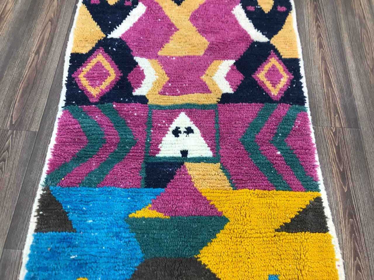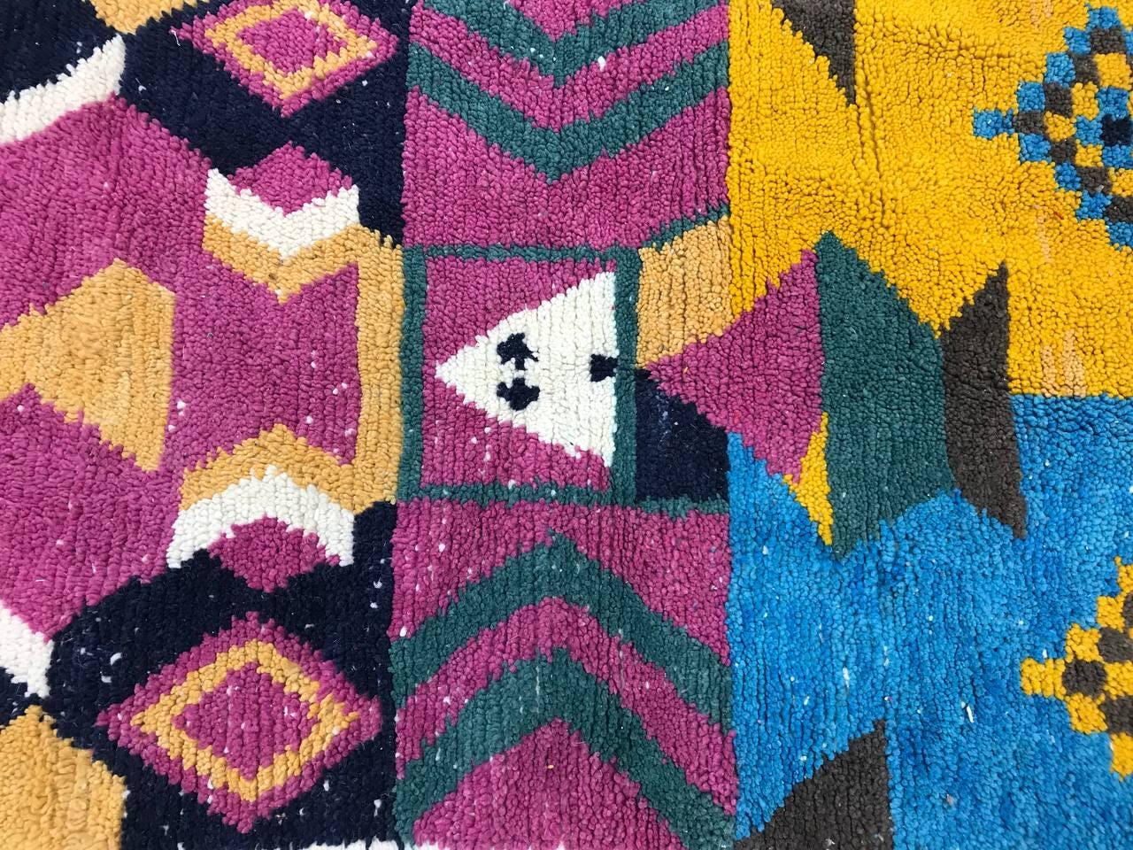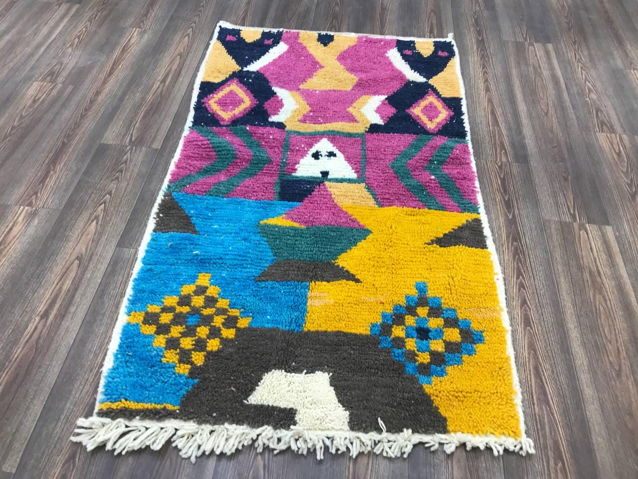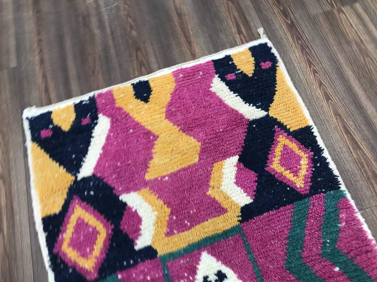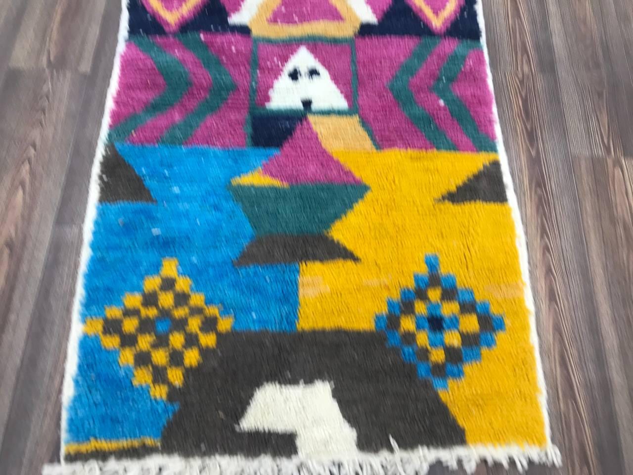 A Moroccan Berber Colorful rug is a traditional handwoven floor covering that originates from the indigenous Berber people of Morocco. These rugs are known for their intricate patterns and bold, geometric designs, which are created using a variety of natural dyes and High-quality Wool. Moroccan boujad rugs are versatile and can be used to add a touch of bohemian chic to any room, from a living room or bedroom to a home office or entryway. They are durable and easy to maintain, making them a practical choice for high-traffic areas. Whether you're looking to add a pop of color to your space or create a warm and welcoming atmosphere, a Moroccan Berber rug is a great choice.