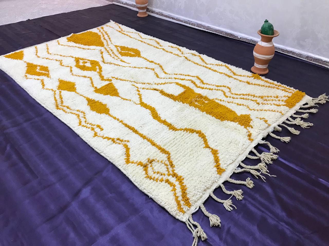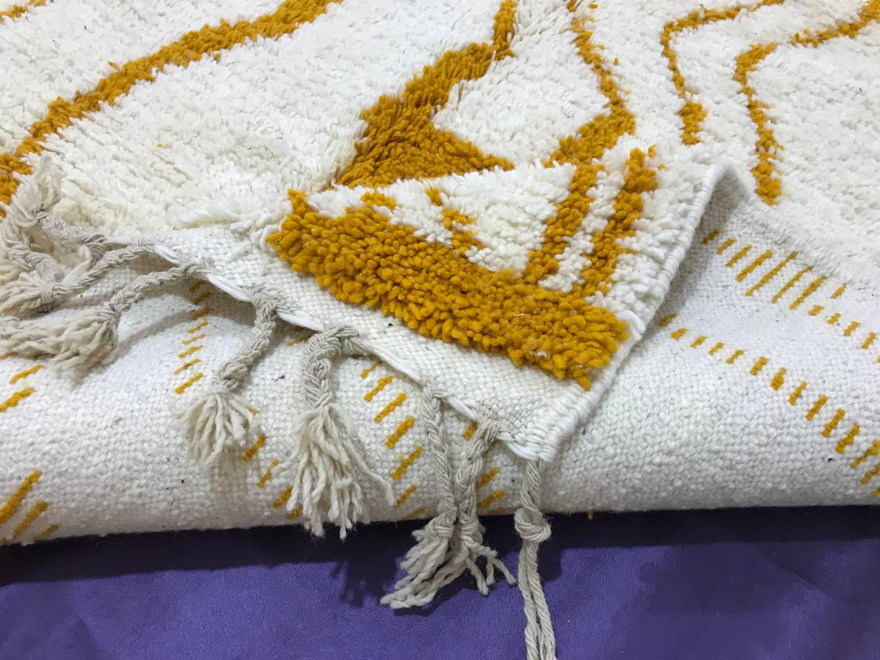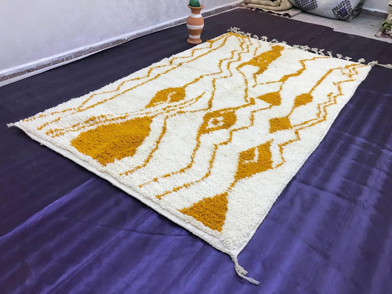 A Moroccan Berber Colorful rug is a traditional handwoven floor covering that originates from the indigenous Berber people of Morocco. These rugs are known for their intricate patterns and bold, geometric designs, which are created using a variety of natural dyes and High-quality Wool. Moroccan boujad rugs are versatile and can be used to add a touch of bohemian chic to any room, from a living room or bedroom to a home office or entryway. They are durable and easy to maintain, making them a practical choice for high-traffic areas. Whether you're looking to add a pop of color to your space or create a warm and welcoming atmosphere, a Moroccan Berber rug is a great choice. 📌 Shipping: insured, trackable, Fast, and FREE Worldwide by FedEx or DHL (2 to 5 days delivery). ❖ Cleaning: all rugs are carefully cleaned before shipping. ❖ Colors: Please take a look at the pictures. ❖ Texture: Moroccan / soft / Shag. ❖ Technique: Hand-Knotted ❖ Construction: Handmade ❖ Location: Indoor Use Only ❖ Material: Your order is made entirely by hand from natural wool, which means there will be natural (and beautiful) variations in pattern and color. Wool shrinks. ❖ Pattern: Because the product is handcrafted, the pattern and Colors may vary slightly from one piece to another. ❖ Size: While we try our best to ensure consistent sizing, it is possible for final sizes to vary by a few inches more or less. ❖ Tassels: One side is the Traditional way of making the rugs. 📌Ships tightly rolled in a protective bag. Any slight creasing will disappear within a few days. Shedding loose fibers is normal with new rugs. Shedding will diminish with regular vacuuming. If you have any questions or queries, please feel free to contact me via messages. Handwoven Yellow Moroccan Berber Rug: Wool Boujaad Carpet,moroccan boho rug,moroccan berber rug,orange berber rug