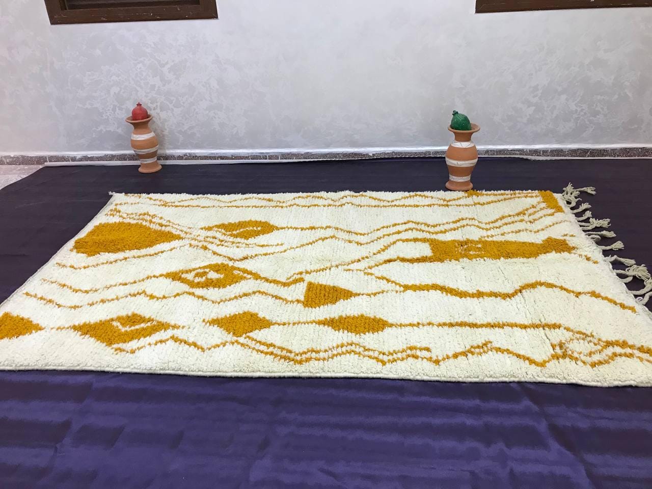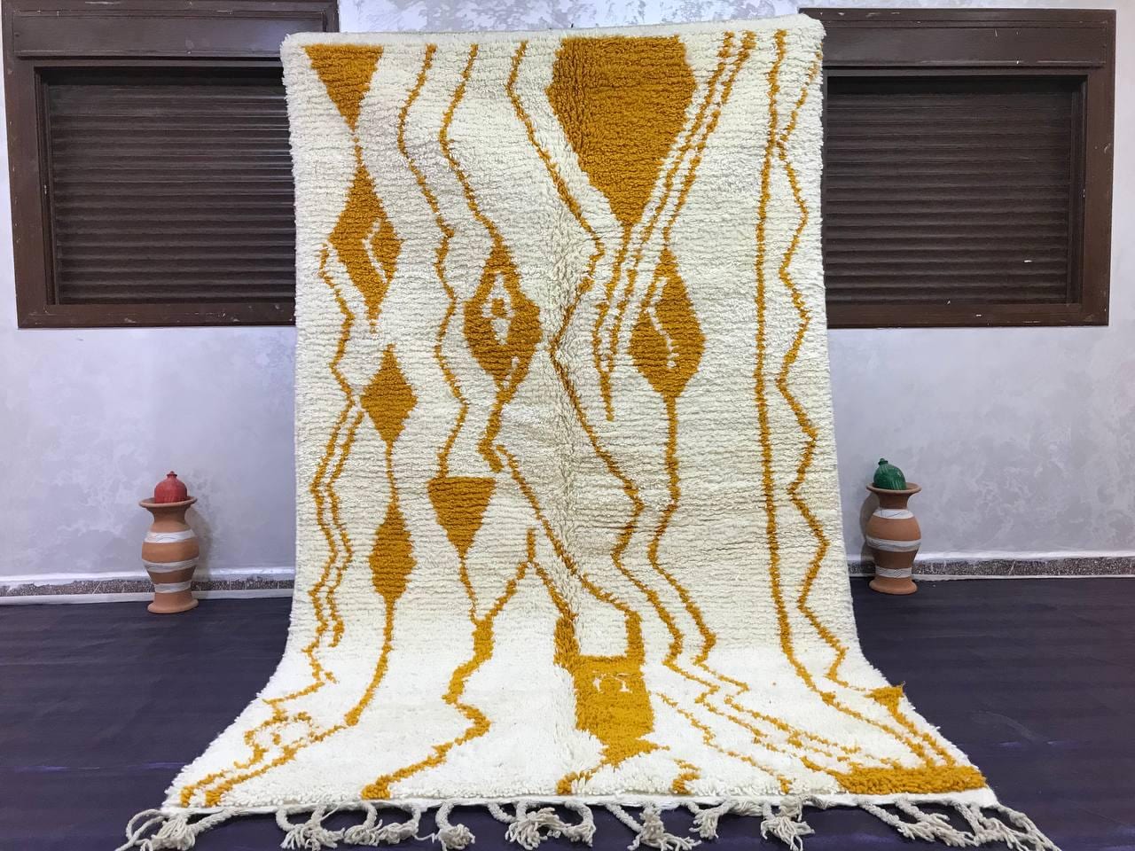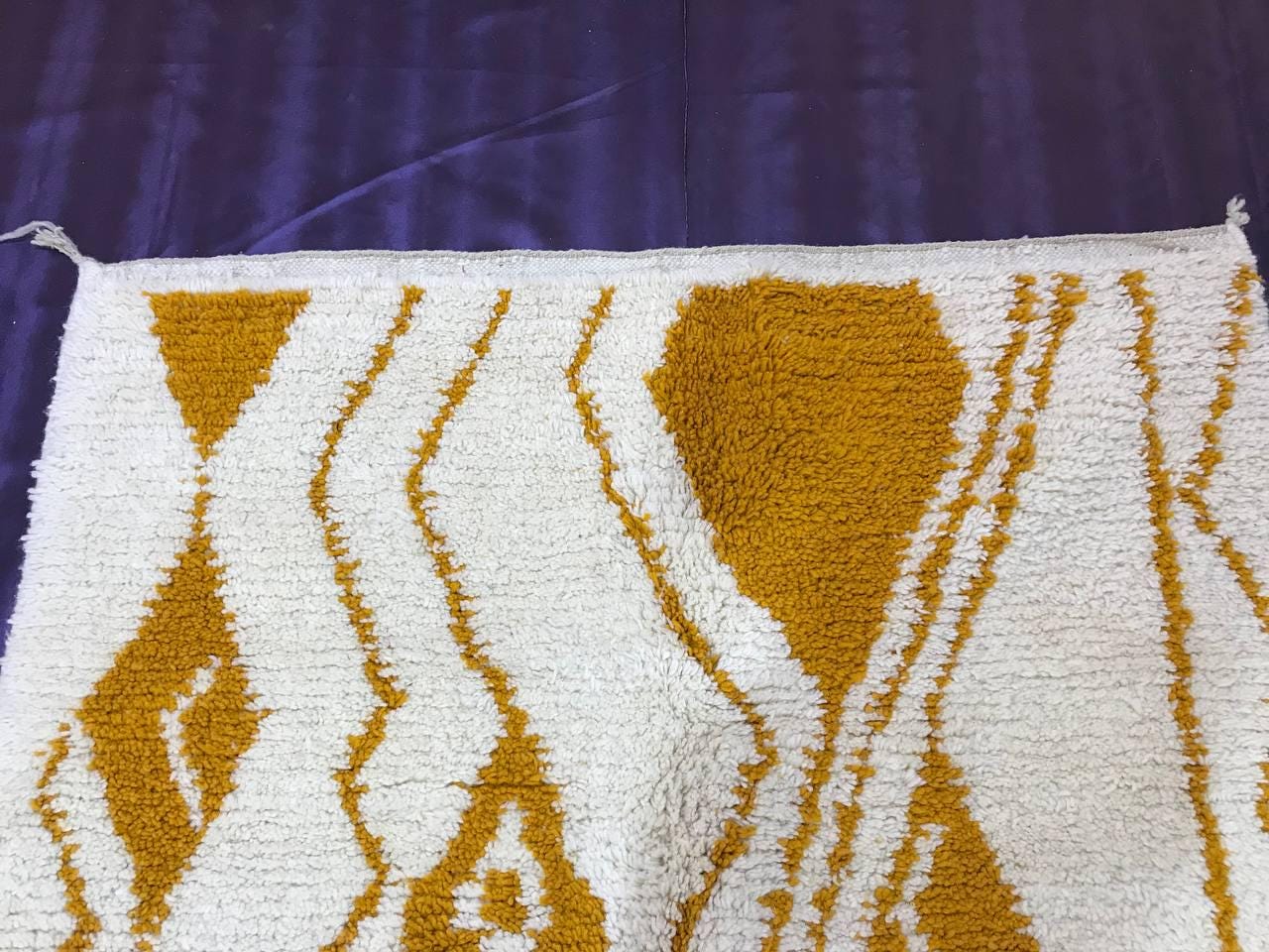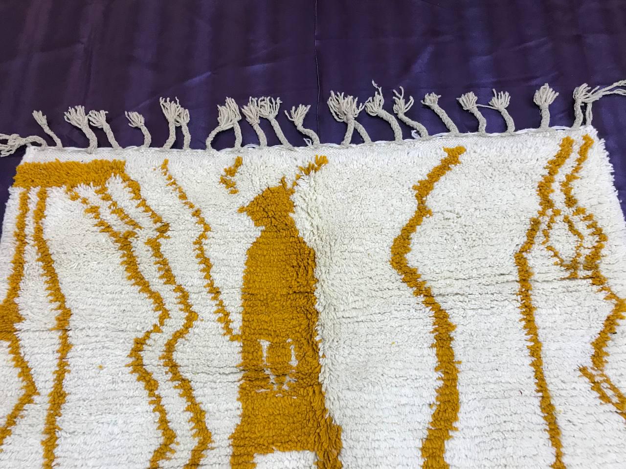 A Moroccan Berber Colorful rug is a traditional handwoven floor covering that originates from the indigenous Berber people of Morocco. These rugs are known for their intricate patterns and bold, geometric designs, which are created using a variety of natural dyes and High-quality Wool. Moroccan boujad rugs are versatile and can be used to add a touch of bohemian chic to any room, from a living room or bedroom to a home office or entryway. They are durable and easy to maintain, making them a practical choice for high-traffic areas. Whether you're looking to add a pop of color to your space or create a warm and welcoming atmosphere, a Moroccan Berber rug is a great choice. 📌 Shipping: insured, trackable, Fast, and FREE Worldwide by FedEx or DHL (2 to 5 days delivery). ❖ Cleaning: all rugs are carefully cleaned before shipping. ❖ Colors: Please take a look at the pictures. ❖ Texture: Moroccan / soft / Shag. ❖ Technique: Hand-Knotted ❖ Construction: Handmade ❖ Location: Indoor Use Only ❖ Material: Your order is made entirely by hand from natural wool, which means there will be natural (and beautiful) variations in pattern and color. Wool shrinks. ❖ Pattern: Because the product is handcrafted, the pattern and Colors may vary slightly from one piece to another. ❖ Size: While we try our best to ensure consistent sizing, it is possible for final sizes to vary by a few inches more or less. ❖ Tassels: One side is the Traditional way of making the rugs. 📌Ships tightly rolled in a protective bag. Any slight creasing will disappear within a few days. Shedding loose fibers is normal with new rugs. Shedding will diminish with regular vacuuming. If you have any questions or queries, please feel free to contact me via messages. Handwoven Yellow Moroccan Berber Rug: Wool Boujaad Carpet,moroccan boho rug,moroccan berber rug,orange berber rug