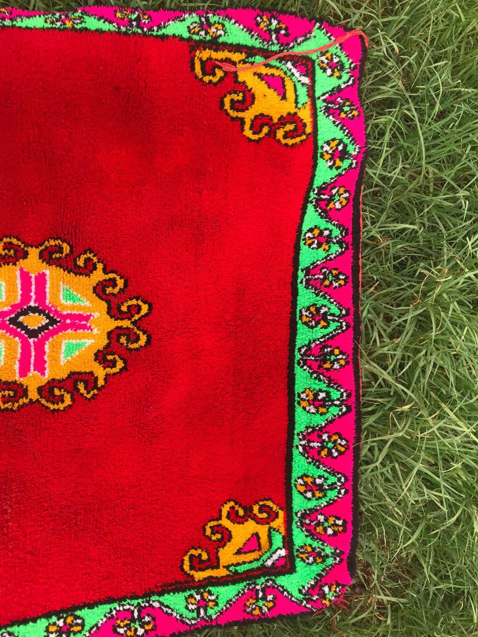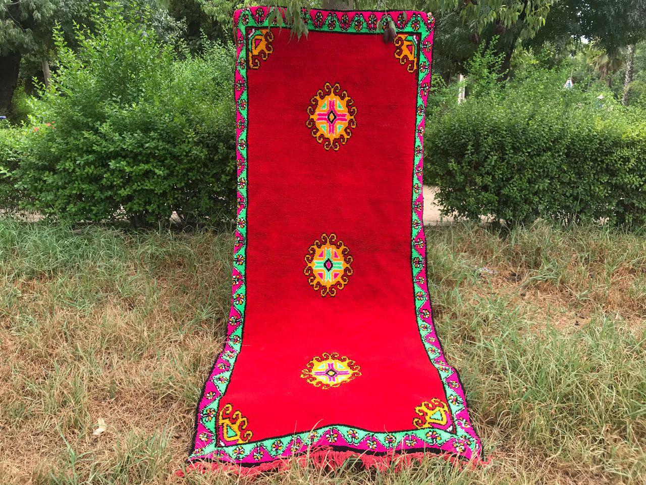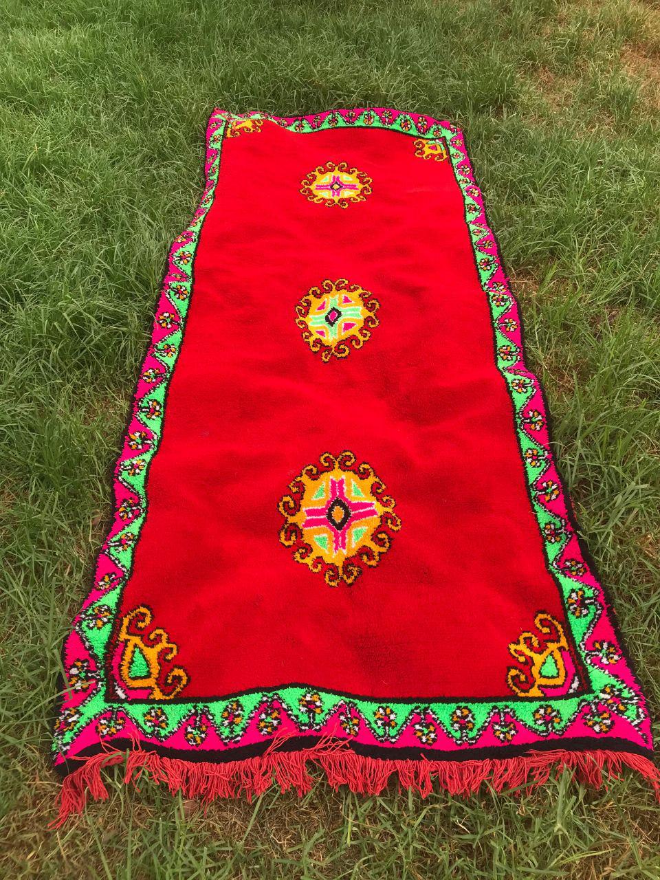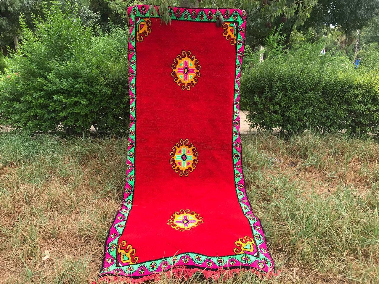 A Moroccan Berber Colorful rug is a traditional handwoven floor covering that originates from the indigenous Berber people of Morocco. These rugs are known for their intricate patterns and bold, geometric designs, which are created using a variety of natural dyes and High-quality Wool. Moroccan boujad rugs are versatile and can be used to add a touch of bohemian chic to any room, from a living room or bedroom to a home office or entryway. They are durable and easy to maintain, making them a practical choice for high-traffic areas. Whether you're looking to add a pop of color to your space or create a warm and welcoming atmosphere, a Moroccan Berber rug is a great choice. 📌 Shipping: insured, trackable, Fast, and FREE Worldwide by FedEx or DHL (2 to 5 days delivery). ❖ Cleaning: all rugs are carefully cleaned before shipping. ❖ Colors: Please take a look at the pictures. ❖ Texture: Moroccan / soft / Shag. ❖ Technique: Hand-Knotted ❖ Construction: Handmade ❖ Location: Indoor Use Only ❖ Material: Your order is made entirely by hand from natural wool, which means there will be natural (and beautiful) variations in pattern and color. Wool shrinks. ❖ Pattern: Because the product is handcrafted, the pattern and Colors may vary slightly from one piece to another. ❖ Size: While we try our best to ensure consistent sizing, it is possible for final sizes to vary by a few inches more or less. ❖ Tassels: One side is the Traditional way of making the rugs. 📌Ships tightly rolled in a protective bag. Any slight creasing will disappear within a few days. Shedding loose fibers is normal with new rugs. Shedding will diminish with regular vacuuming. If you have any questions or queries, please feel free to contact me via messages. Hand-Knotted Moroccan Berber Rug: Red Wool Boho Atlas Design,rug red boho moroccan,red boho rug,area red rug,area rug ,