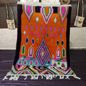 A Moroccan Berber Colorful rug is a traditional handwoven floor covering that originates from the indigenous Berber people of Morocco. These rugs are known for their intricate patterns and bold, geometric designs, which are created using a variety of natural dyes and High-quality Wool. Moroccan boujad rugs are versatile and can be used to add a touch of bohemian chic to any room, from a living room or bedroom to a home office or entryway. They are durable and easy to maintain, making them a practical choice for high-traffic areas. Whether you're looking to add a pop of color to your space or create a warm and welcoming atmosphere, a Moroccan Berber rug is a great choice. 📌 Shipping: insured, trackable, Fast, and FREE Worldwide by FedEx or DHL (2 to 5 days delivery). ❖ Cleaning: all rugs are carefully cleaned before shipping. ❖ Colors: Please take a look at the pictures. ❖ Texture: Moroccan / soft / Shag. ❖ Technique: Hand-Knotted ❖ Construction: Handmade ❖ Location: Indoor Use Only ❖ Material: Your order is made entirely by hand from natural wool, which means there will be natural (and beautiful) variations in pattern and color. Wool shrinks. ❖ Pattern: Because the product is handcrafted, the pattern and Colors may vary slightly from one piece to another. ❖ Size: While we try our best to ensure consistent sizing, it is possible for final sizes to vary by a few inches more or less. ❖ Tassels: One side is the Traditional way of making the rugs. 📌Ships tightly rolled in a protective bag. Any slight creasing will disappear within a few days. Shedding loose fibers is normal with new rugs. Shedding will diminish with regular vacuuming. If you have any questions or queries, please feel free to contact me via messages.