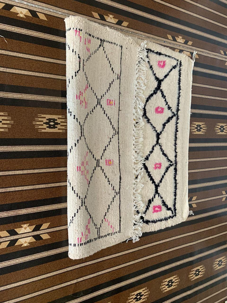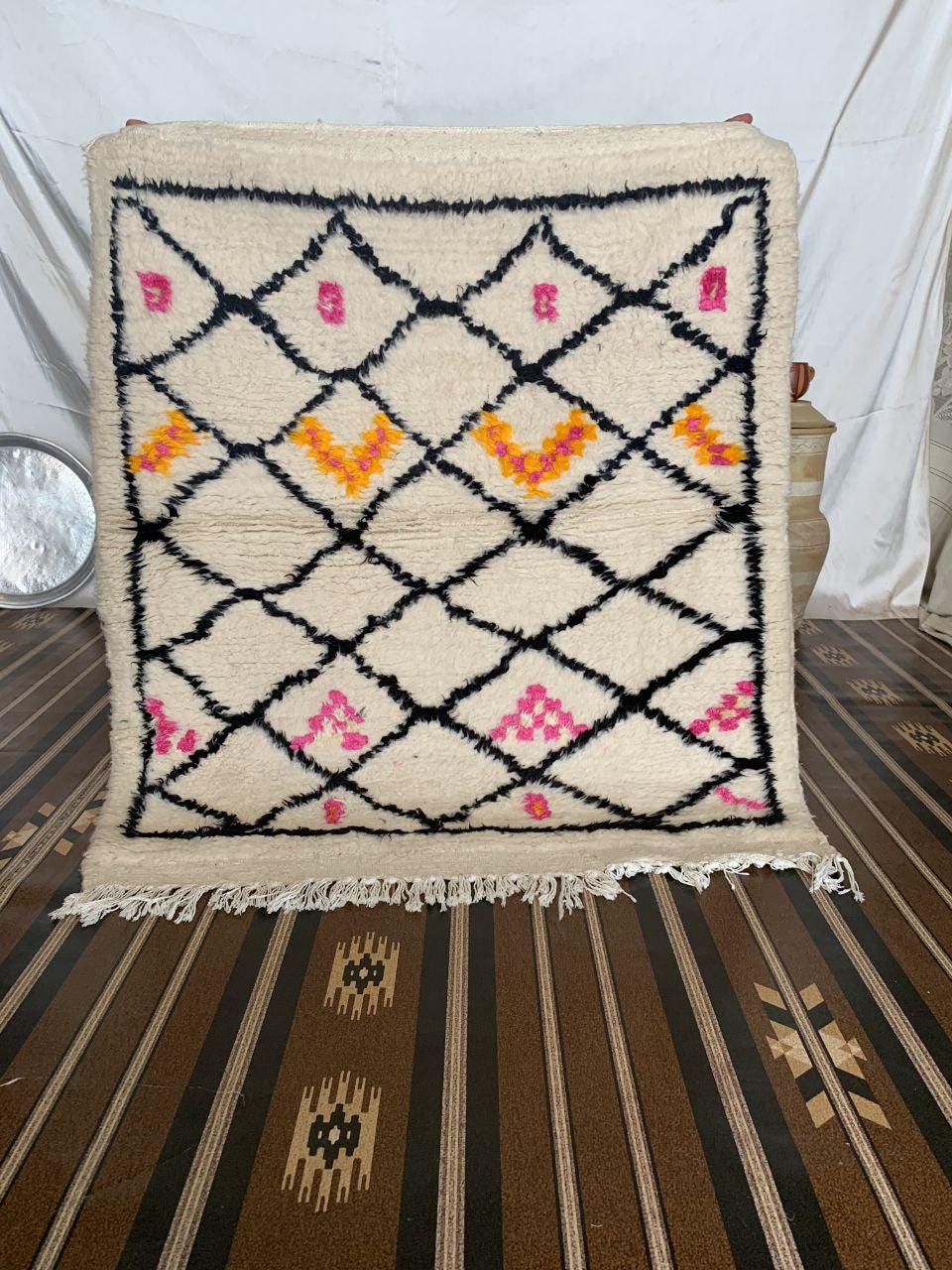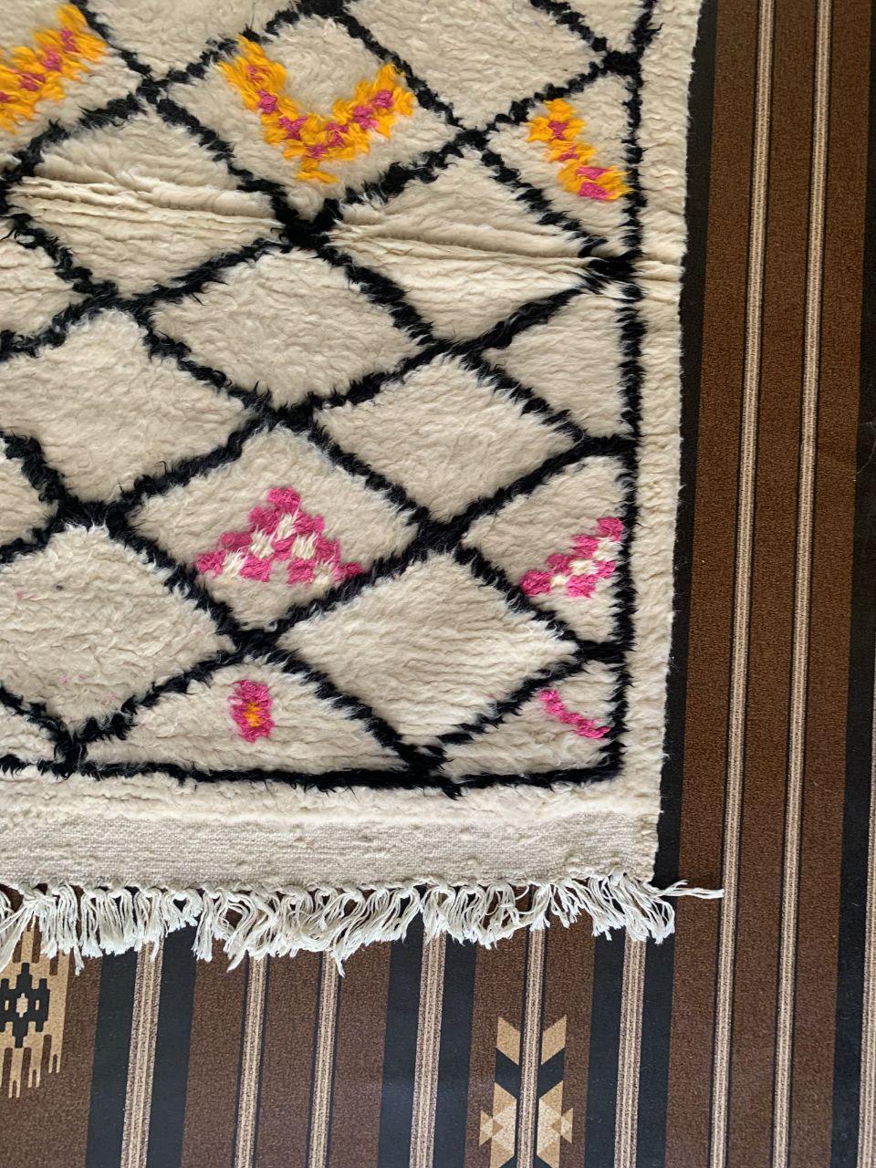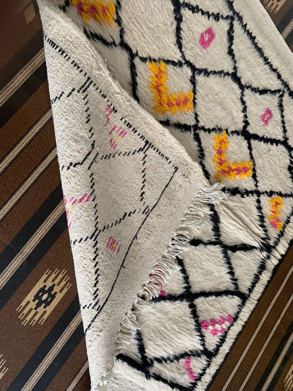 A Moroccan Berber Colorful rug is a traditional handwoven floor covering that originates from the indigenous Berber people of Morocco. These rugs are known for their intricate patterns and bold, geometric designs, which are created using a variety of natural dyes and High-quality Wool. Moroccan boujad rugs are versatile and can be used to add a touch of bohemian chic to any room, from a living room or bedroom to a home office or entryway. They are durable and easy to maintain, making them a practical choice for high-traffic areas. Whether you're looking to add a pop of color to your space or create a warm and welcoming atmosphere, a Moroccan Berber rug is a great choice. 📌 Shipping: insured, trackable, Fast, and FREE Worldwide by FedEx or DHL (2 to 5 days delivery). ❖ Cleaning: all rugs are carefully cleaned before shipping. ❖ Colors: Please take a look at the pictures. ❖ Texture: Moroccan / soft / Shag. ❖ Technique: Hand-Knotted ❖ Construction: Handmade ❖ Location: Indoor Use Only ❖ Material: Your order is made entirely by hand from natural wool, which means there will be natural (and beautiful) variations in pattern and color. Wool shrinks. ❖ Pattern: Because the product is handcrafted, the pattern and Colors may vary slightly from one piece to another. ❖ Size: While we try our best to ensure consistent sizing, it is possible for final sizes to vary by a few inches more or less. ❖ Tassels: One side is the Traditional way of making the rugs. 📌Ships tightly rolled in a protective bag. Any slight creasing will disappear within a few days. Shedding loose fibers is normal with new rugs. Shedding will diminish with regular vacuuming. If you have any questions or queries, please feel free to contact me via messages.