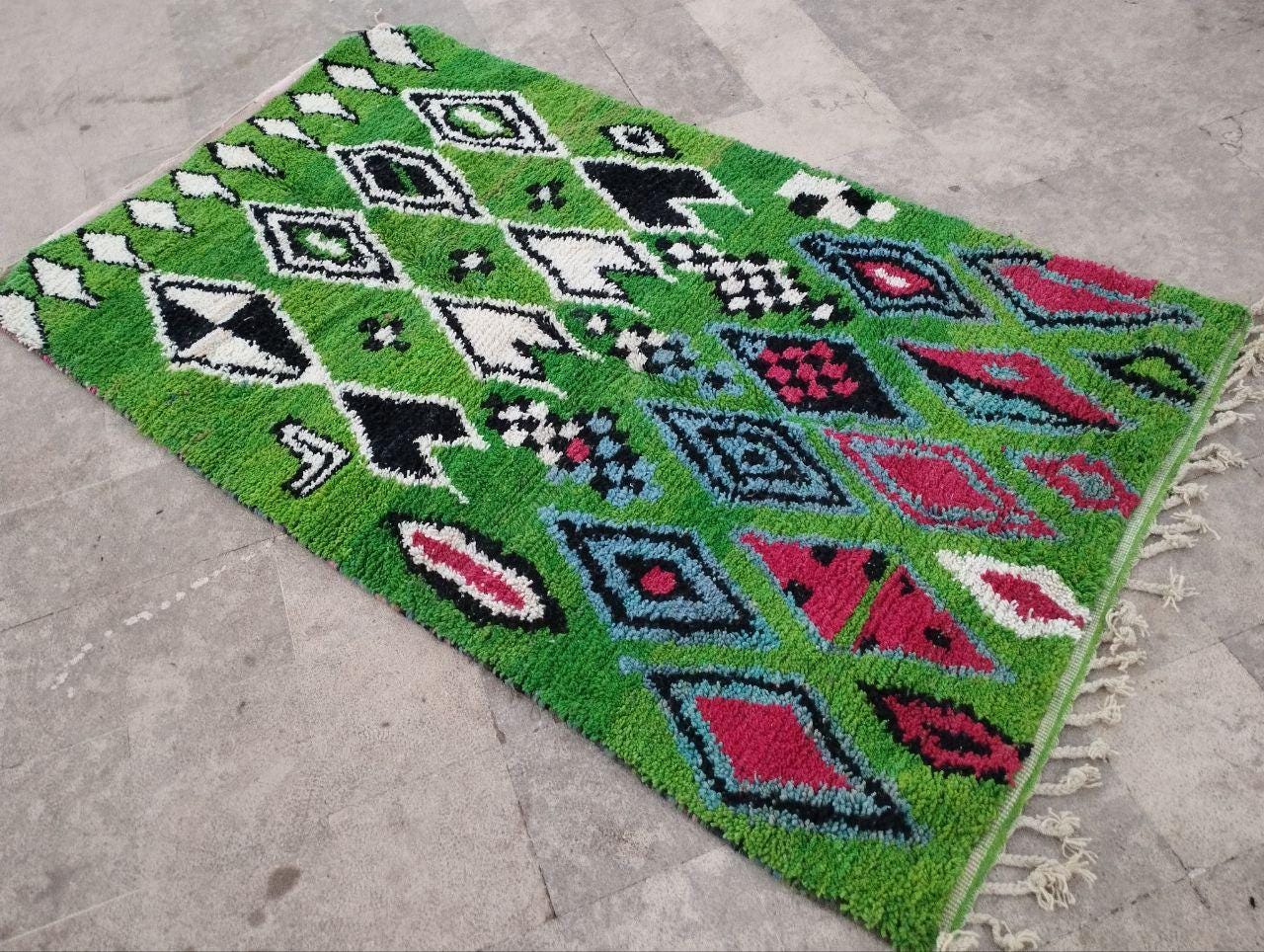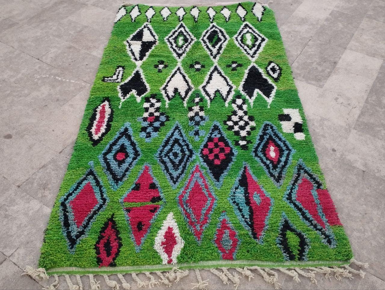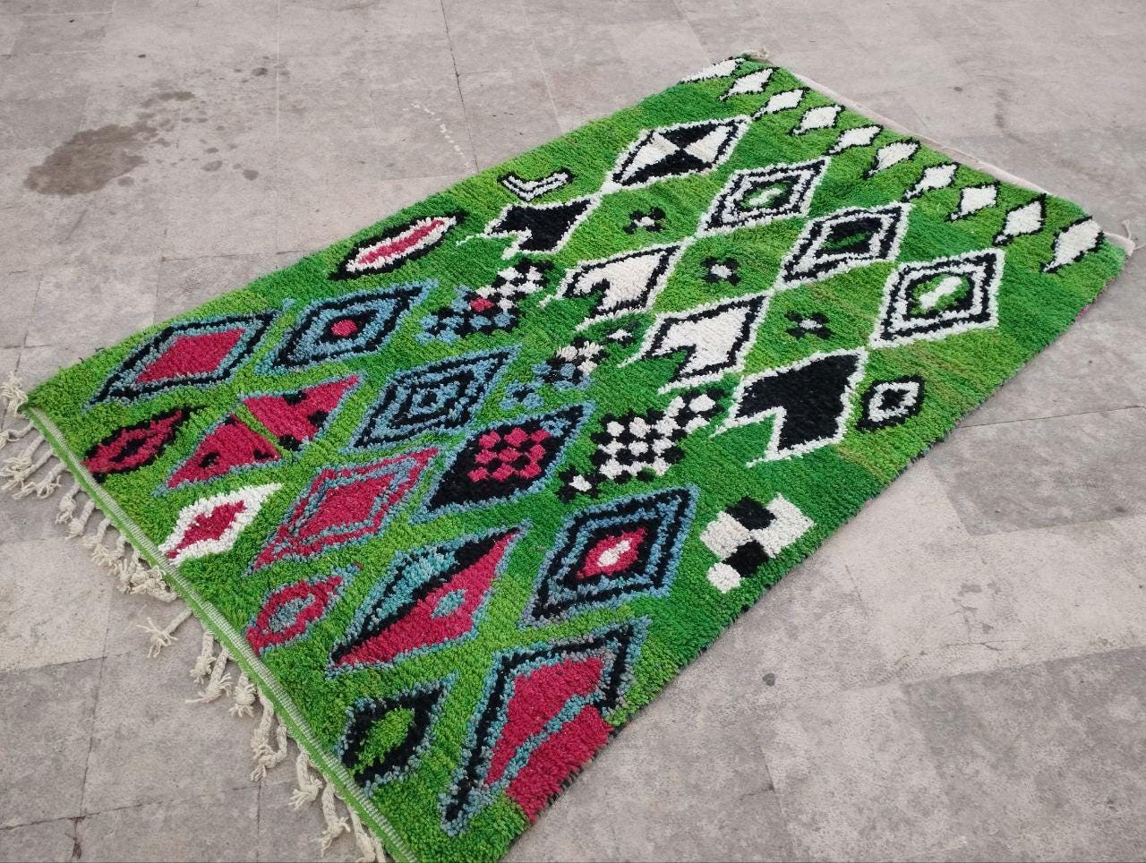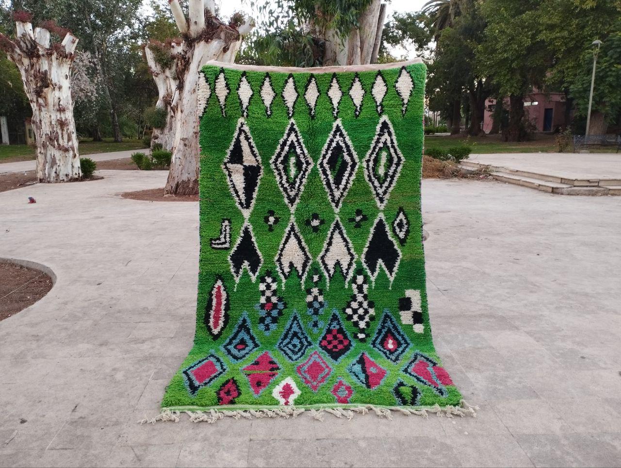 This handmade Moroccan rug from rugaziz features a stunning berber background and is inspired by traditional berber shop design. Each Moroccan rug is skillfully crafted, showcasing beautiful berber design black motifs and geometric patterns that embody a classic Moroccan aesthetic. The color palette includes rich earthy tones, perfect for adding a unique touch to a green rug bedroom, green rug office, or even pairing with a green sofa moroccan setup.