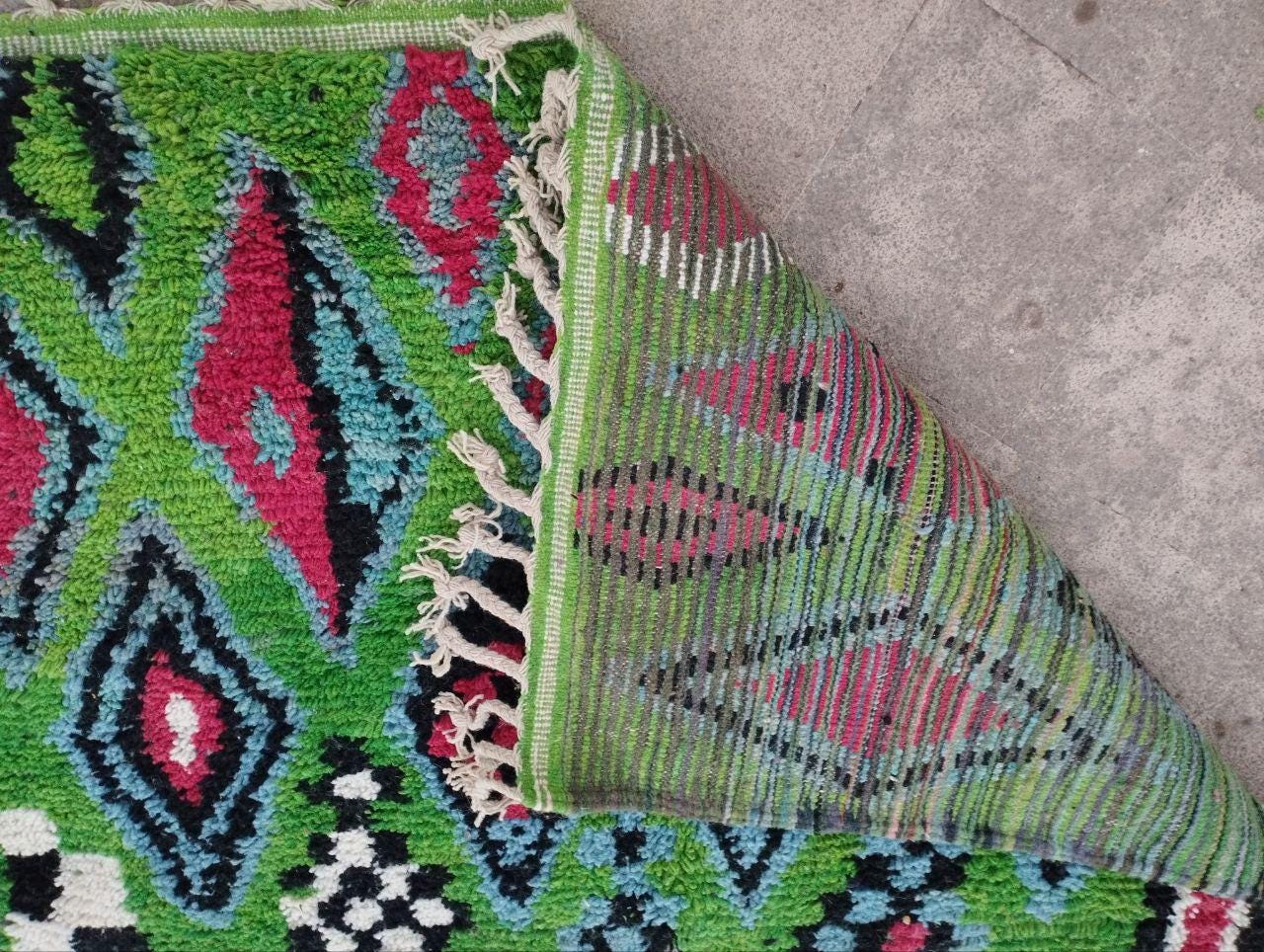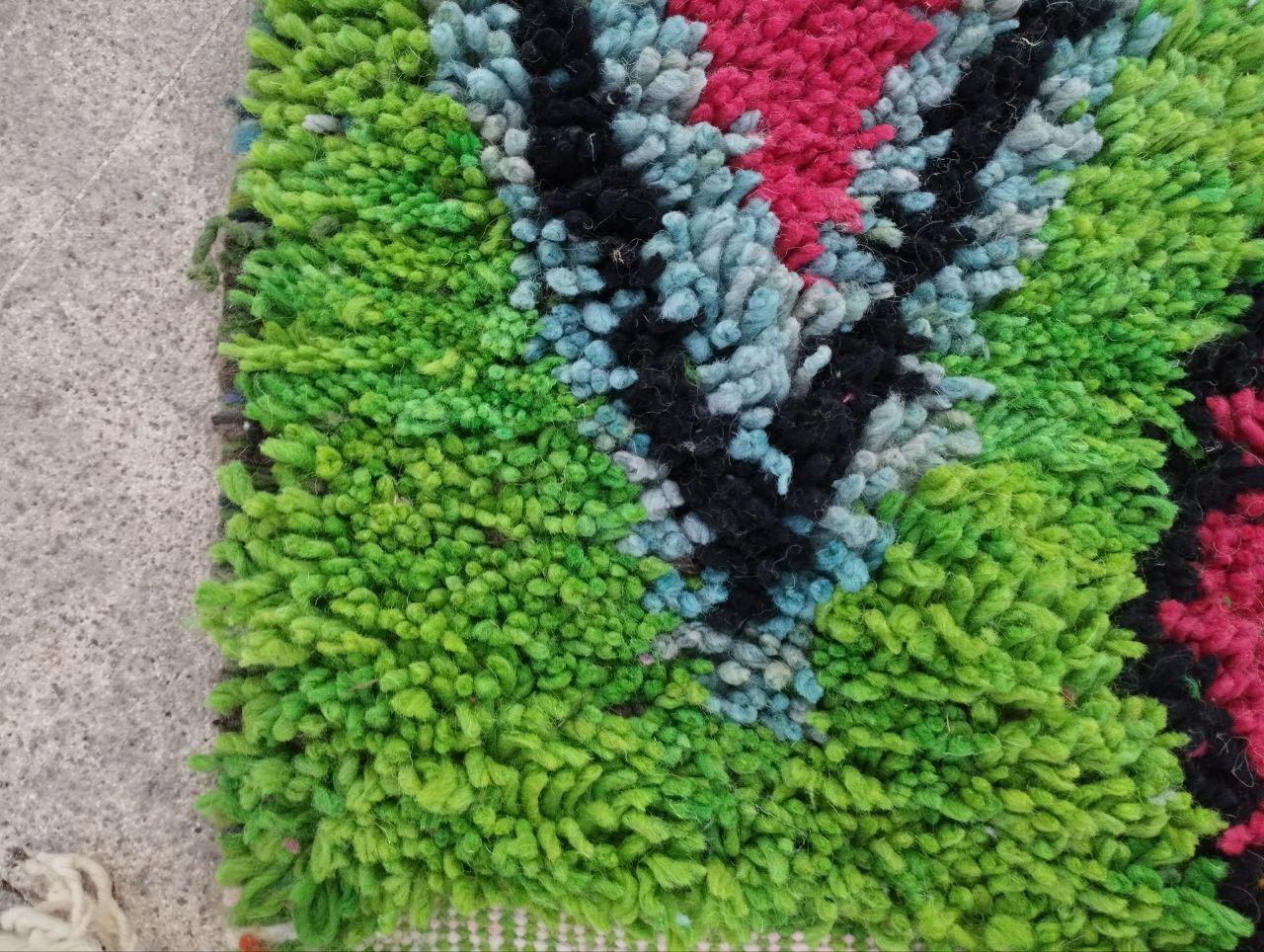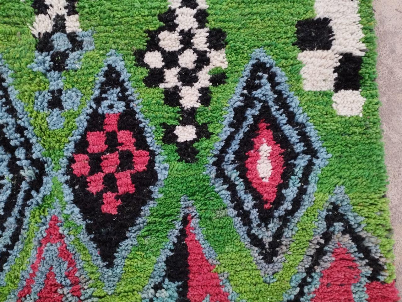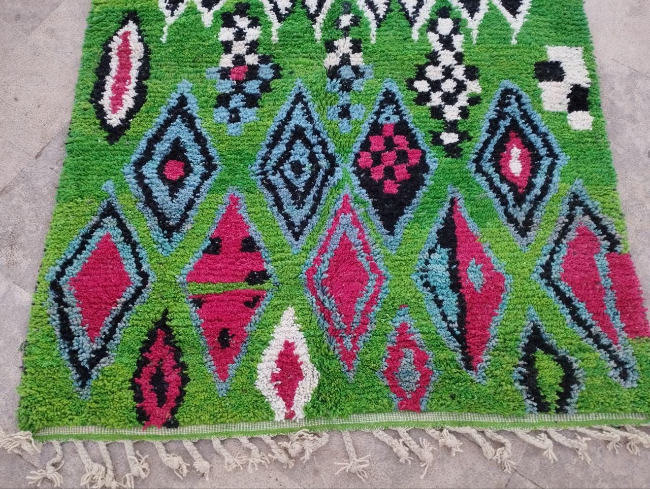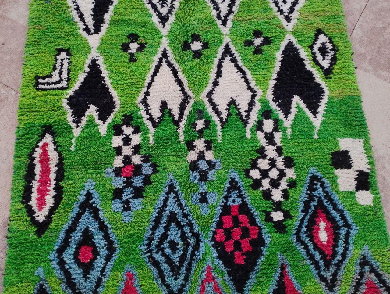 This handmade Moroccan rug from rugaziz features a stunning berber background and is inspired by traditional berber shop design. Each Moroccan rug is skillfully crafted, showcasing beautiful berber design black motifs and geometric patterns that embody a classic Moroccan aesthetic. The color palette includes rich earthy tones, perfect for adding a unique touch to a green rug bedroom, green rug office, or even pairing with a green sofa moroccan setup.