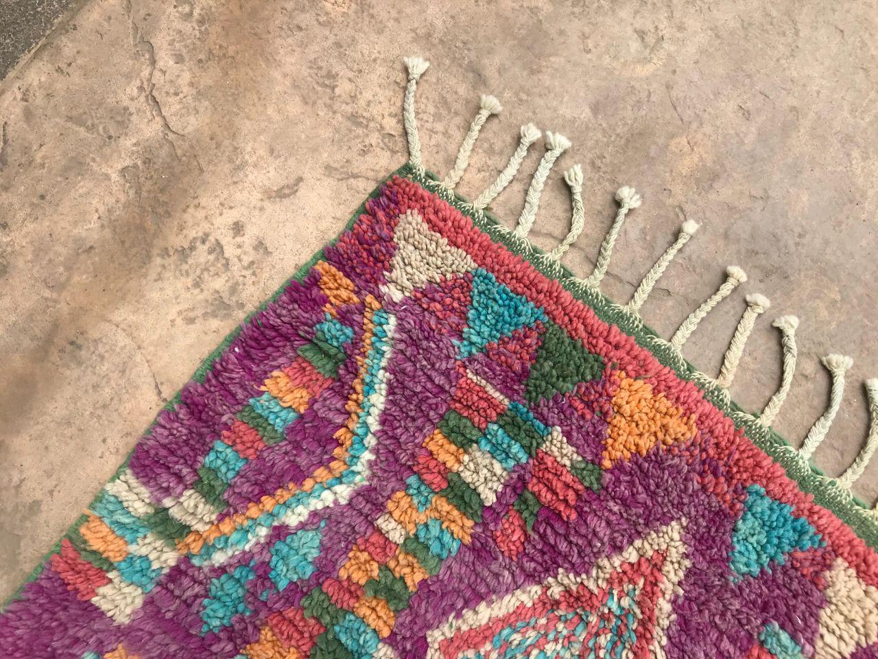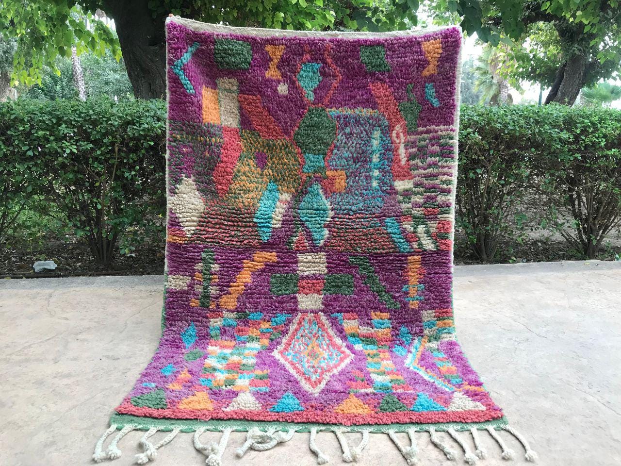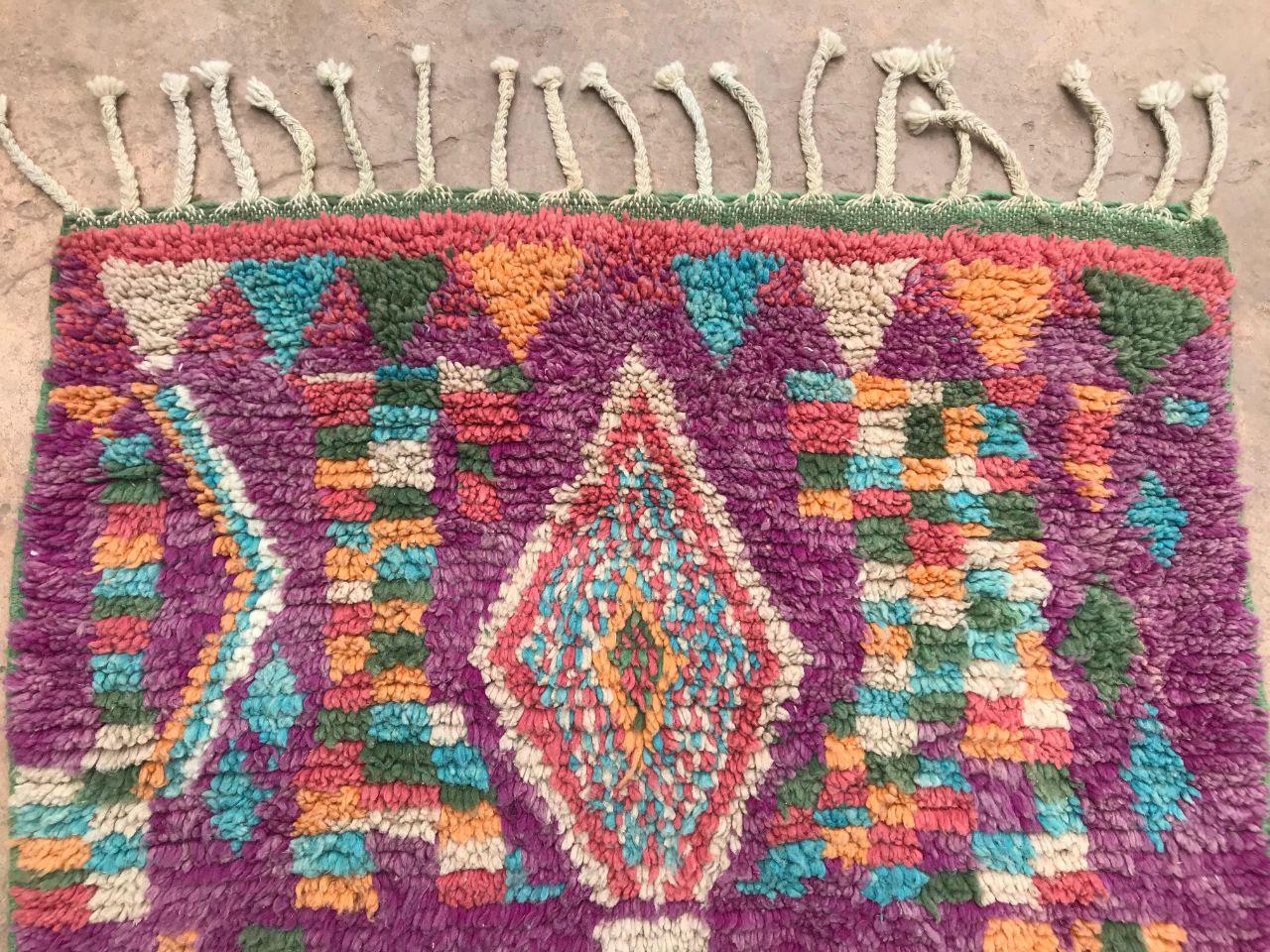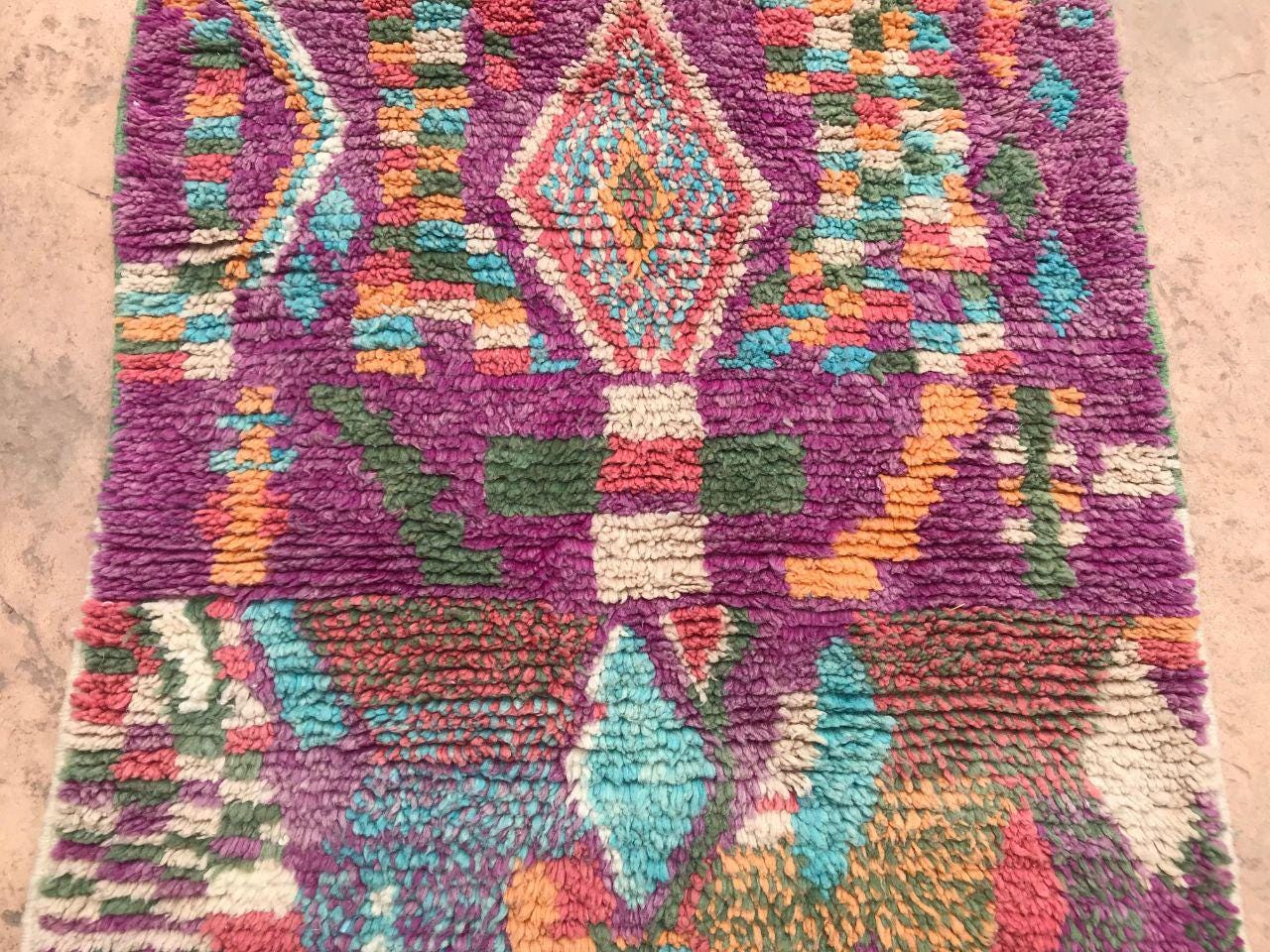 A Moroccan Berber colorful rug brings authentic rugaziz style, inspired by the indigenous Berber people of Morocco, right into your home. Known for its intricate patterns and bold, geometric shapes, each piece is crafted from high-quality, natural wool and colored using natural dyes. This abstract boho rug features stunning lavender rug design elements—perfect for adding a touch of bohemian chic to any space, such as your living room, entryway, or lavender rug nursery.