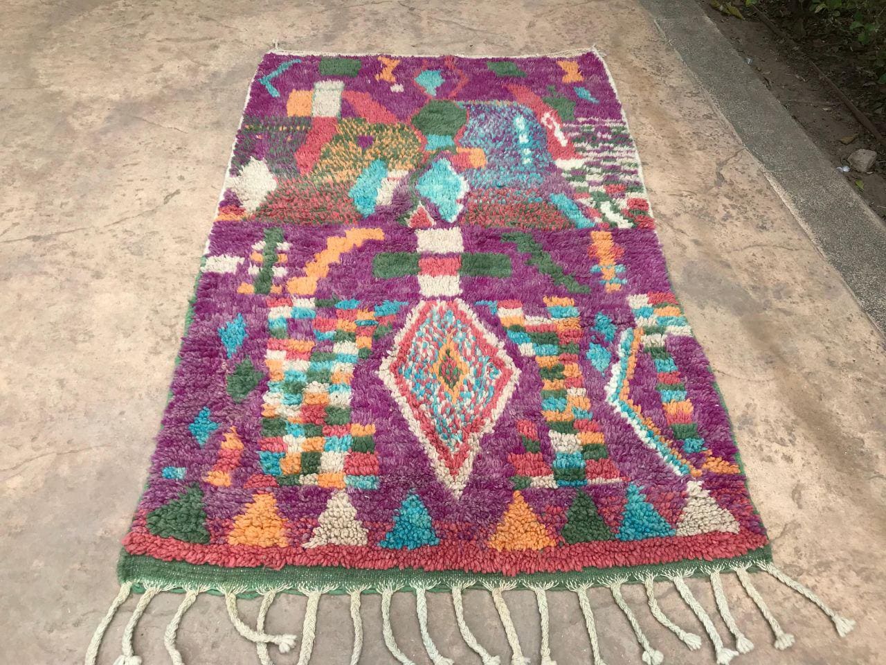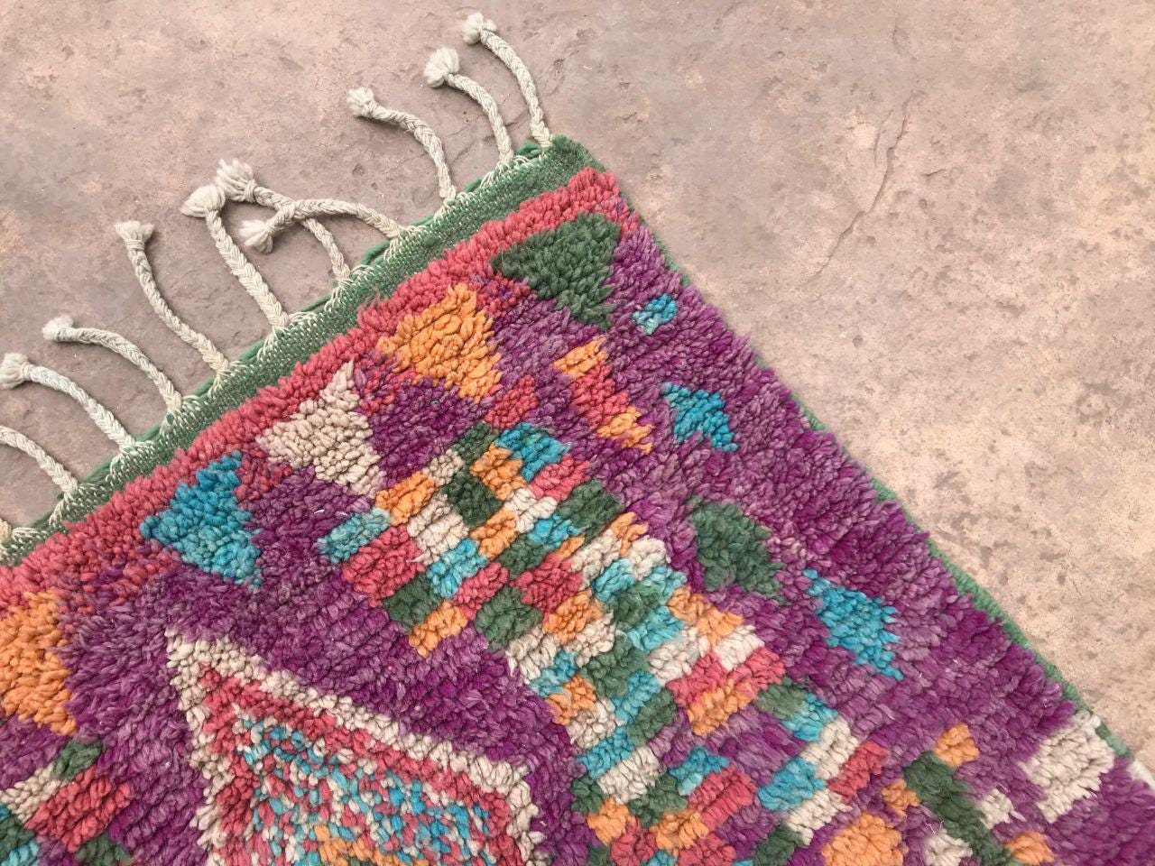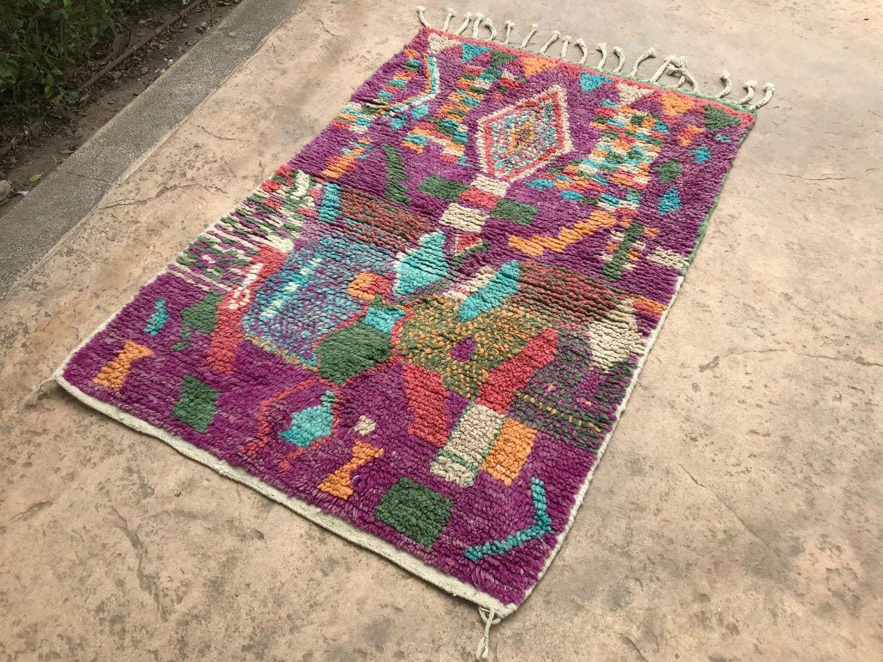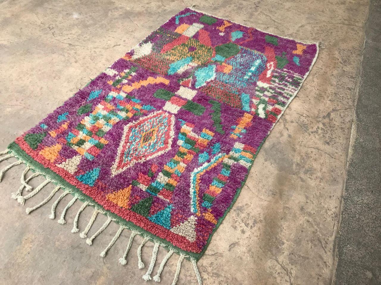 A Moroccan Berber colorful rug brings authentic rugaziz style, inspired by the indigenous Berber people of Morocco, right into your home. Known for its intricate patterns and bold, geometric shapes, each piece is crafted from high-quality, natural wool and colored using natural dyes. This abstract boho rug features stunning lavender rug design elements—perfect for adding a touch of bohemian chic to any space, such as your living room, entryway, or lavender rug nursery.