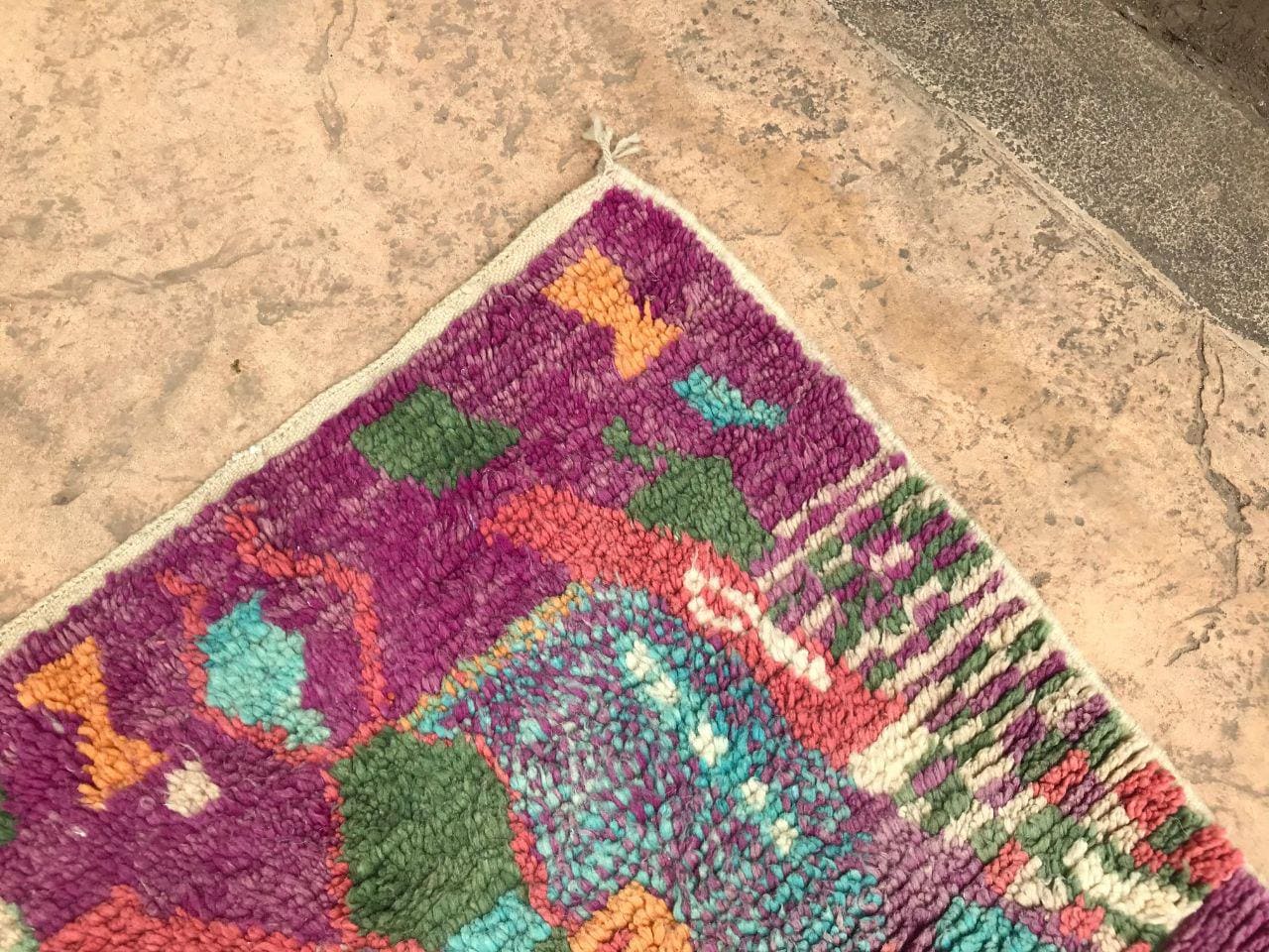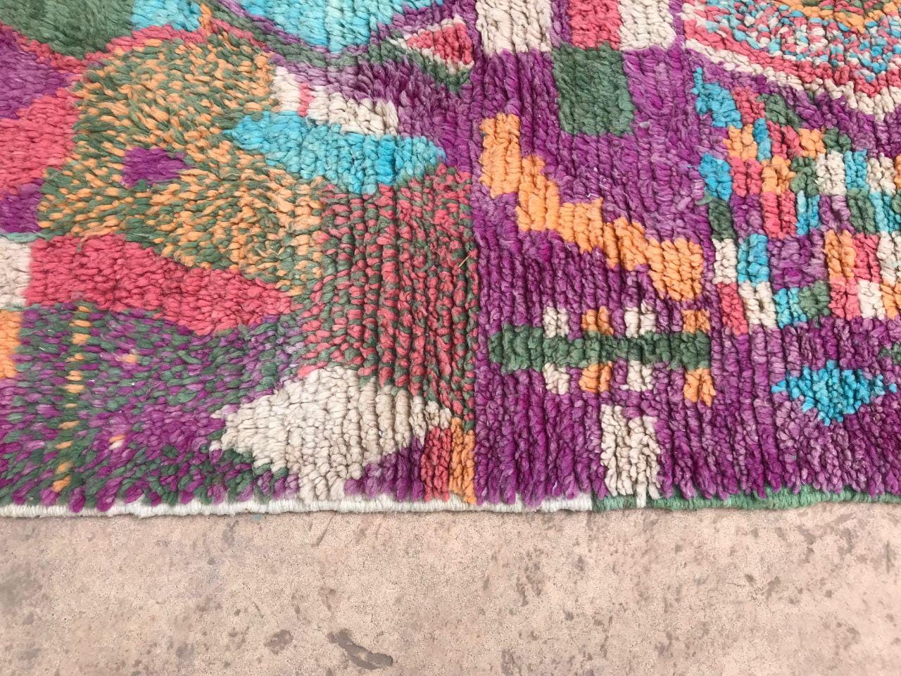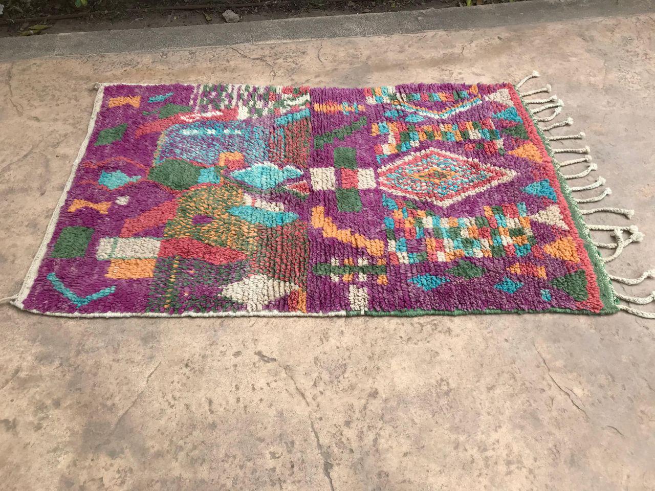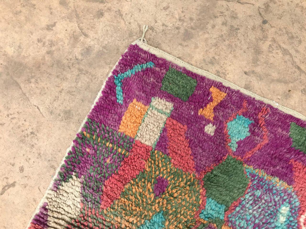 A Moroccan Berber colorful rug brings authentic rugaziz style, inspired by the indigenous Berber people of Morocco, right into your home. Known for its intricate patterns and bold, geometric shapes, each piece is crafted from high-quality, natural wool and colored using natural dyes. This abstract boho rug features stunning lavender rug design elements—perfect for adding a touch of bohemian chic to any space, such as your living room, entryway, or lavender rug nursery.