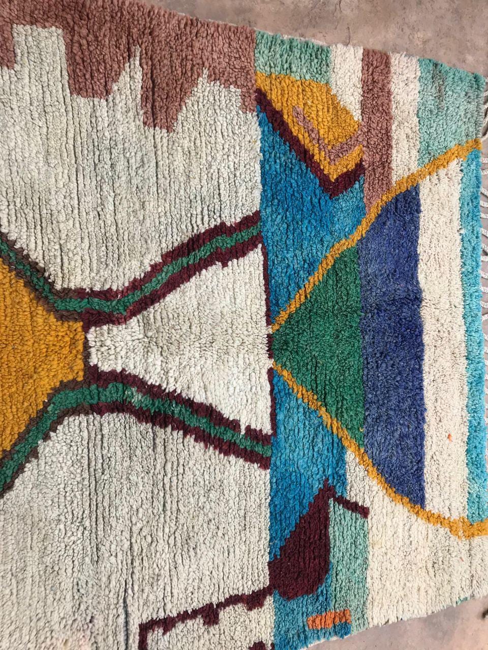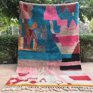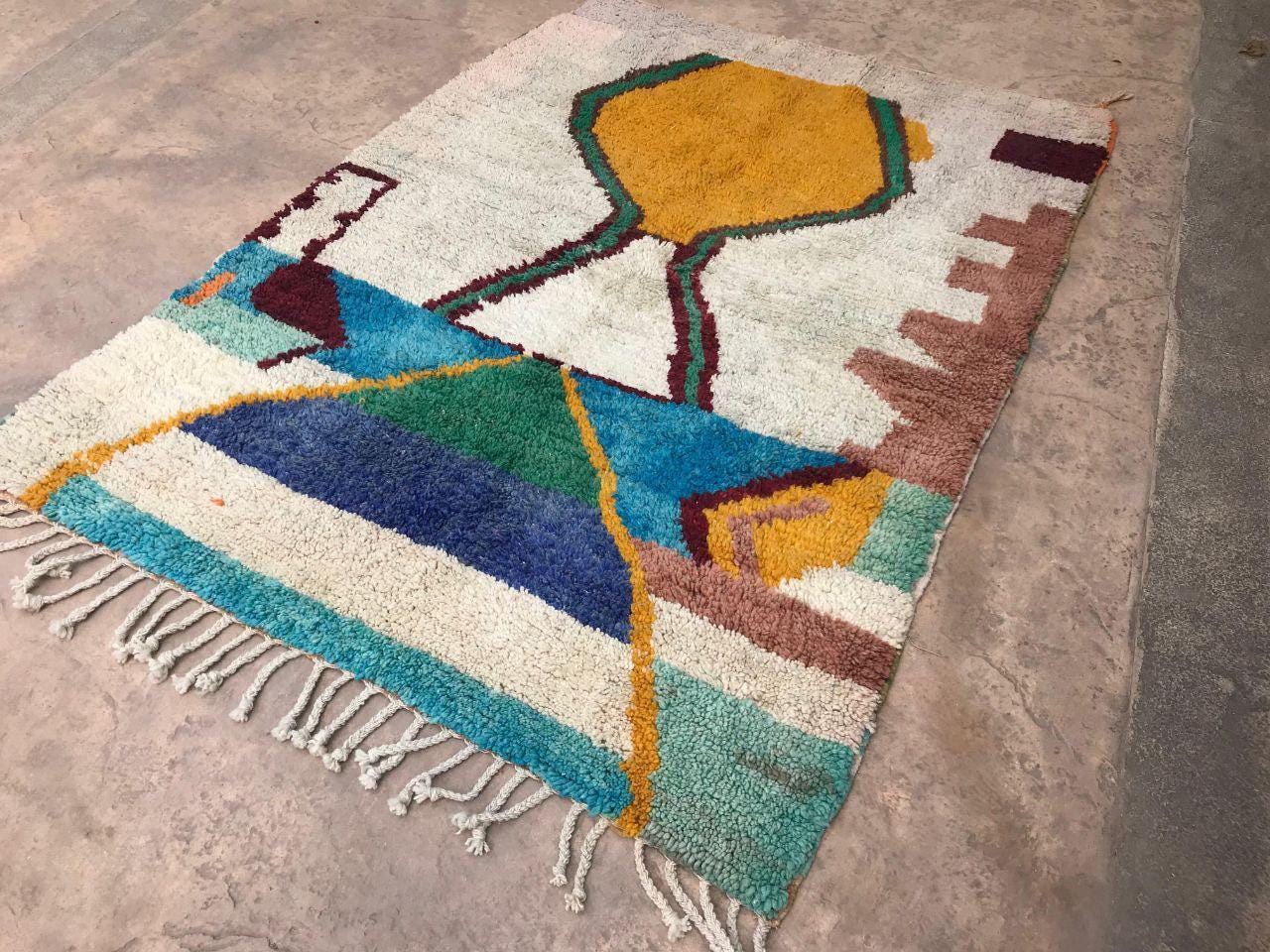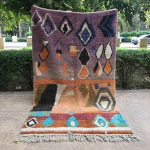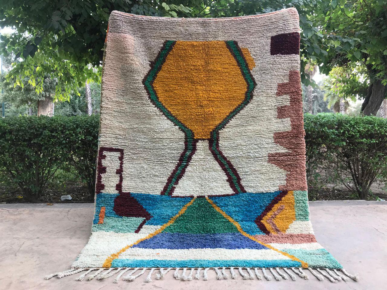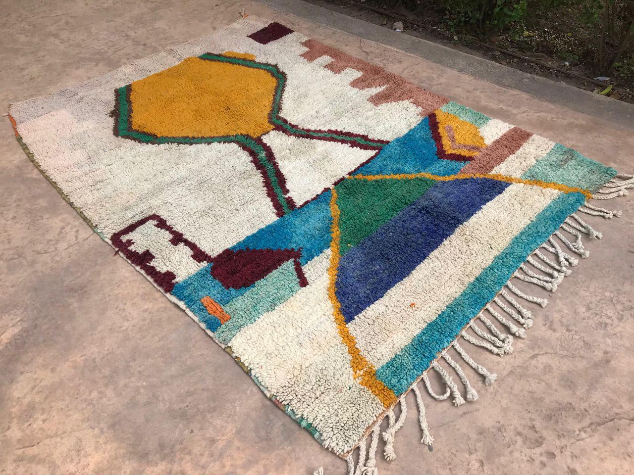 A rugaziz Moroccan Berber colorful rug is a traditional handmade rug created by the indigenous Berber people of Morocco. This boho rug features intricate patterns and bold, geometric designs, all made with natural dyes and high-quality wool. Each unique patterned rug brings character and charm, making it a great area rug for enriching your home decor.
