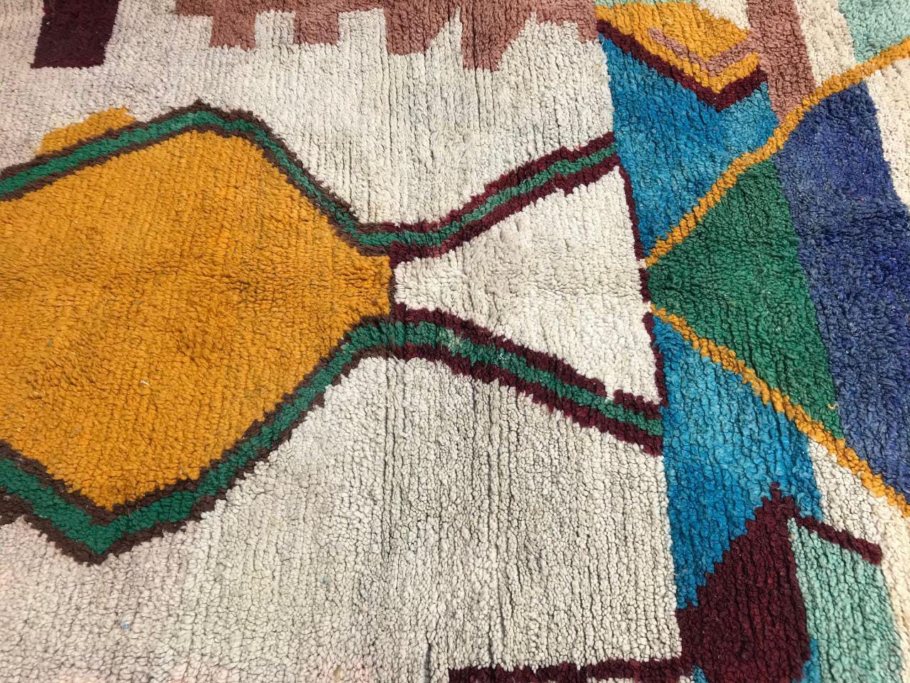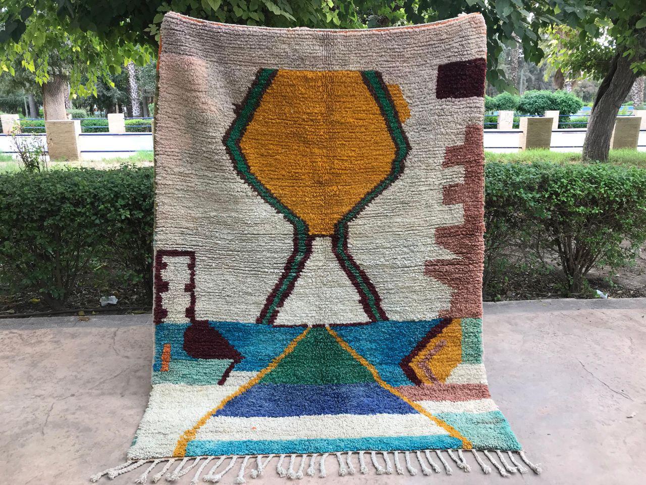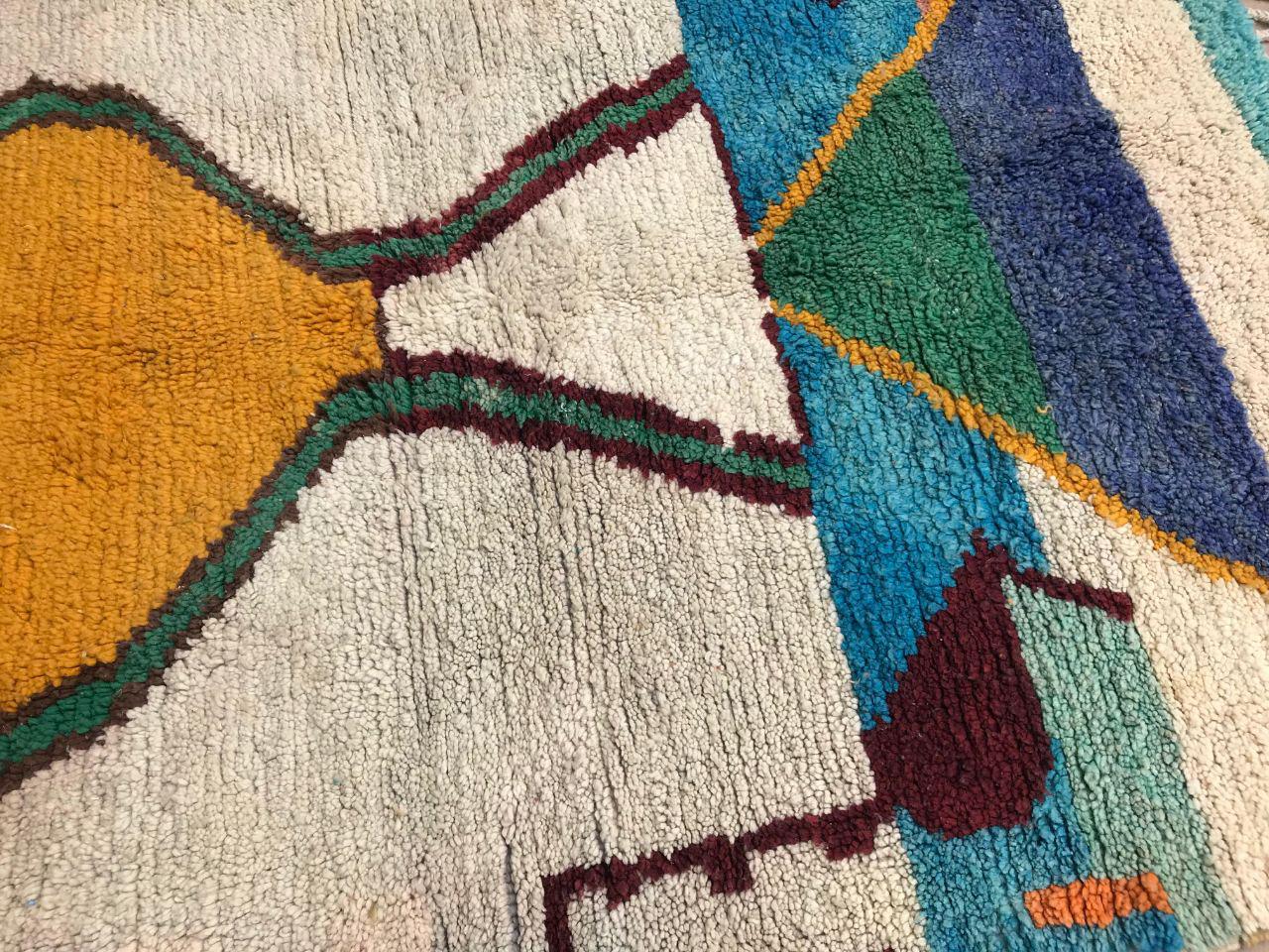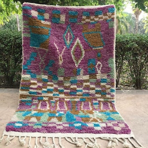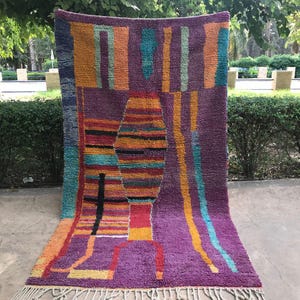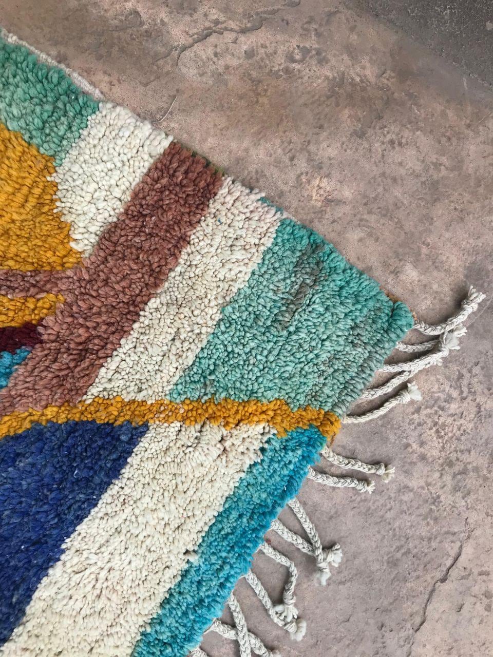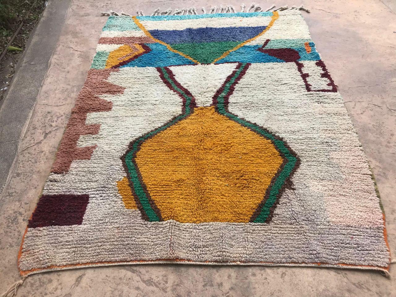 A rugaziz Moroccan Berber colorful rug is a traditional handmade rug created by the indigenous Berber people of Morocco. This boho rug features intricate patterns and bold, geometric designs, all made with natural dyes and high-quality wool. Each unique patterned rug brings character and charm, making it a great area rug for enriching your home decor.