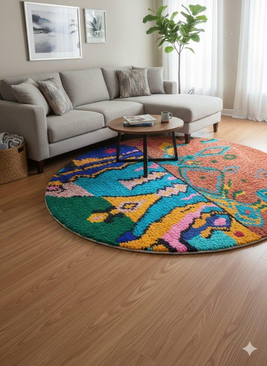 Step into a world of vibrant colors and rich tradition with this handmade colorful round rug, inspired by authentic Moroccan wool craftsmanship. Perfectly blending the essence of a boho carpet with modern design, this unique piece features an irregular shape and lively patterns that bring warmth and character to any living room, bedroom, or meditation nook. Crafted from natural Moroccan wool, it offers both softness and durability, making it a standout addition to your cozy living space.