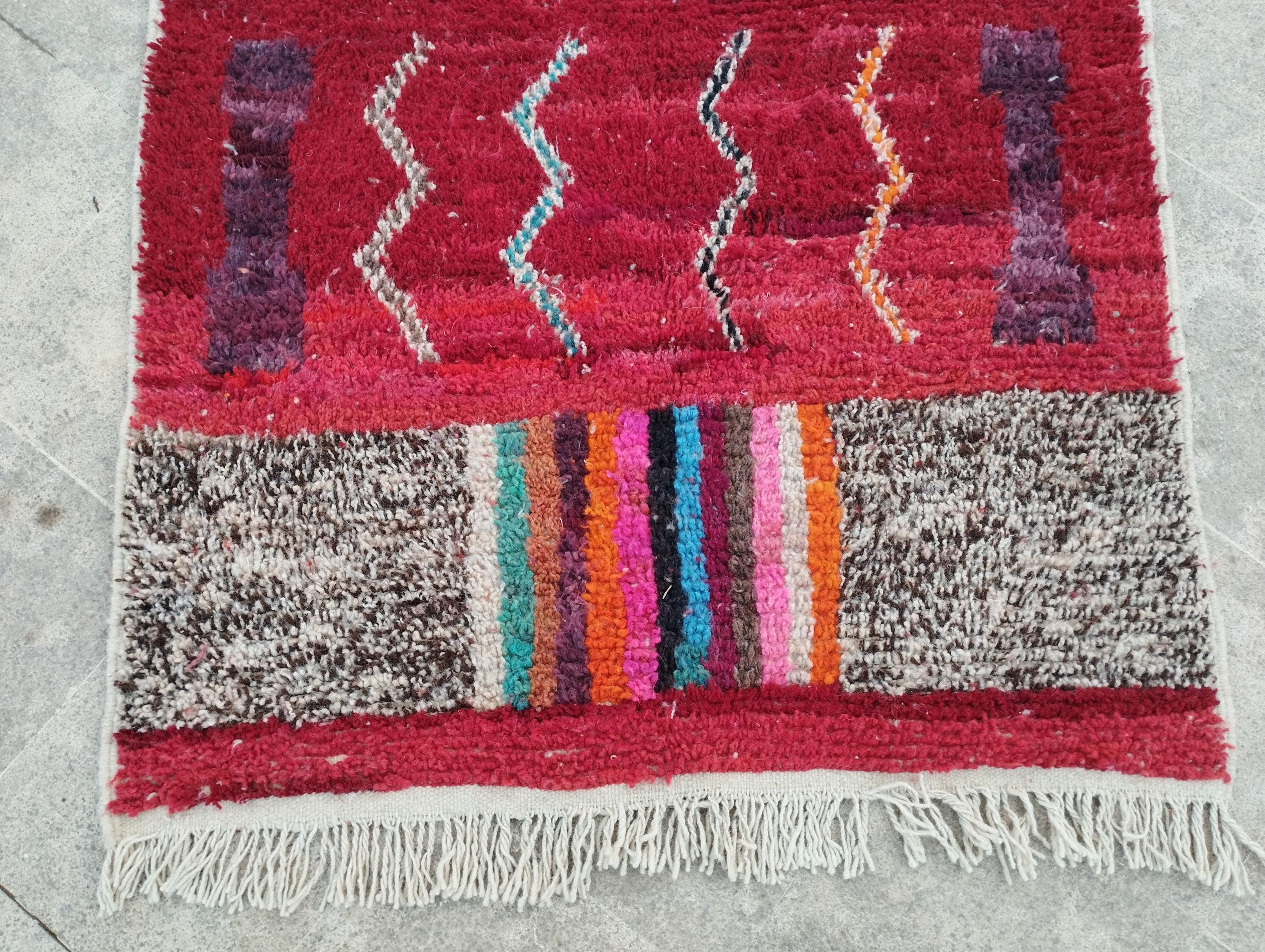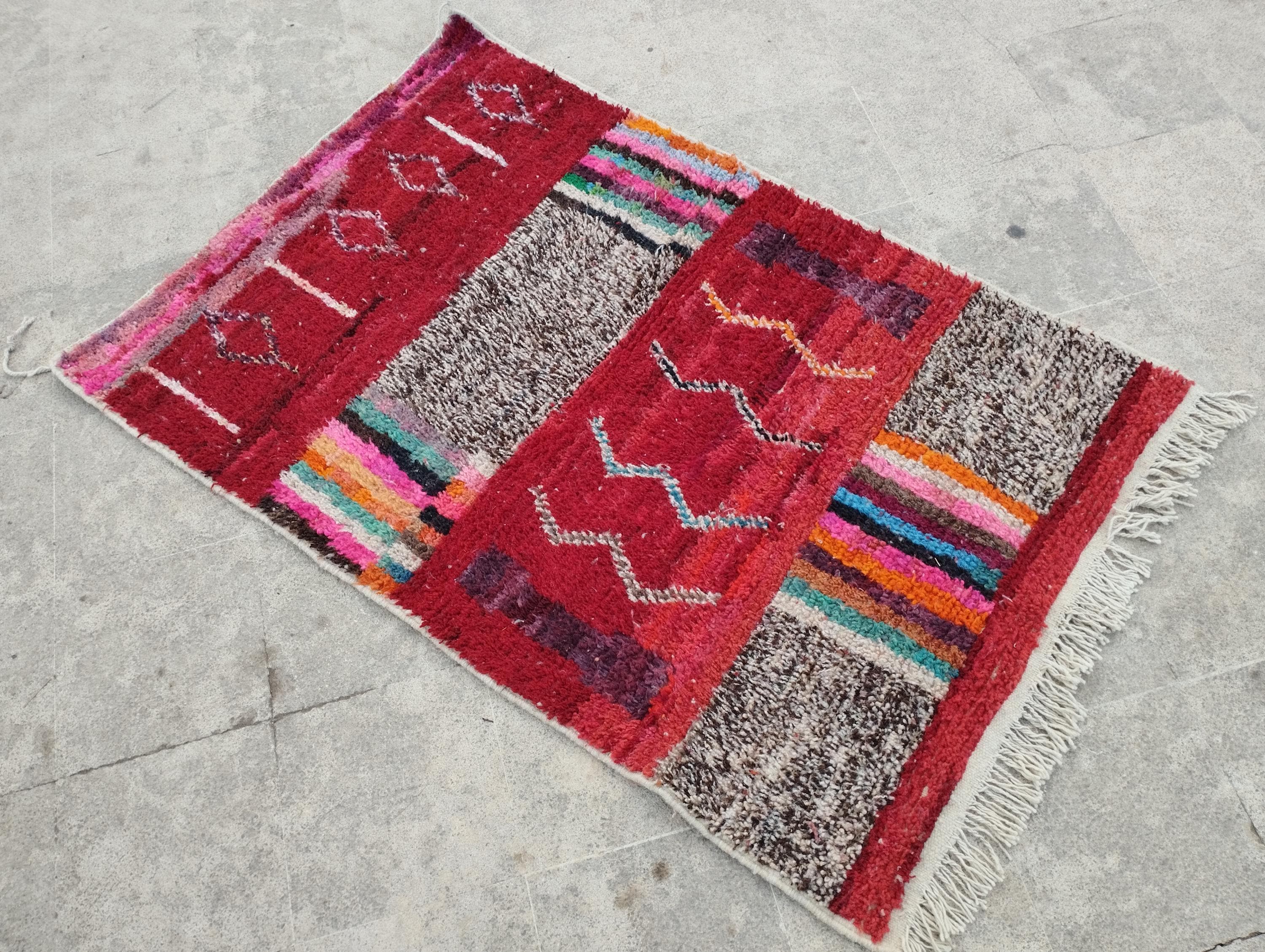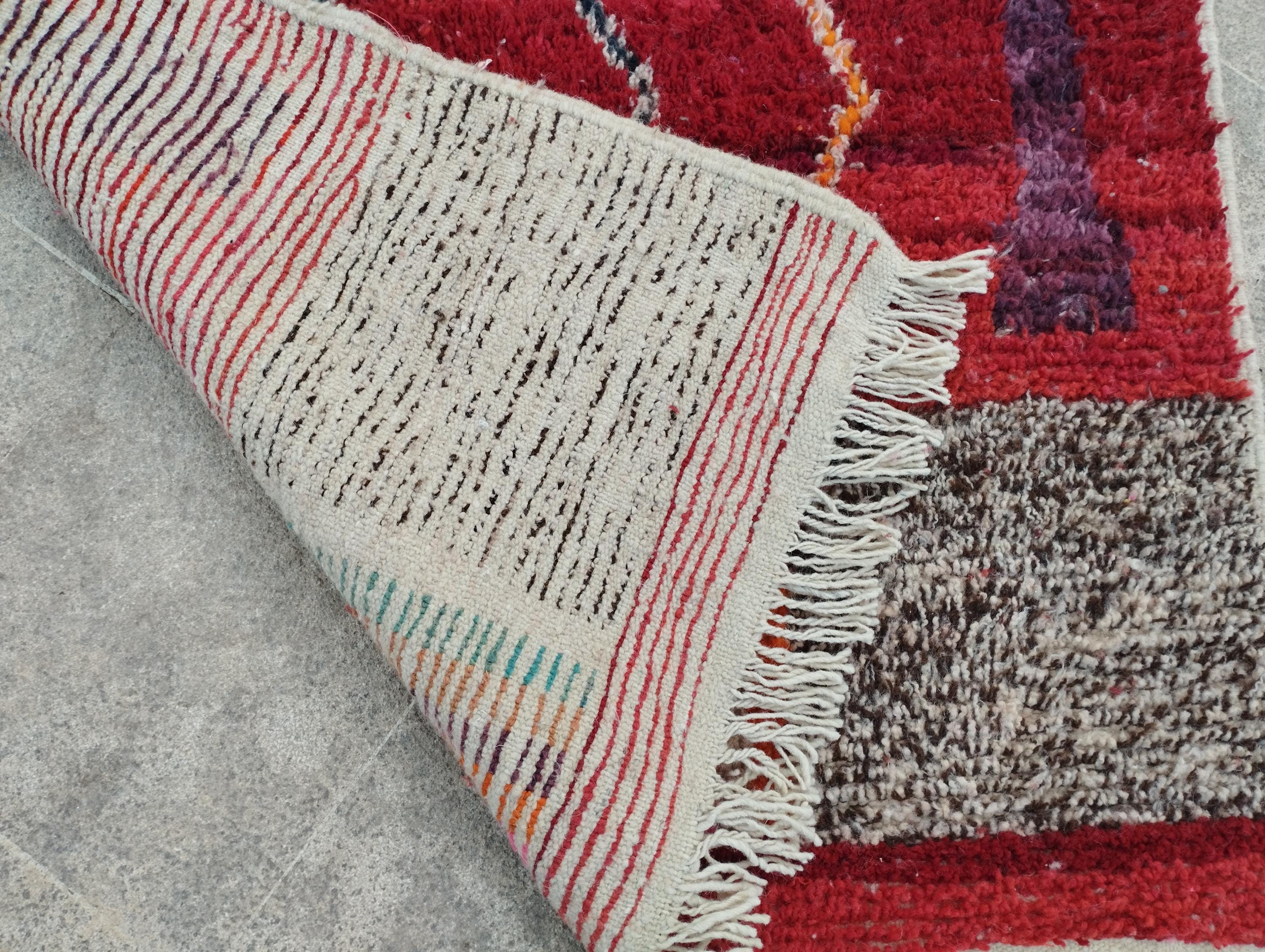 Our beni ourain rug design brings a cozy and timeless boho rug vibe to any room. The handmade rug is soft and durable, making it a practical addition to high-traffic areas and ideal for all indoor spaces. Every wool rug is constructed with care, embracing slight variations in pattern and color for a truly unique piece.red multi-color rug