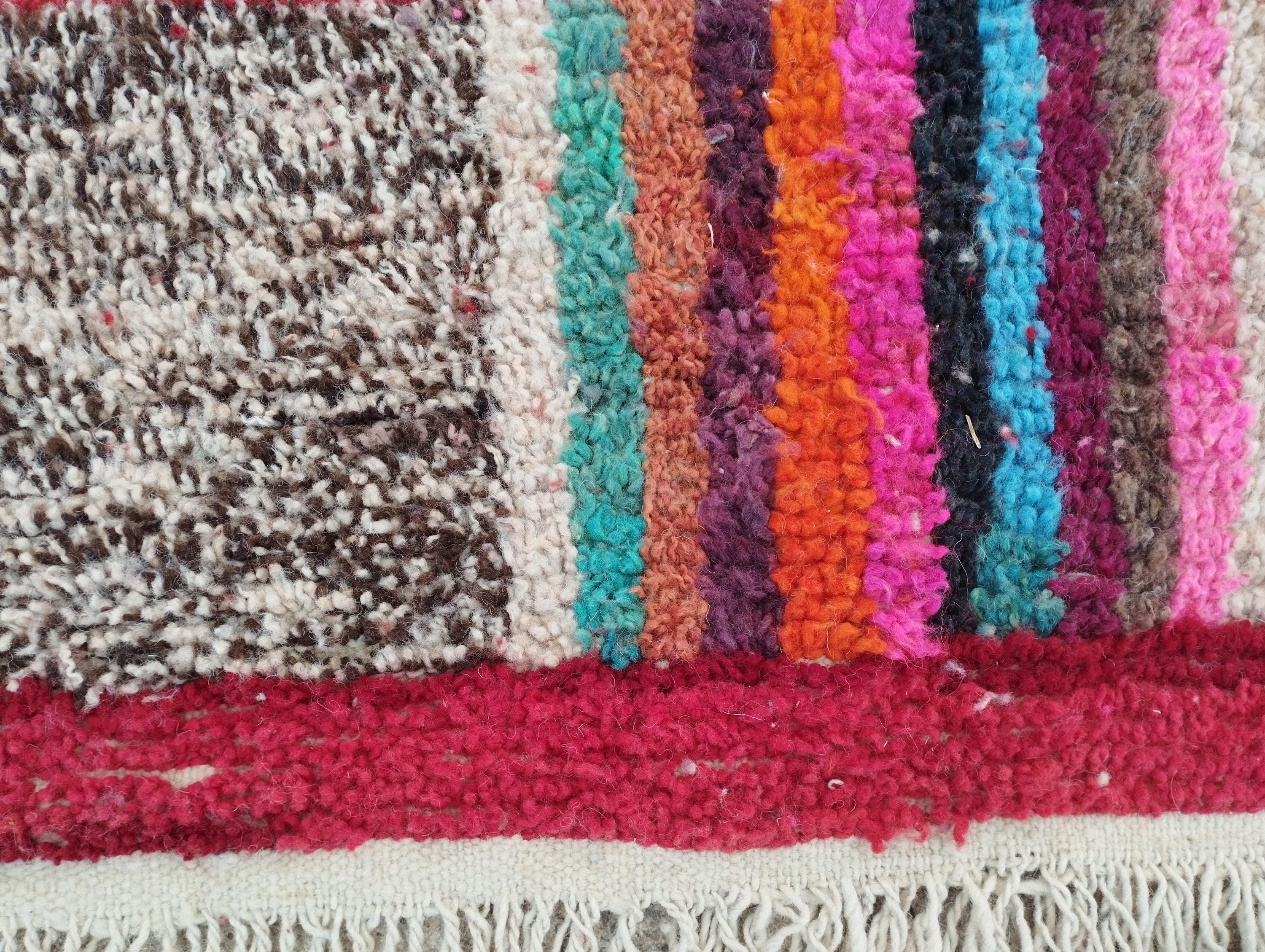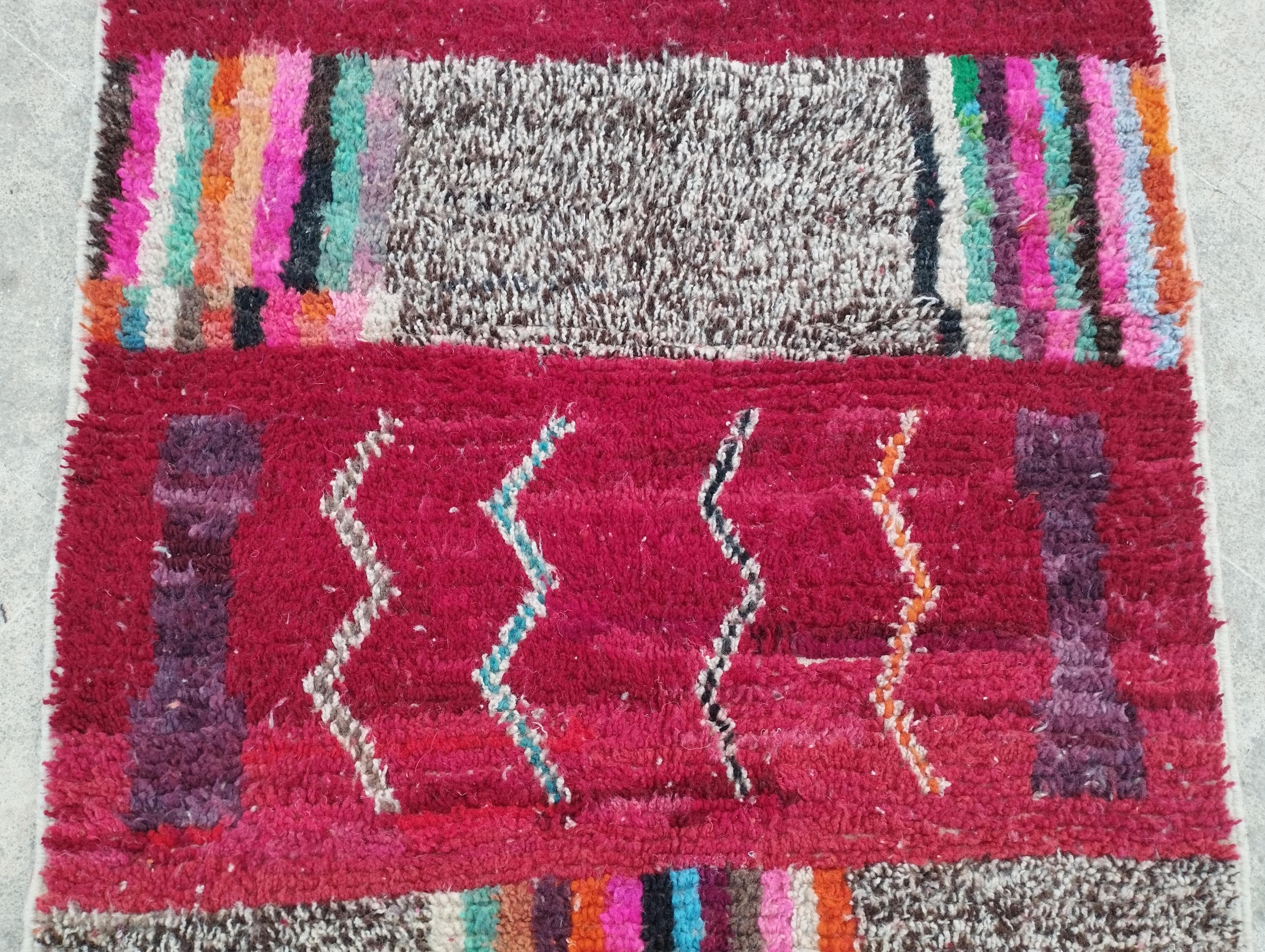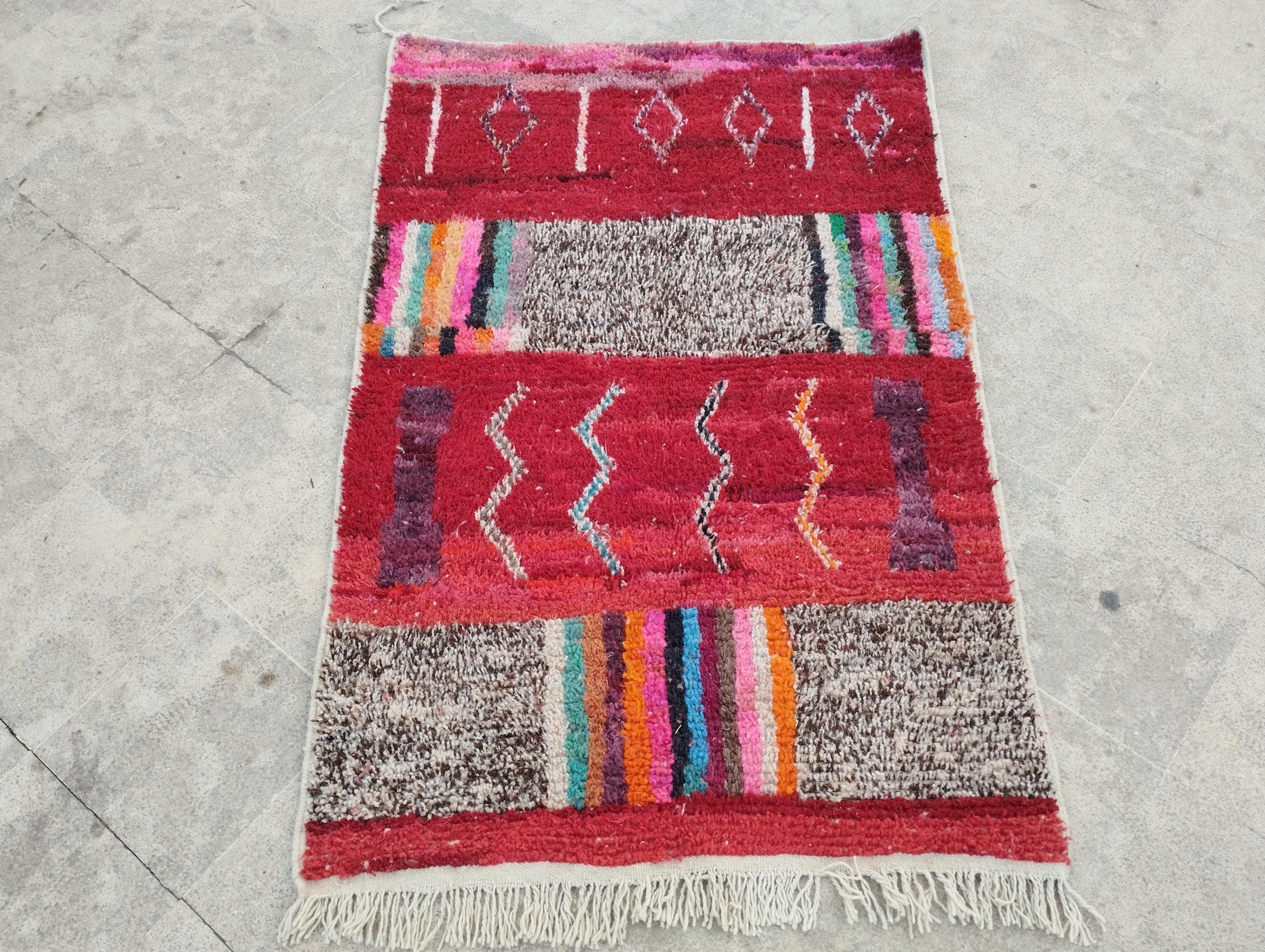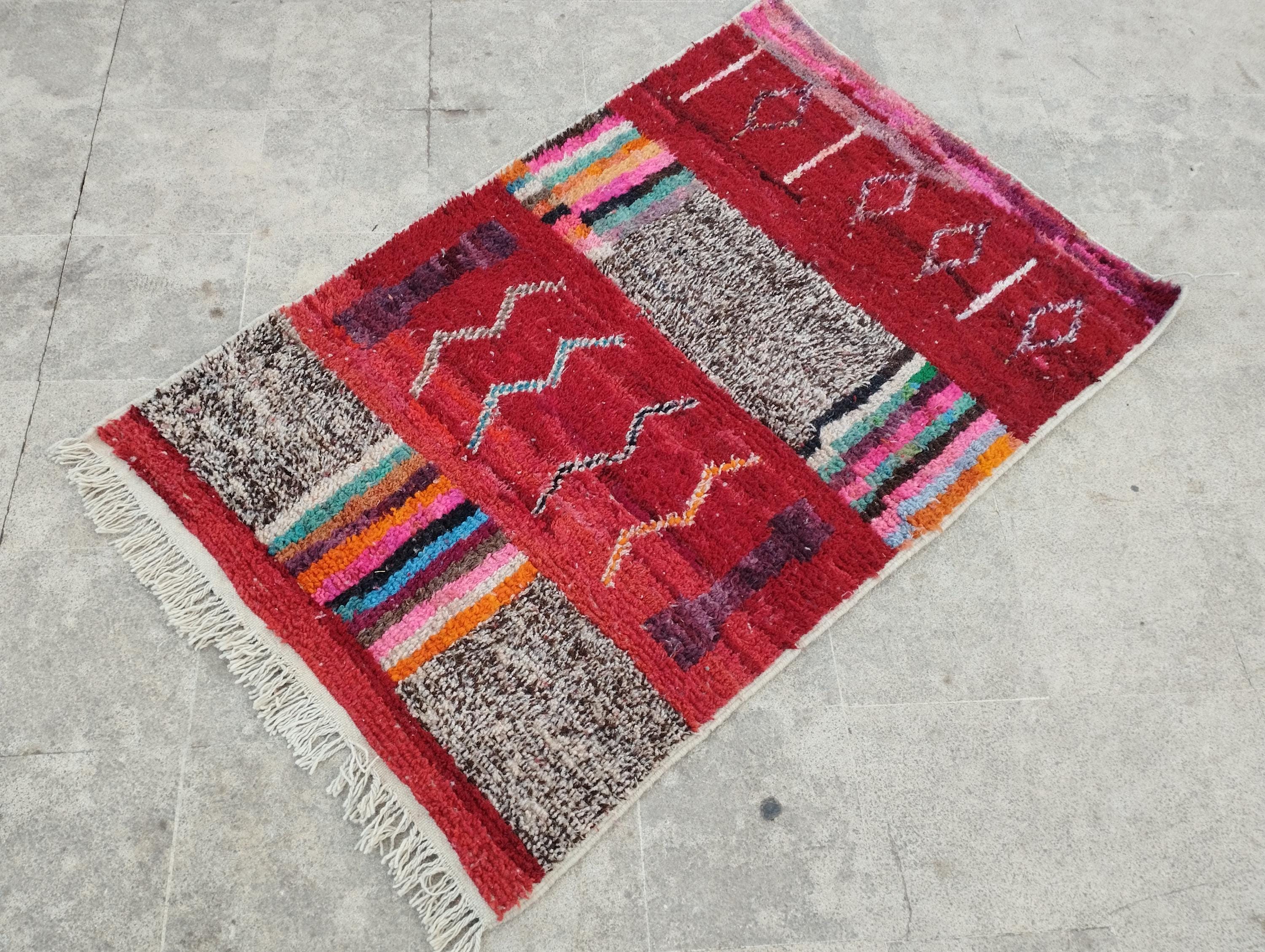 Our beni ourain rug design brings a cozy and timeless boho rug vibe to any room. The handmade rug is soft and durable, making it a practical addition to high-traffic areas and ideal for all indoor spaces. Every wool rug is constructed with care, embracing slight variations in pattern and color for a truly unique piece.red multi-color rug