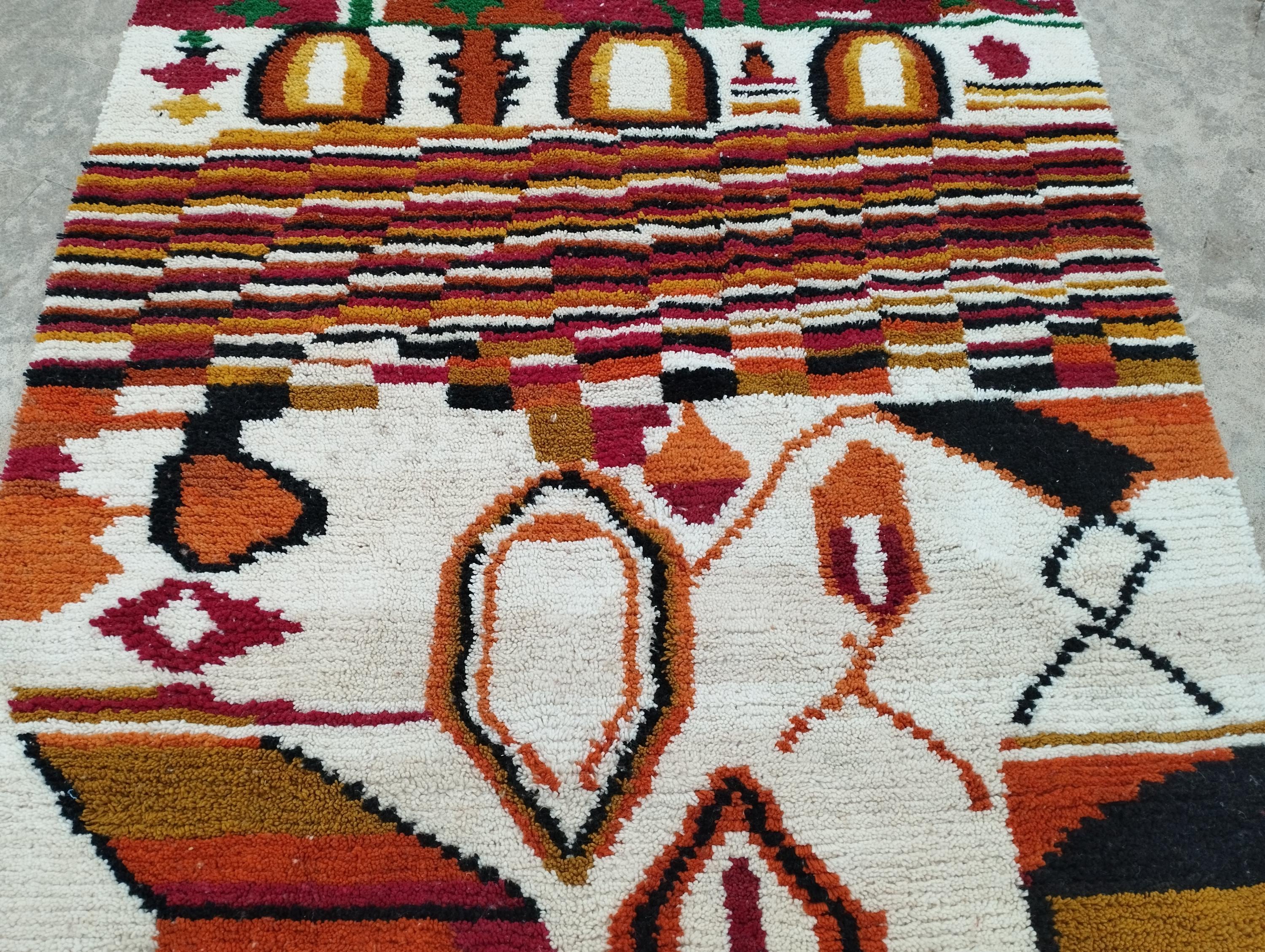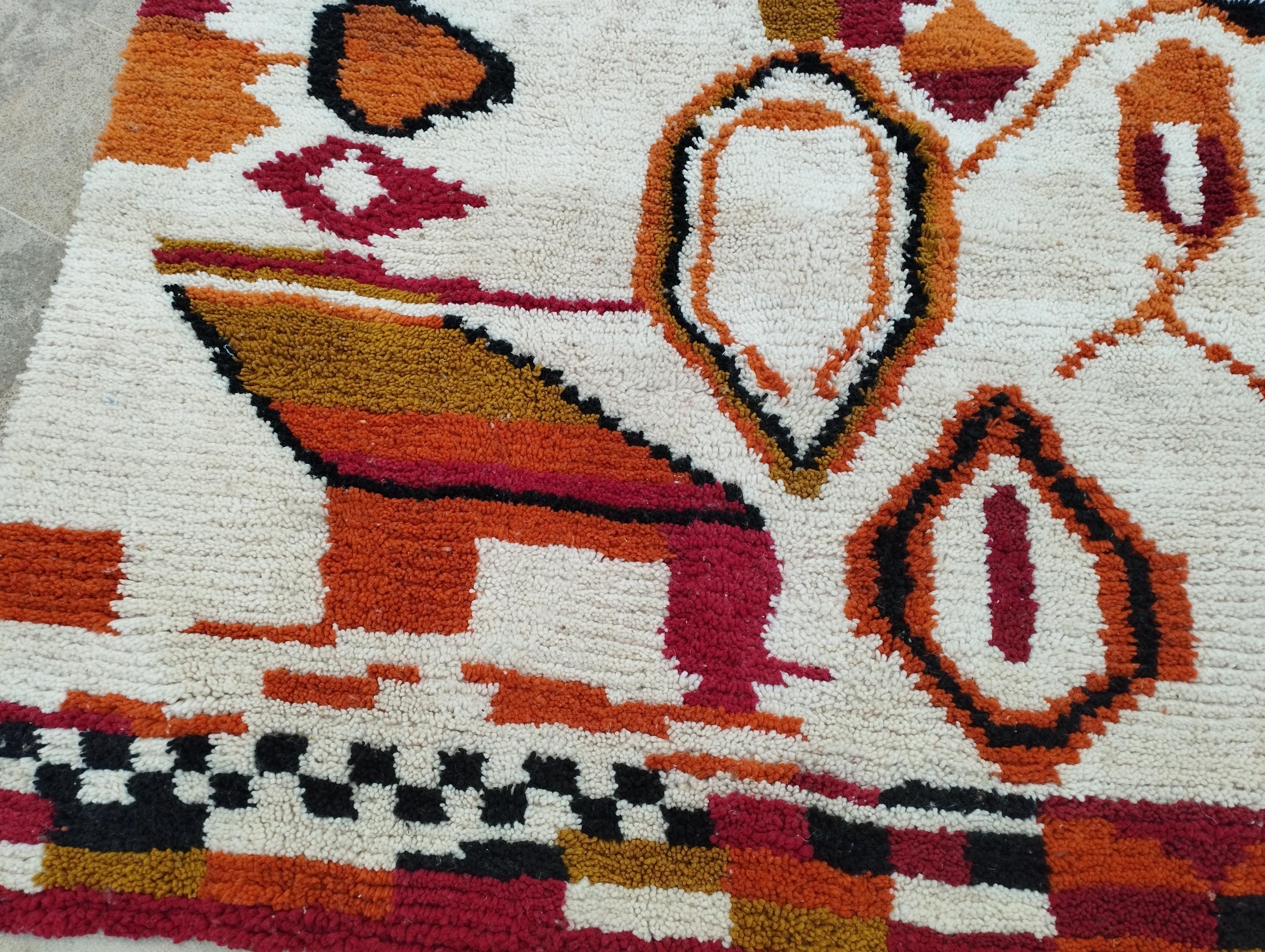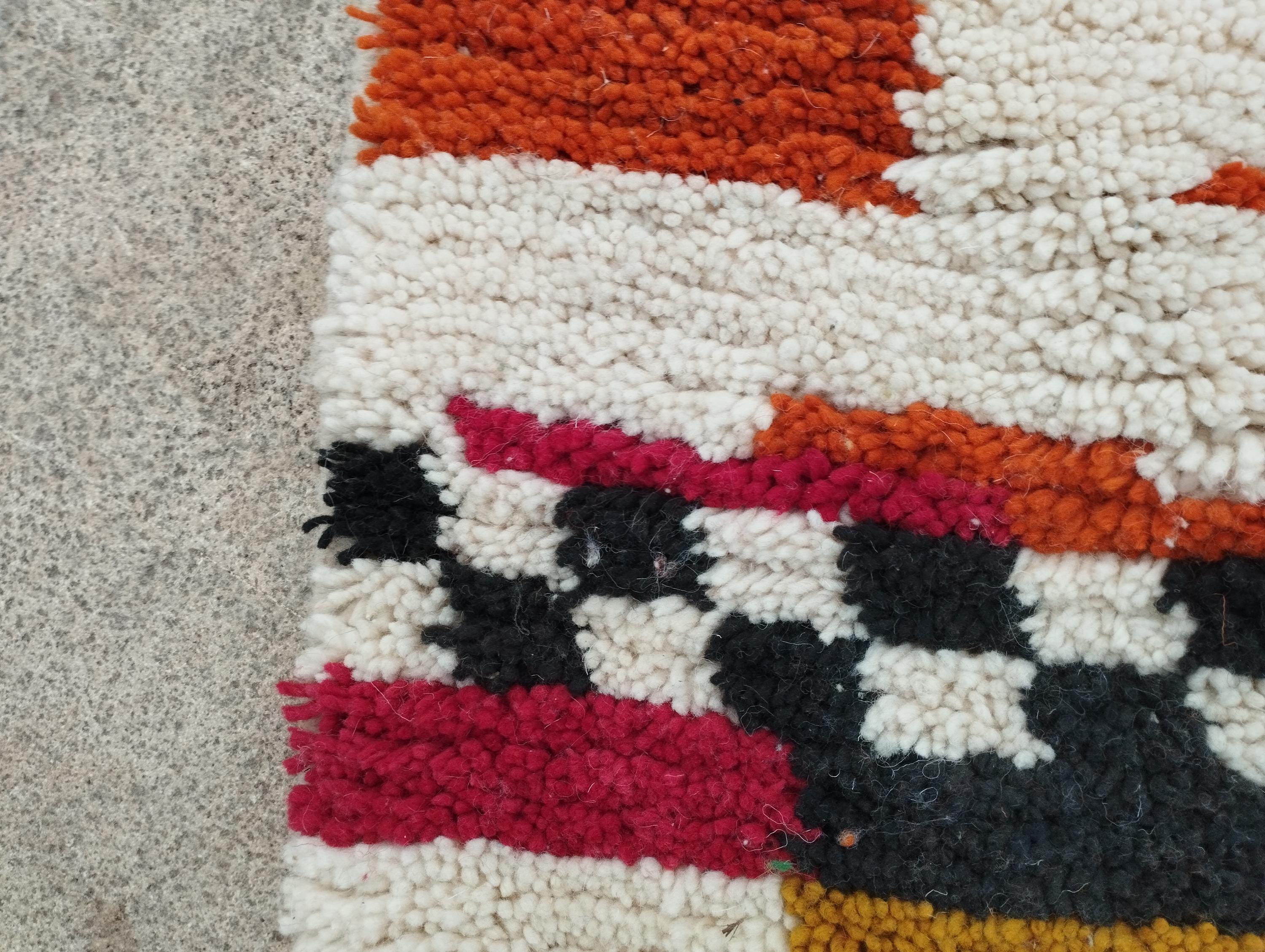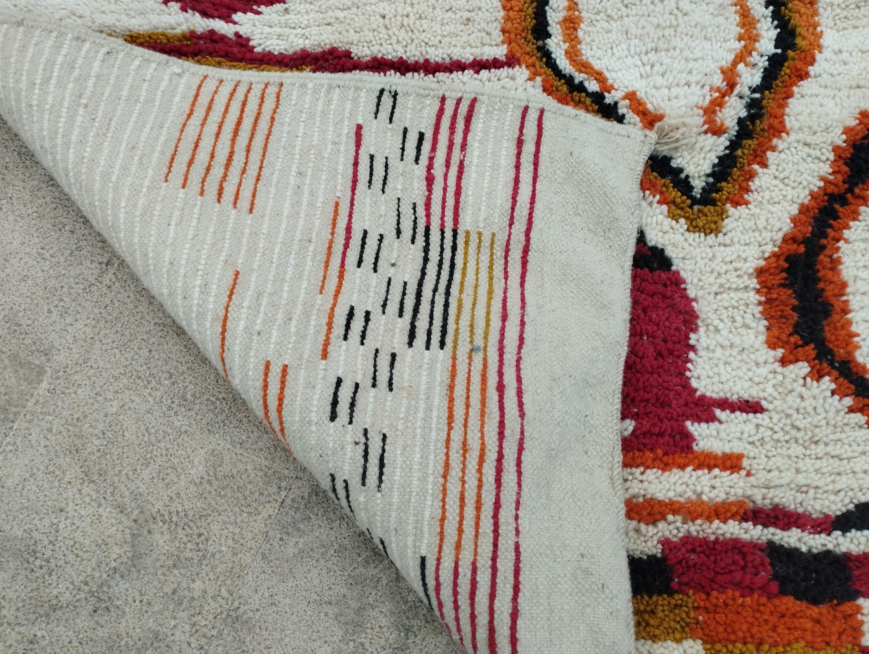 Our beni ourain rug design brings a cozy and timeless boho rug vibe to any room. The handmade rug is soft and durable, making it a practical addition to high-traffic areas and ideal for all indoor spaces. Every wool rug is constructed with care, embracing slight variations in pattern and color for a truly unique piece.red multi-color rug