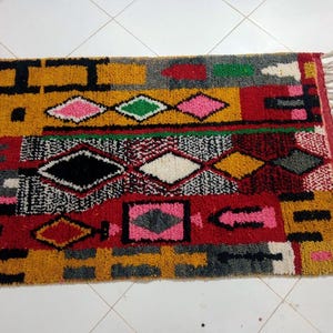 Our beni ourain rug design brings a cozy and timeless boho rug vibe to any room. The handmade rug is soft and durable, making it a practical addition to high-traffic areas and ideal for all indoor spaces. Every wool rug is constructed with care, embracing slight variations in pattern and color for a truly unique piece.red multi-color rug