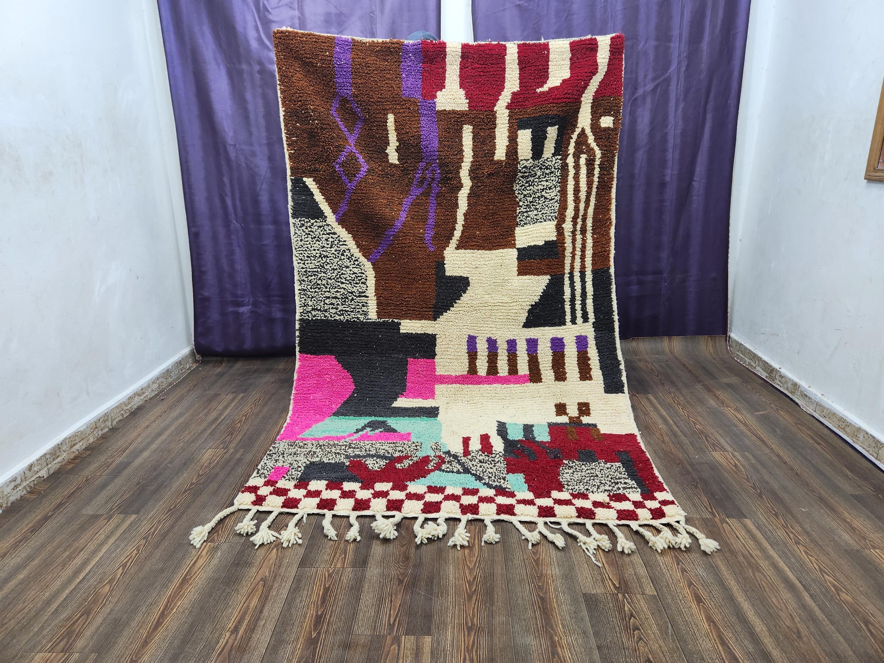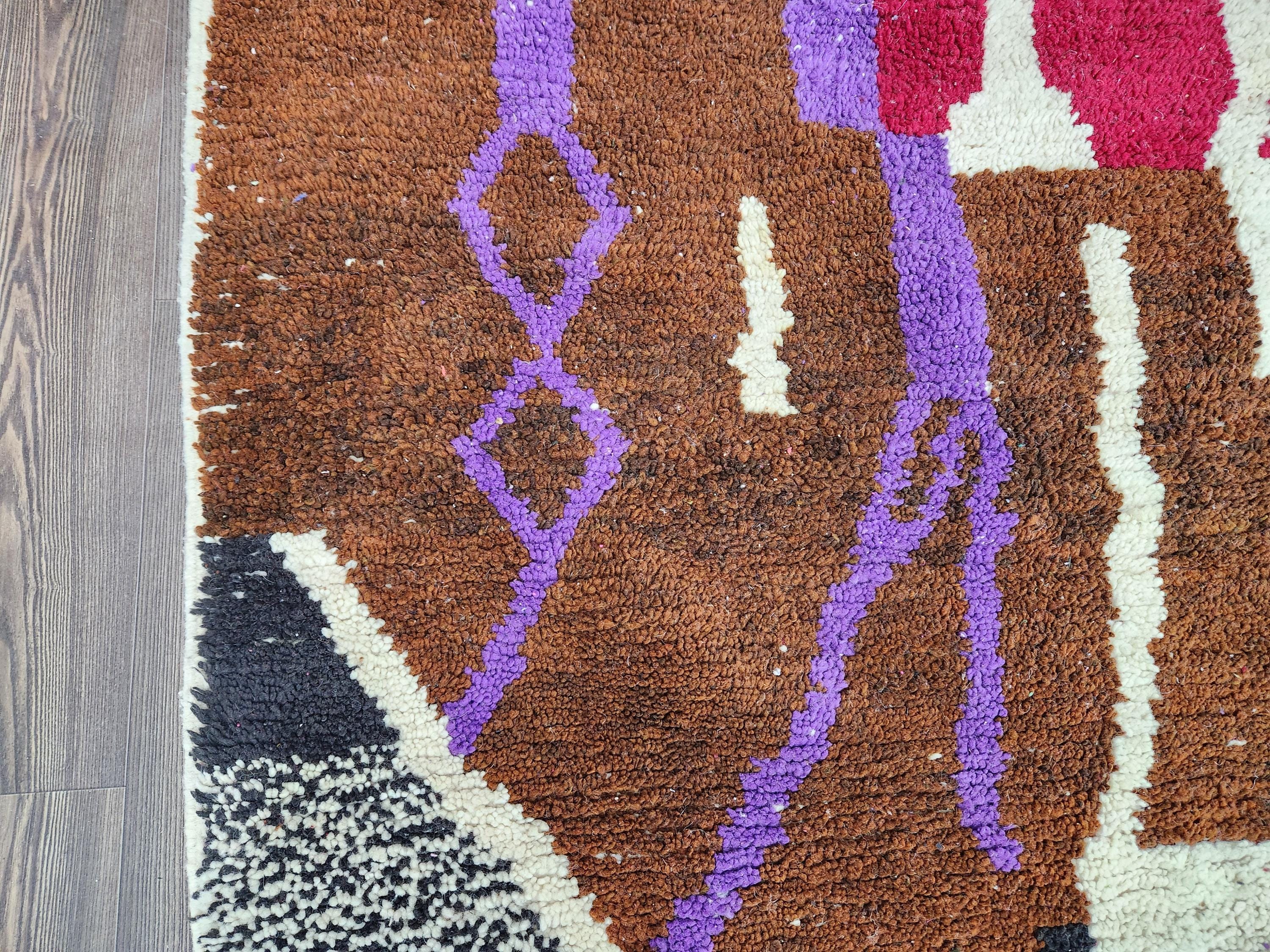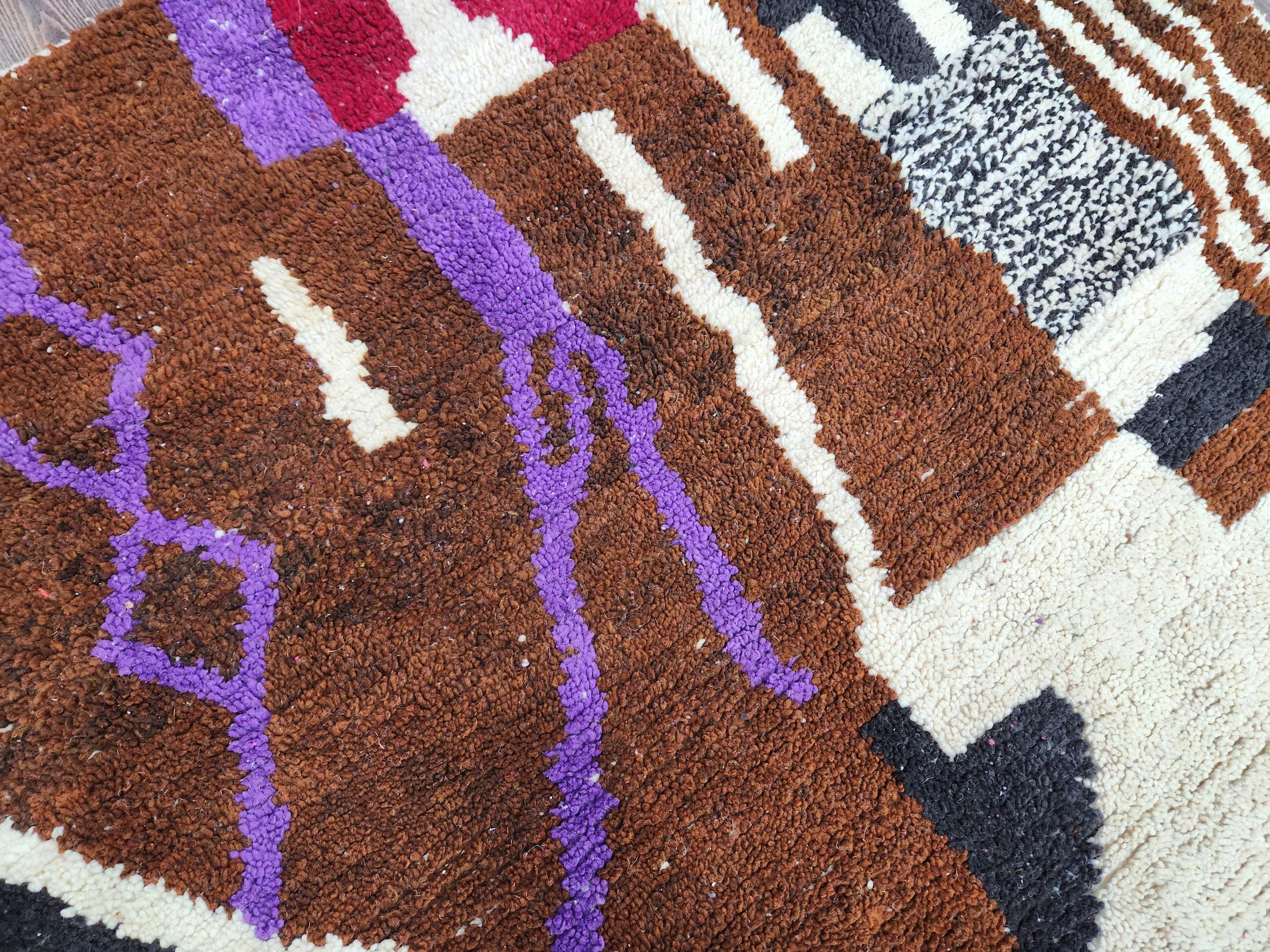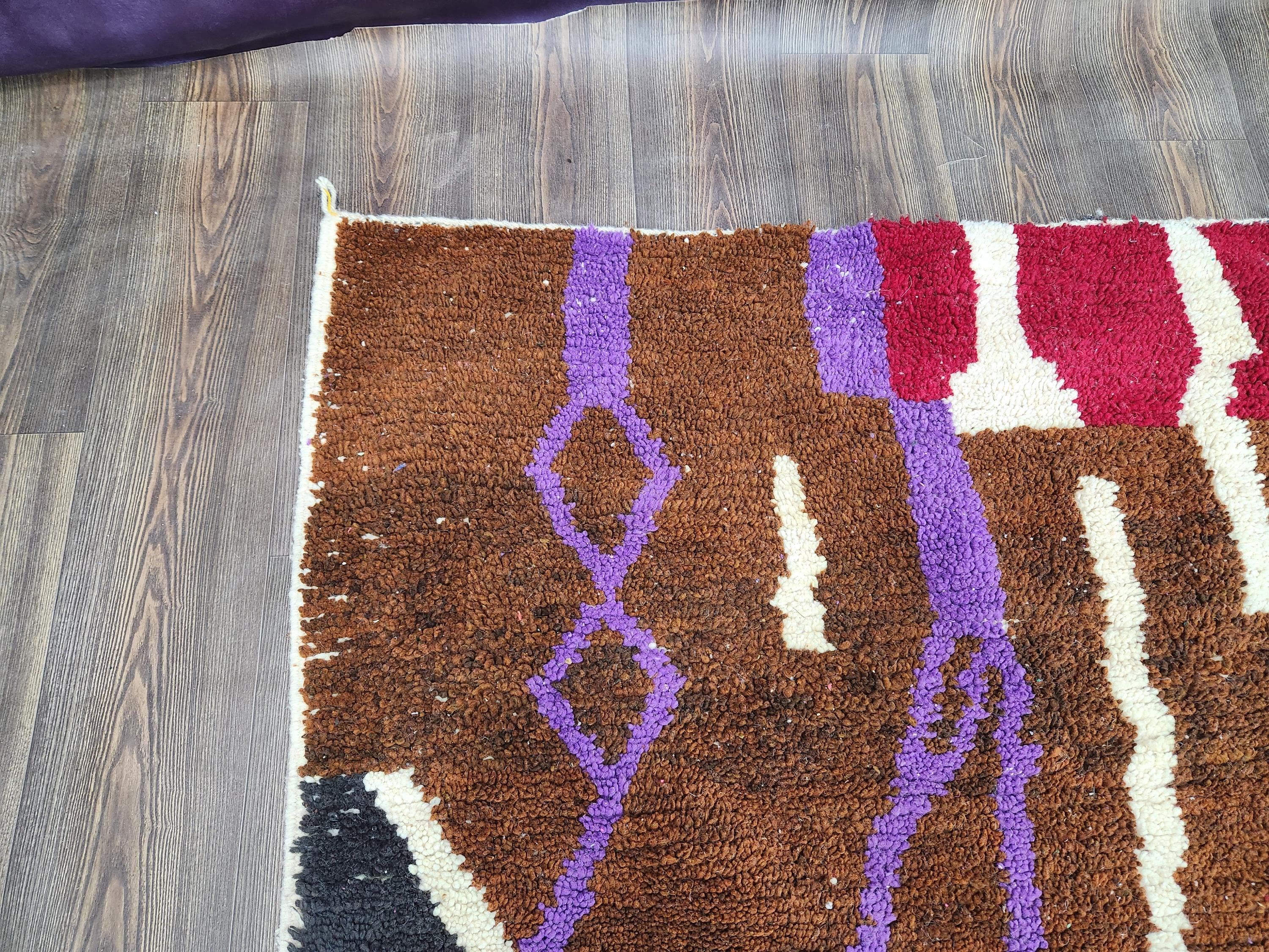 A Moroccan Berber colorful rugaziz rug is a traditional handwoven atlas rug that originates from the indigenous Berber people of Morocco. These rugs are known for their intricate patterns and bold, geometric designs, crafted using a variety of natural dyes and high-quality atlas mountains wool. Each all wool rug features a soft shaggy texture, giving you comfort and warmth. burgundy border rug
