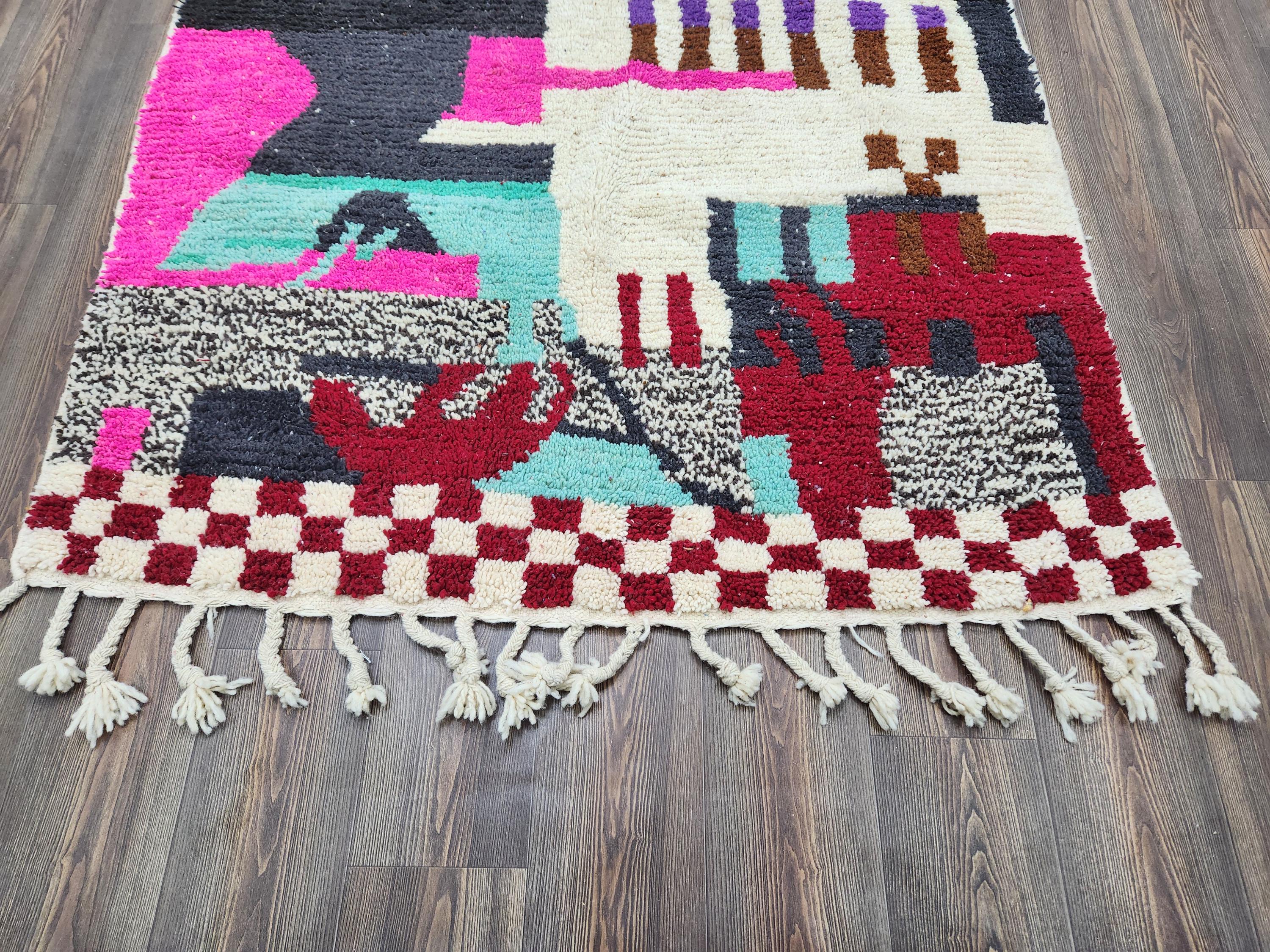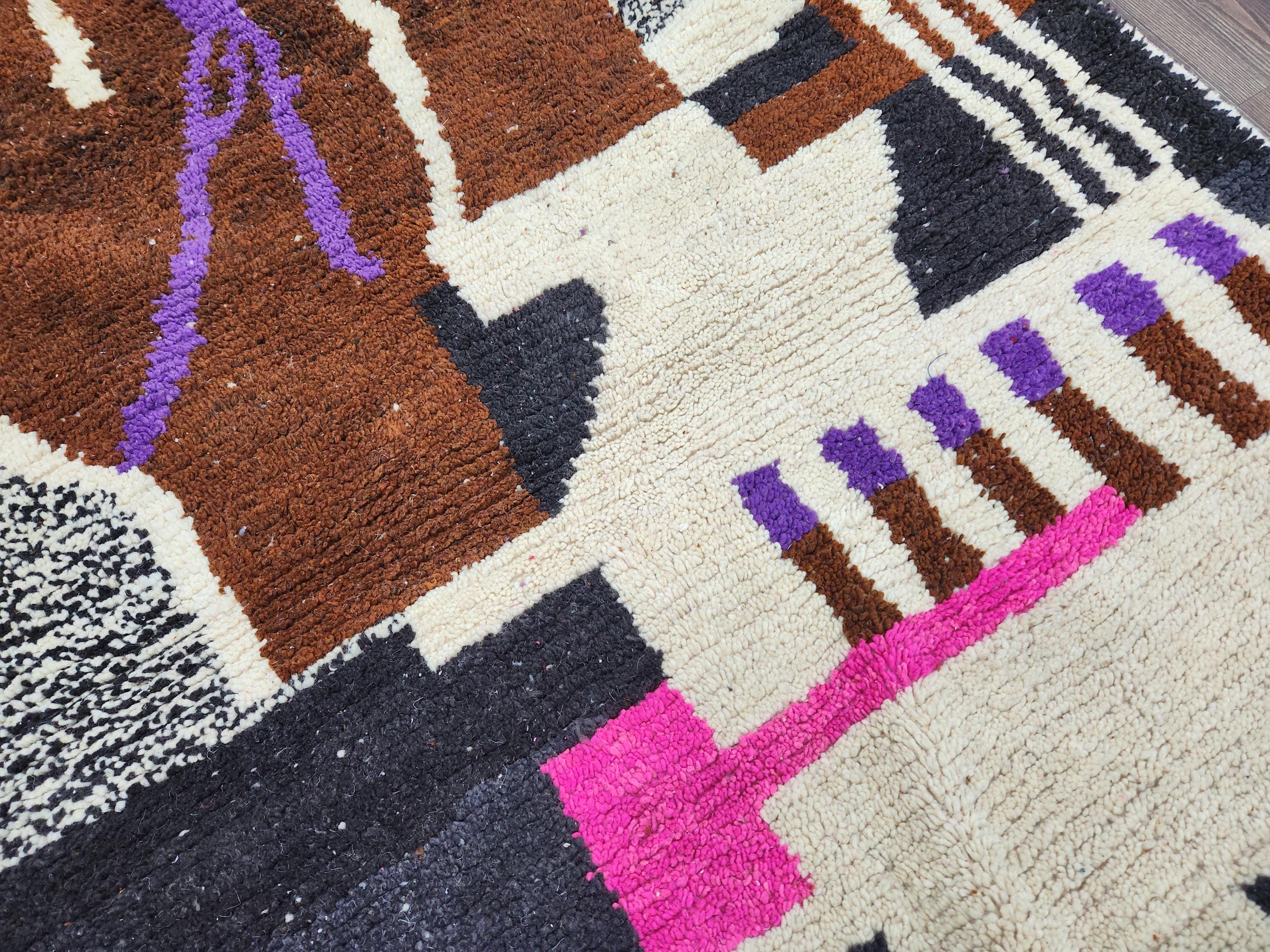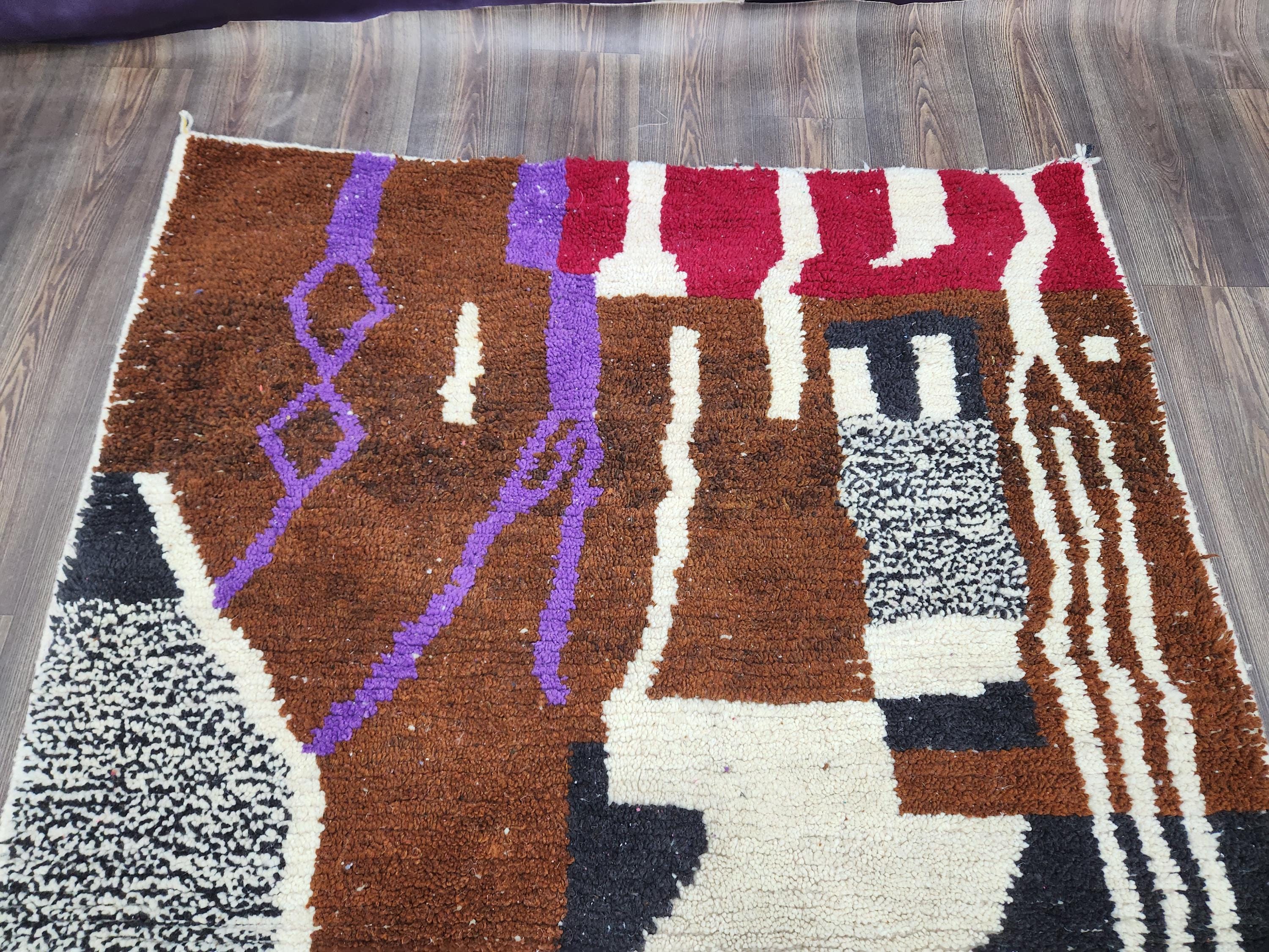 A Moroccan Berber colorful rugaziz rug is a traditional handwoven atlas rug that originates from the indigenous Berber people of Morocco. These rugs are known for their intricate patterns and bold, geometric designs, crafted using a variety of natural dyes and high-quality atlas mountains wool. Each all wool rug features a soft shaggy texture, giving you comfort and warmth. burgundy border rug