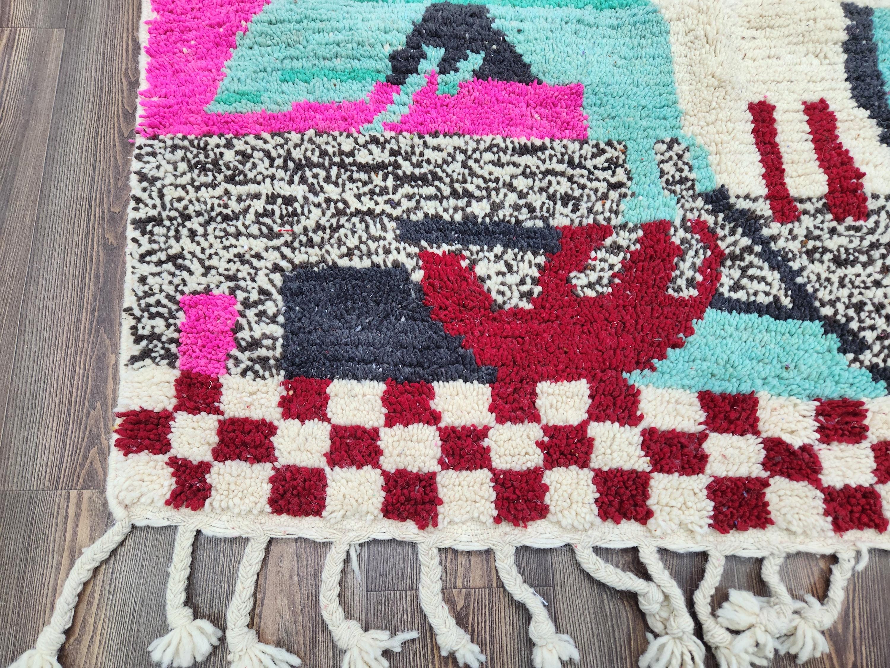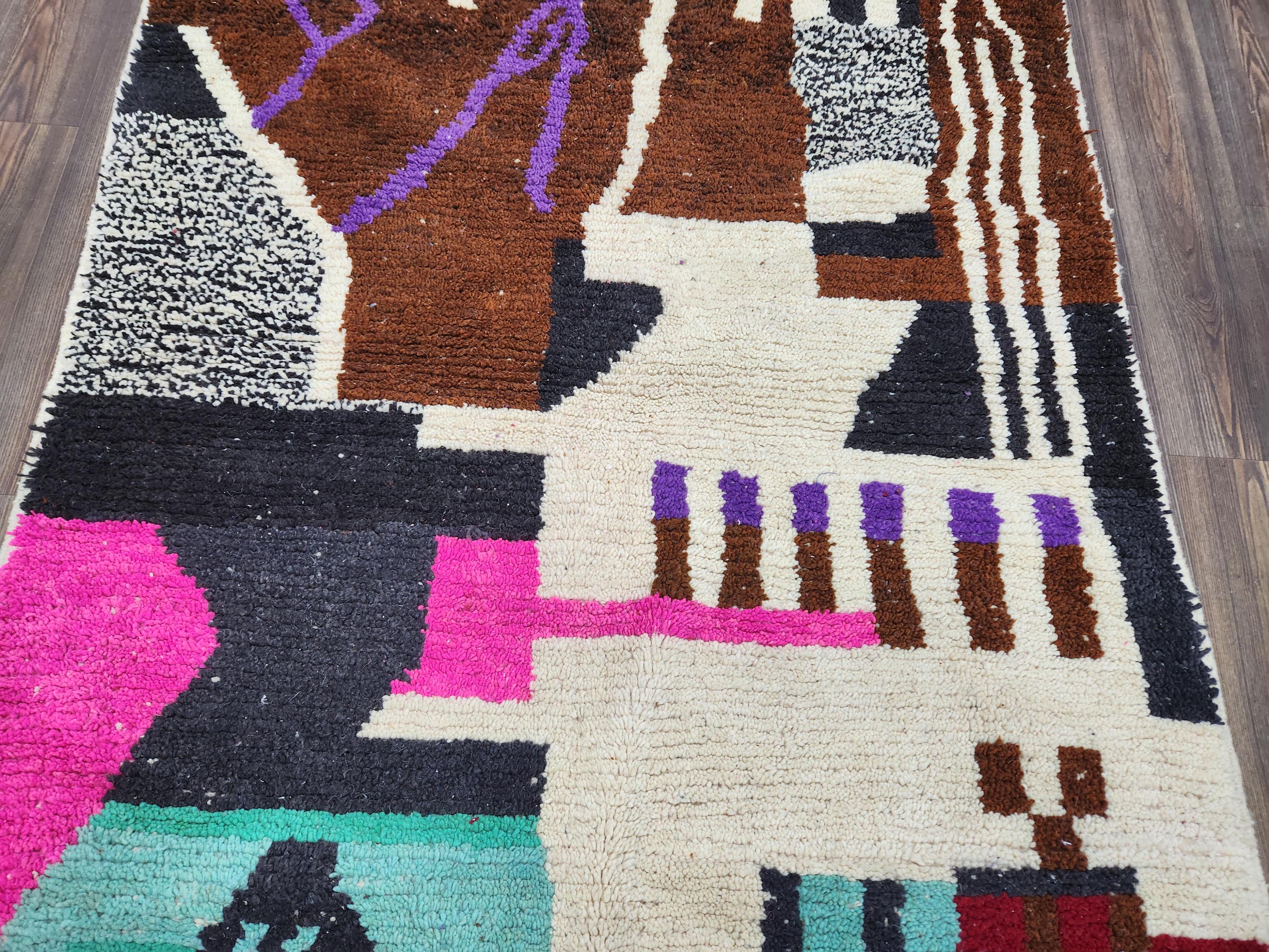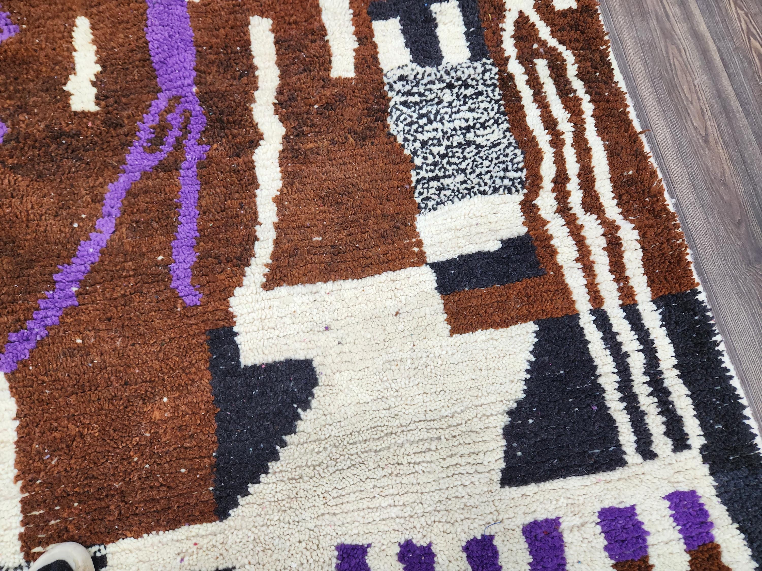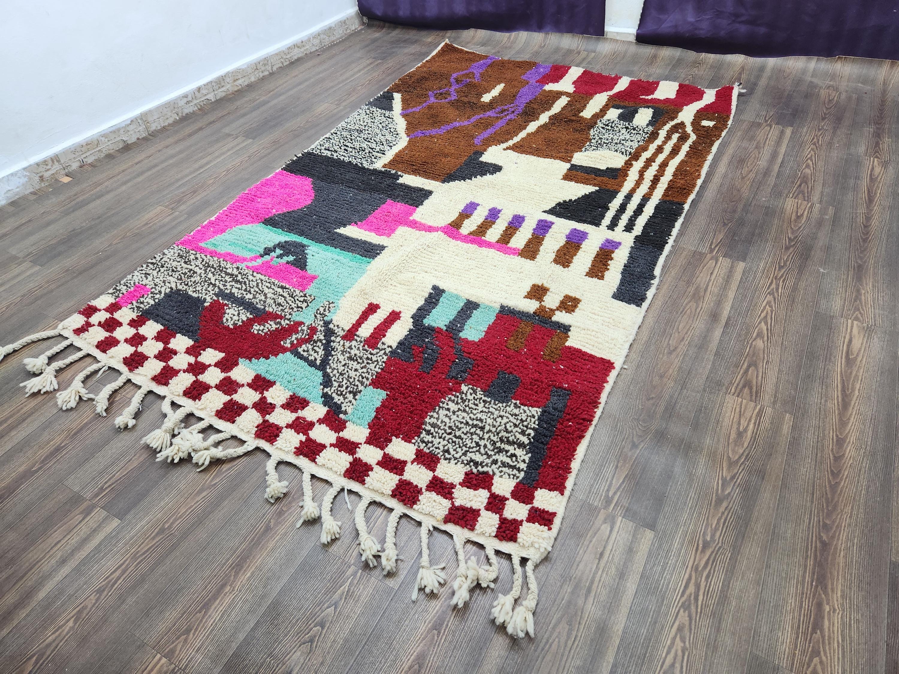 A Moroccan Berber colorful rugaziz rug is a traditional handwoven atlas rug that originates from the indigenous Berber people of Morocco. These rugs are known for their intricate patterns and bold, geometric designs, crafted using a variety of natural dyes and high-quality atlas mountains wool. Each all wool rug features a soft shaggy texture, giving you comfort and warmth. burgundy border rug