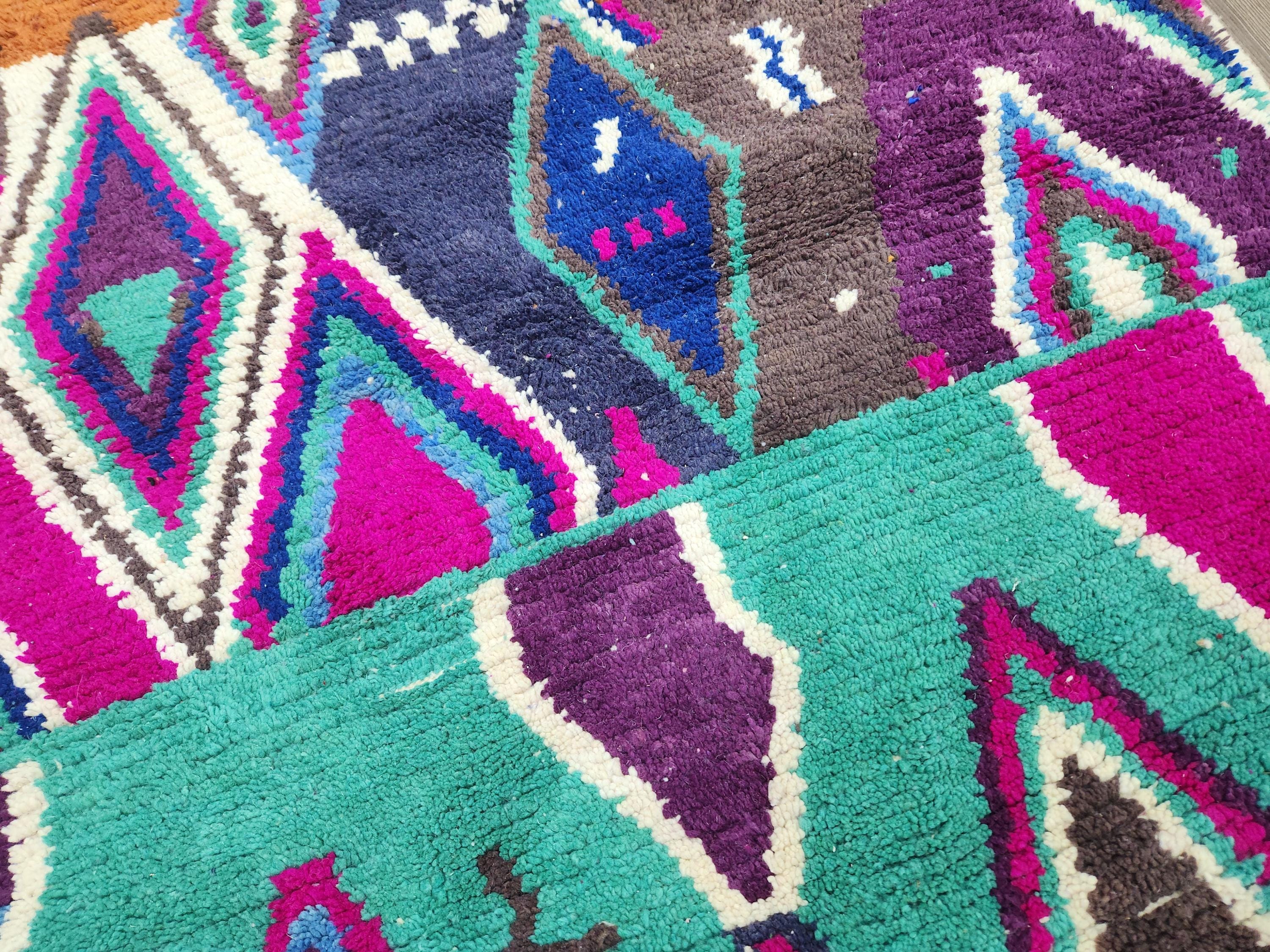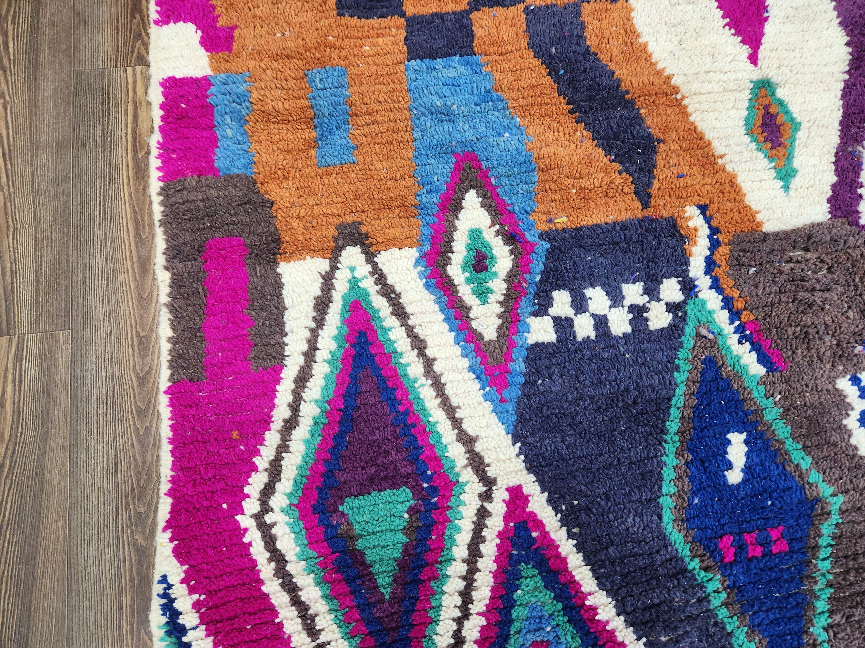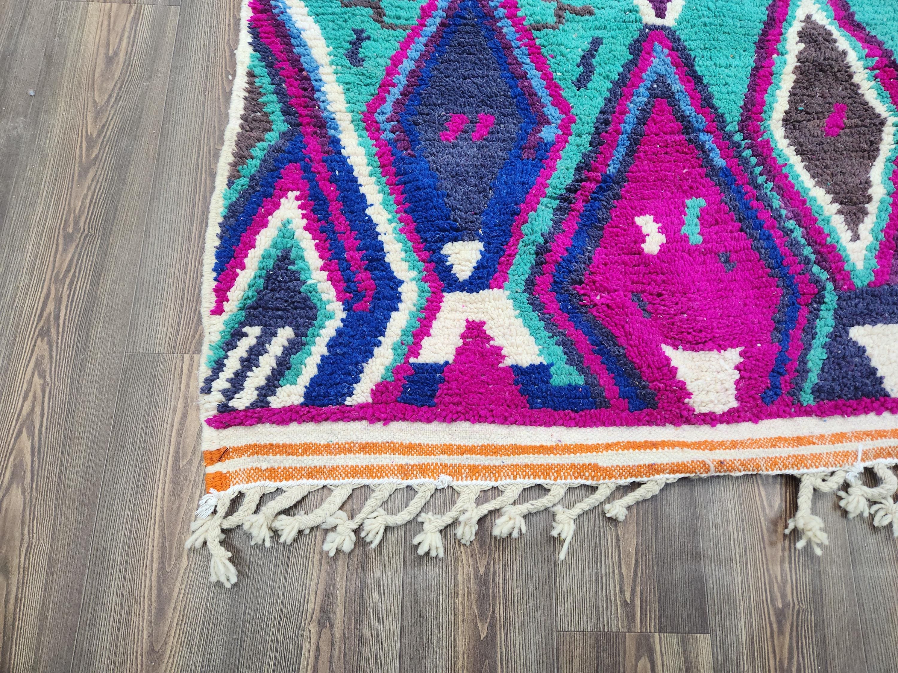 A Moroccan Berber colorful rugaziz rug is a traditional handwoven atlas rug that originates from the indigenous Berber people of Morocco. These rugs are known for their intricate patterns and bold, geometric designs, crafted using a variety of natural dyes and high-quality atlas mountains wool. Each all wool rug features a soft shaggy texture, giving you comfort and warmth. burgundy border rug
