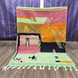 Discover the vibrant spirit of Moroccan artistry with this handmade rug, inspired by boujaad home style and crafted from authentic berber textiles. The warm orange hues and bold geometric patterns create a captivating centerpiece that brings cozy charm to any room. This amazigh moroccan rug blends traditional craftsmanship with a modern bohemian touch, making each piece truly one of a kind.