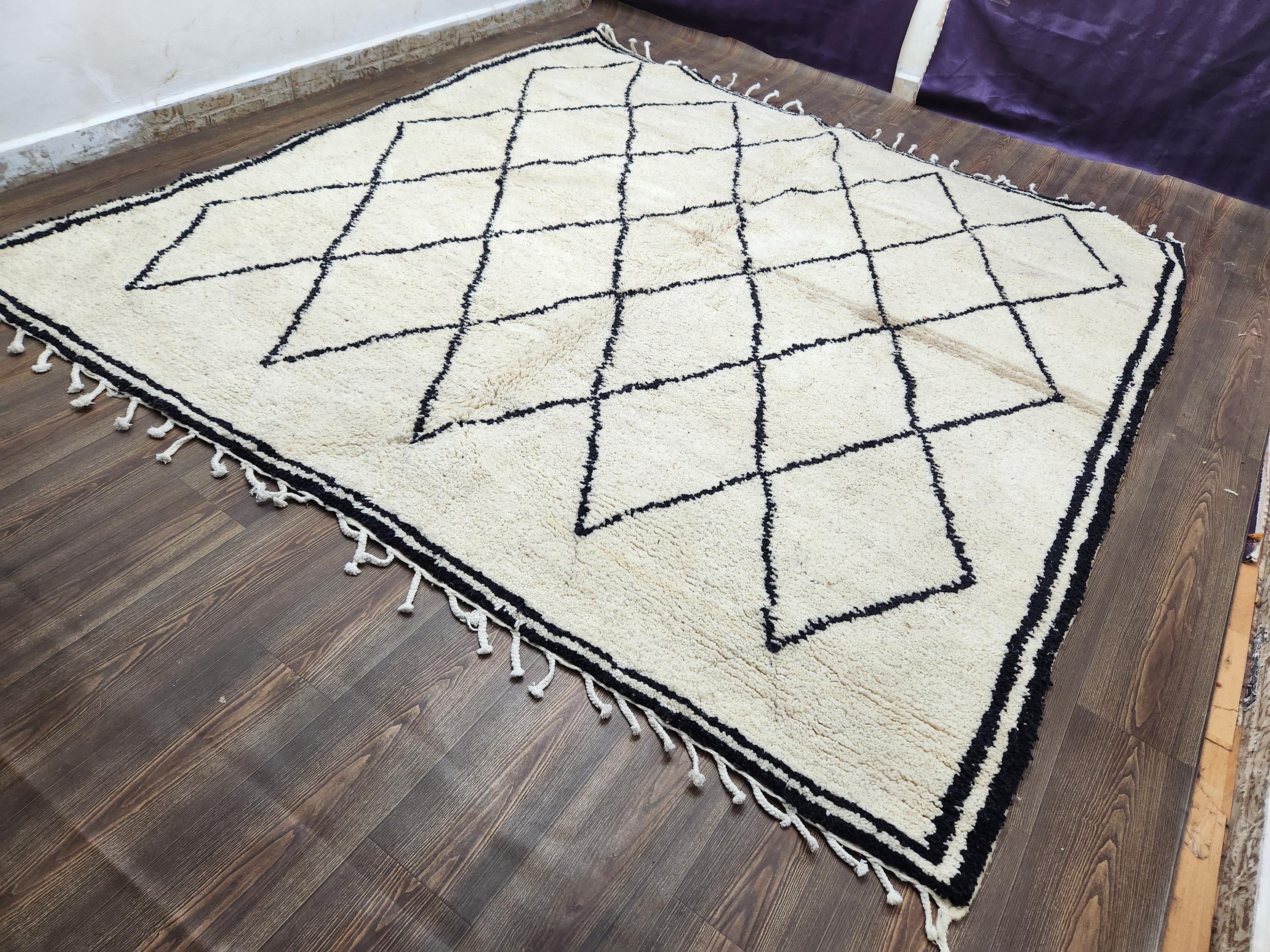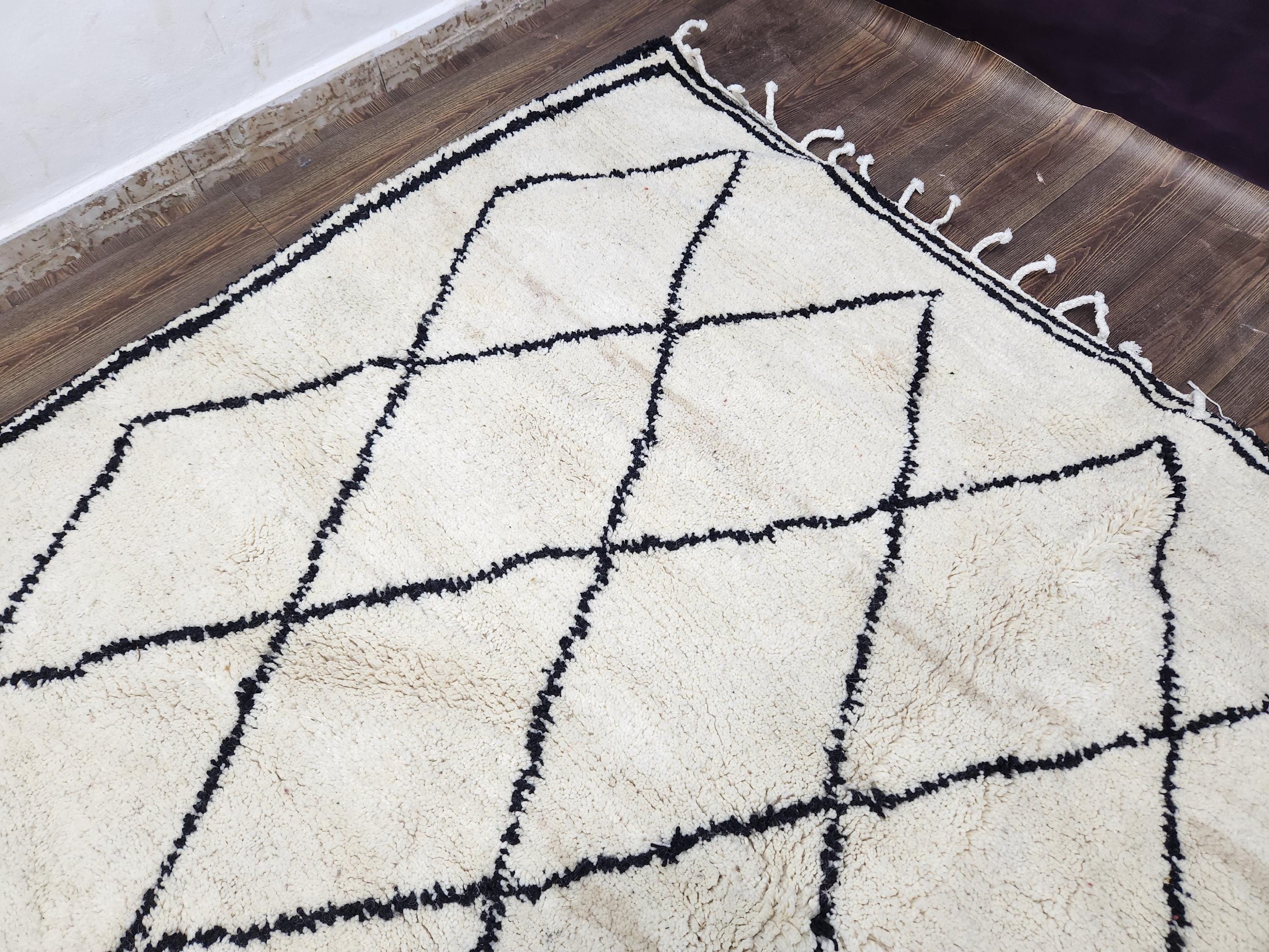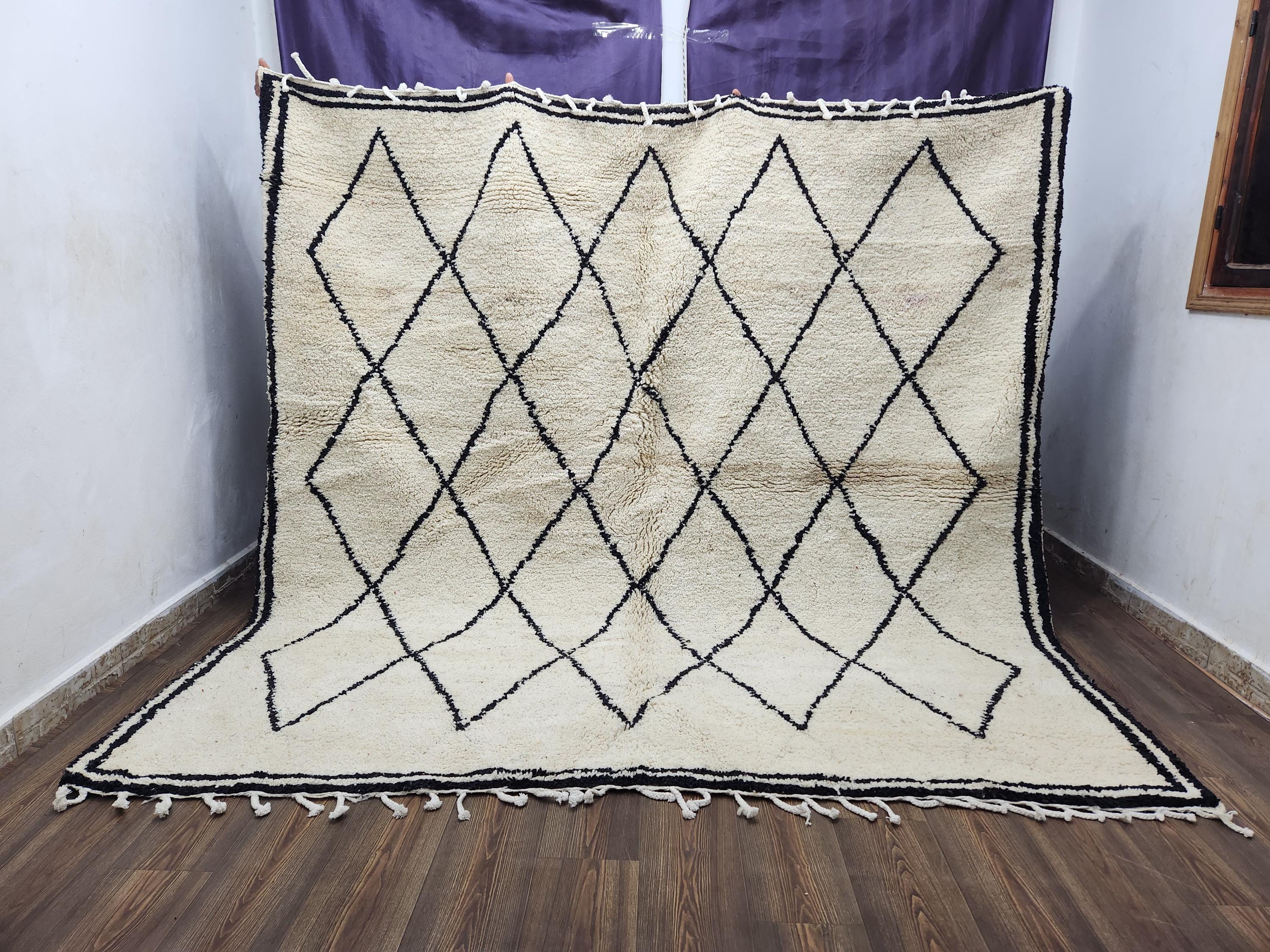 - ✅ Handwoven from premium sheep wool using authentic Moroccan techniques - ✅ Measures approximately 7x9 feet, with custom size options available - ✅ Durable hand tufted wool suitable for high-traffic indoor areas - ✅ Natural dyes create unique black and cream patterns with subtle variations