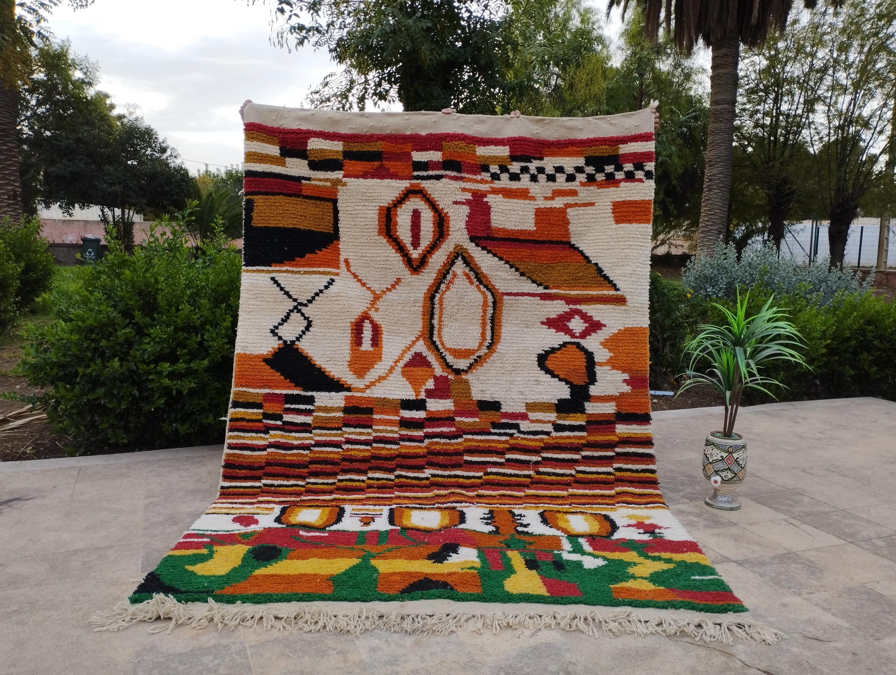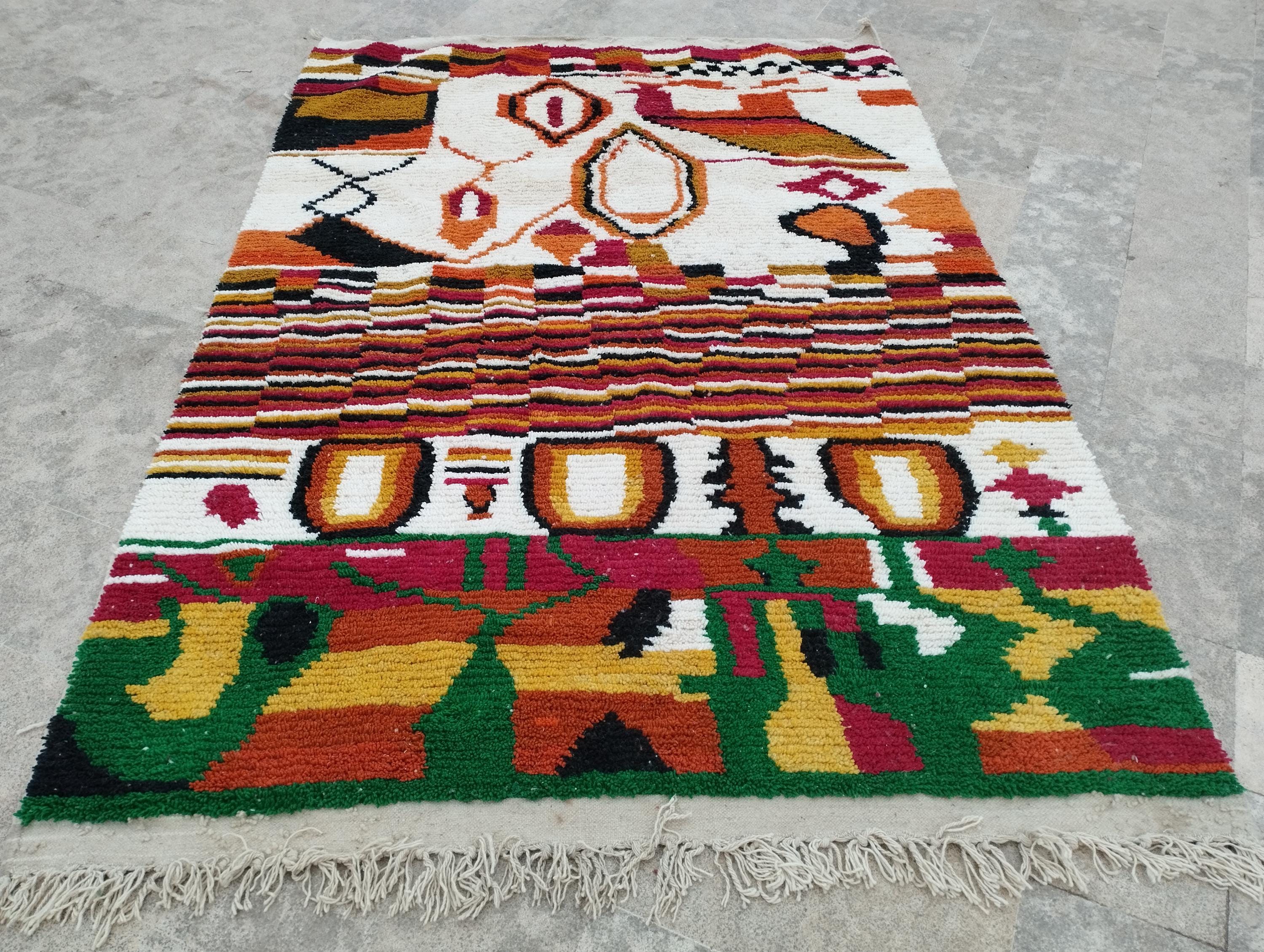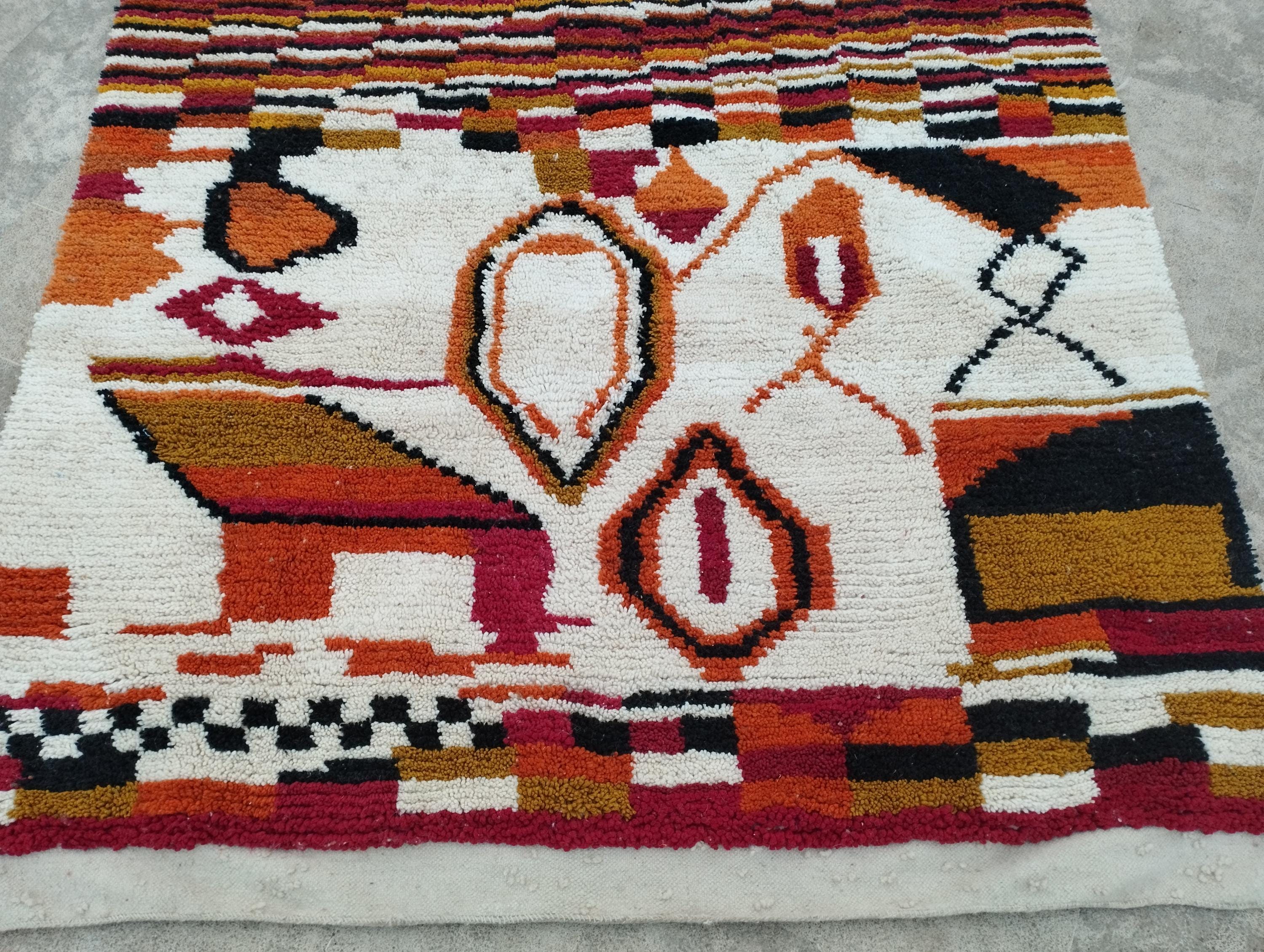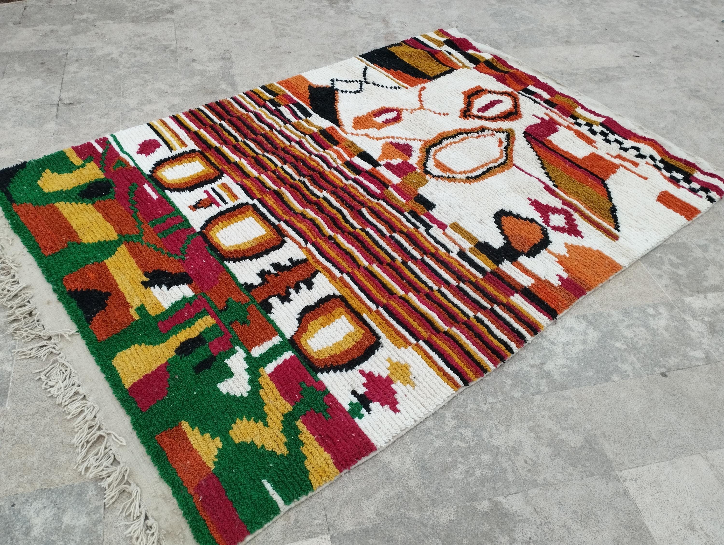 Bring warmth and authenticity into your home with this handwoven Moroccan Berber rug, a stunning example of boho home decor and tribal artistry. This colorful geometric rug features vibrant tones of red, orange, green, and black, making it a perfect statement piece for any living space.