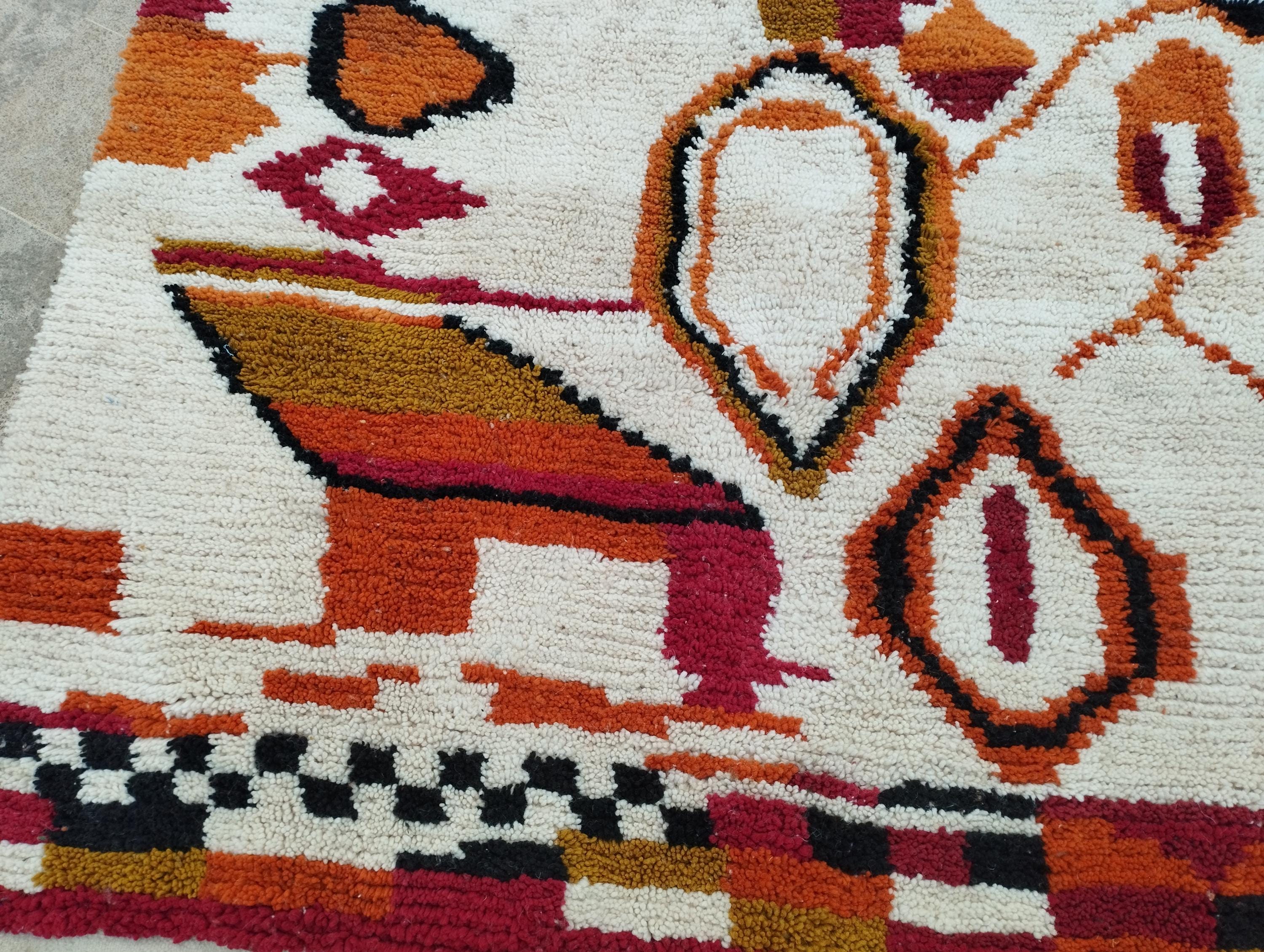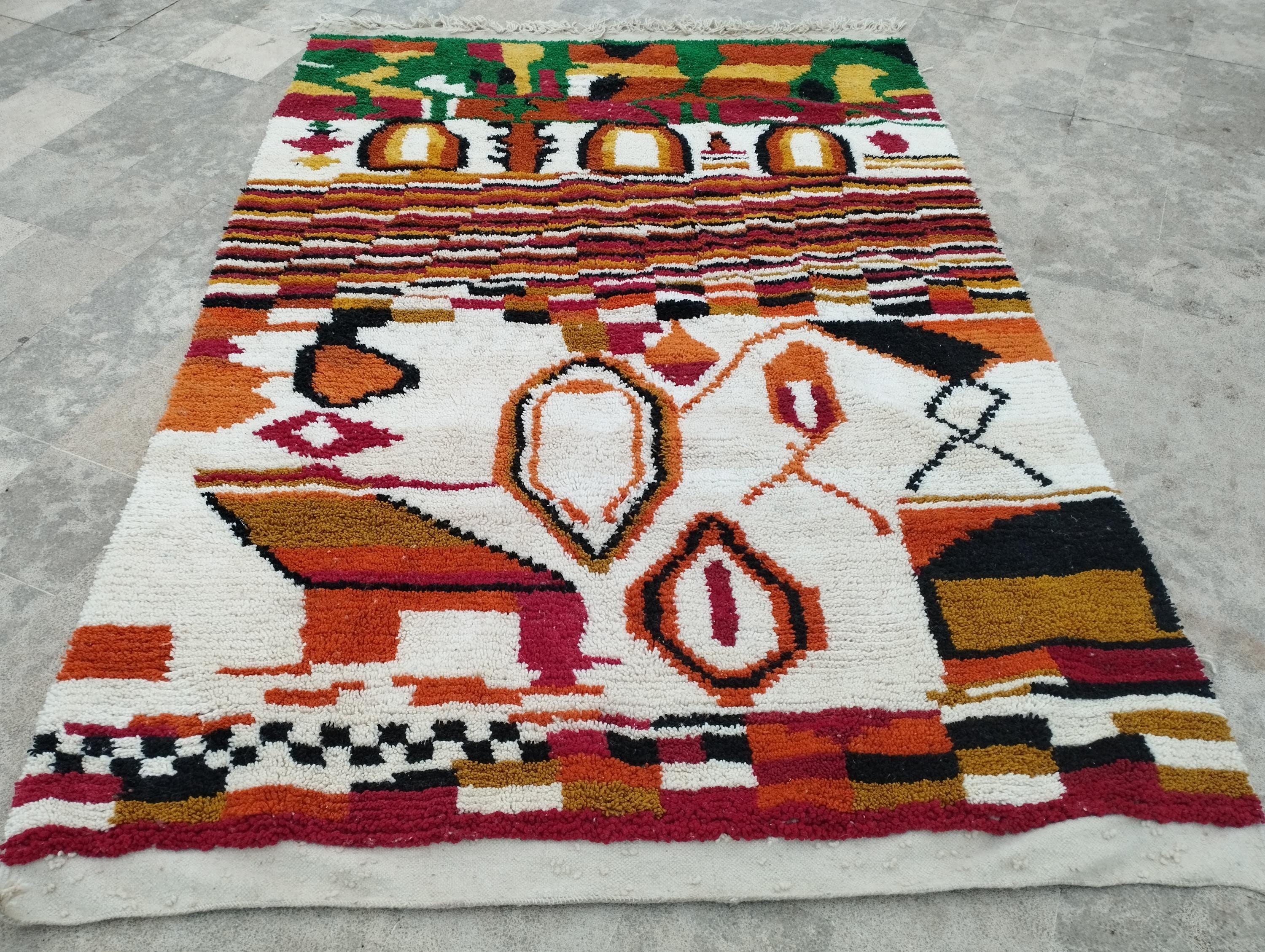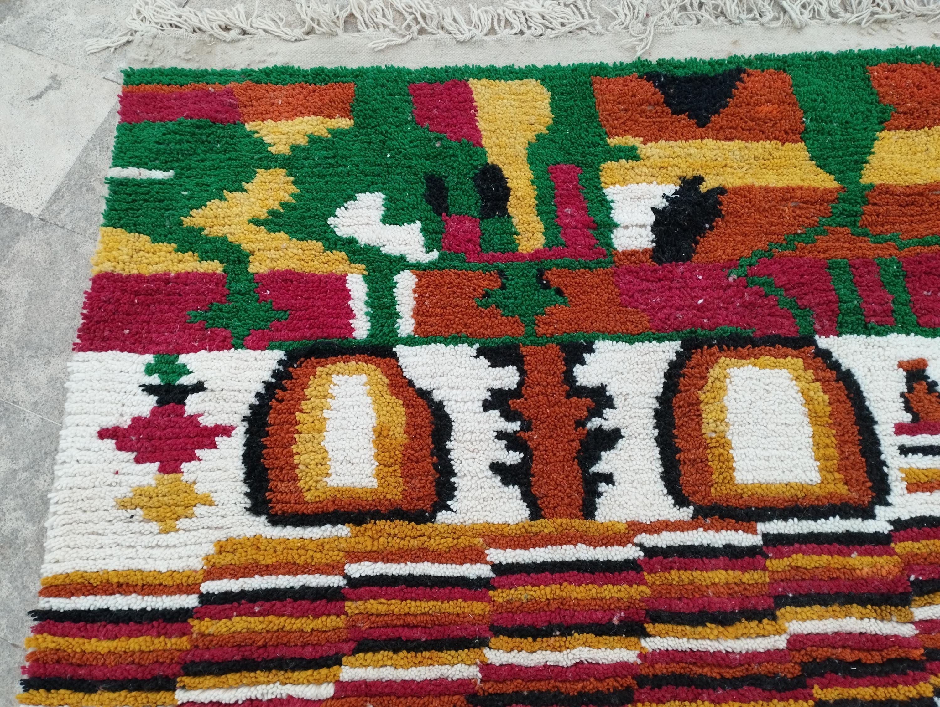 Bring warmth and authenticity into your home with this handwoven Moroccan Berber rug, a stunning example of boho home decor and tribal artistry. This colorful geometric rug features vibrant tones of red, orange, green, and black, making it a perfect statement piece for any living space.