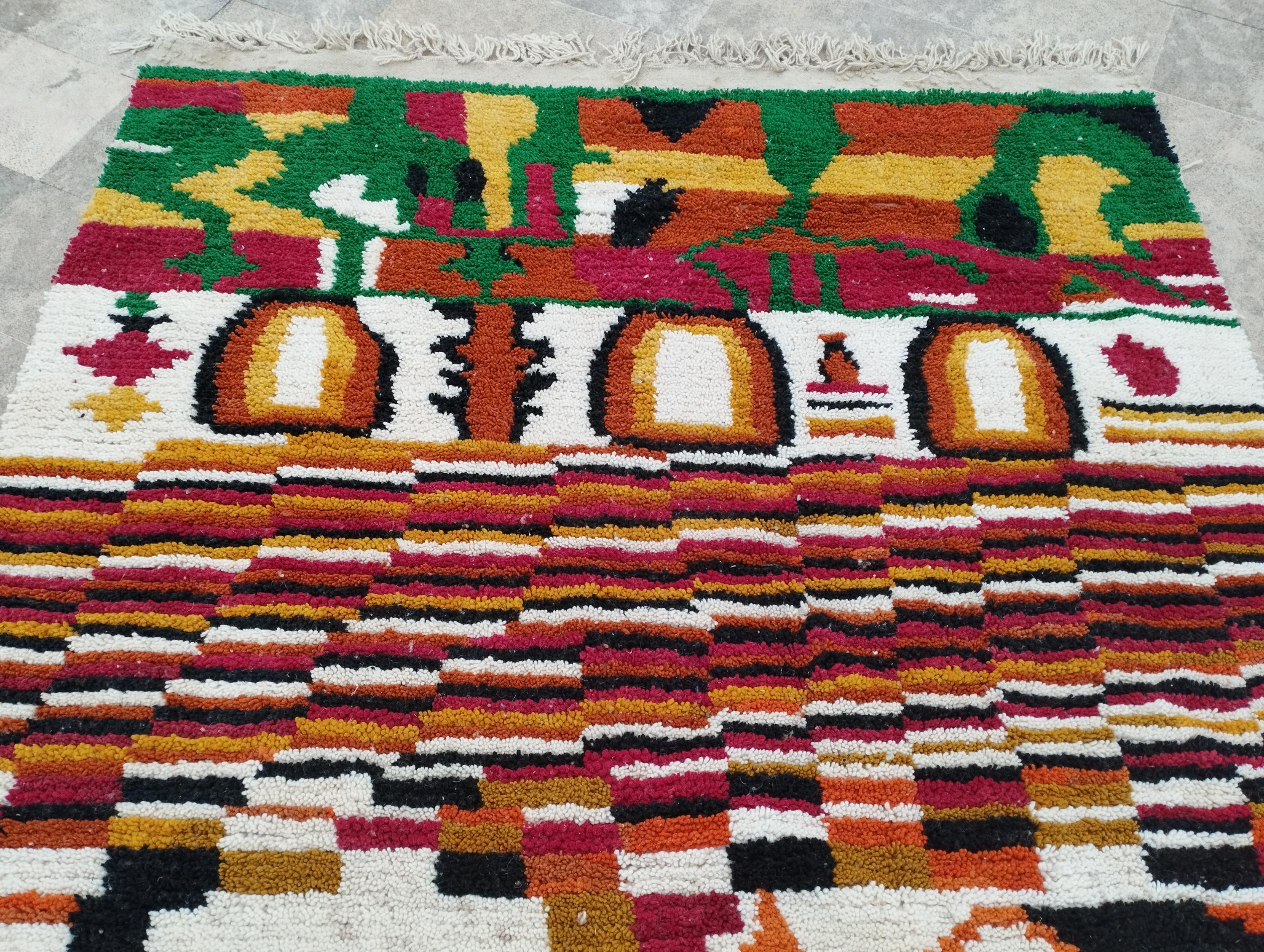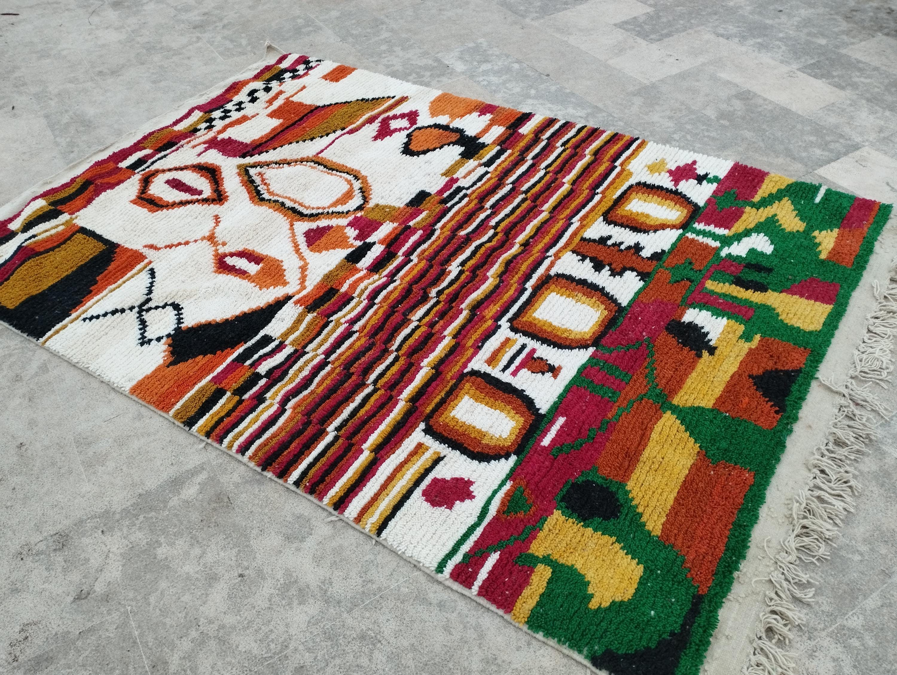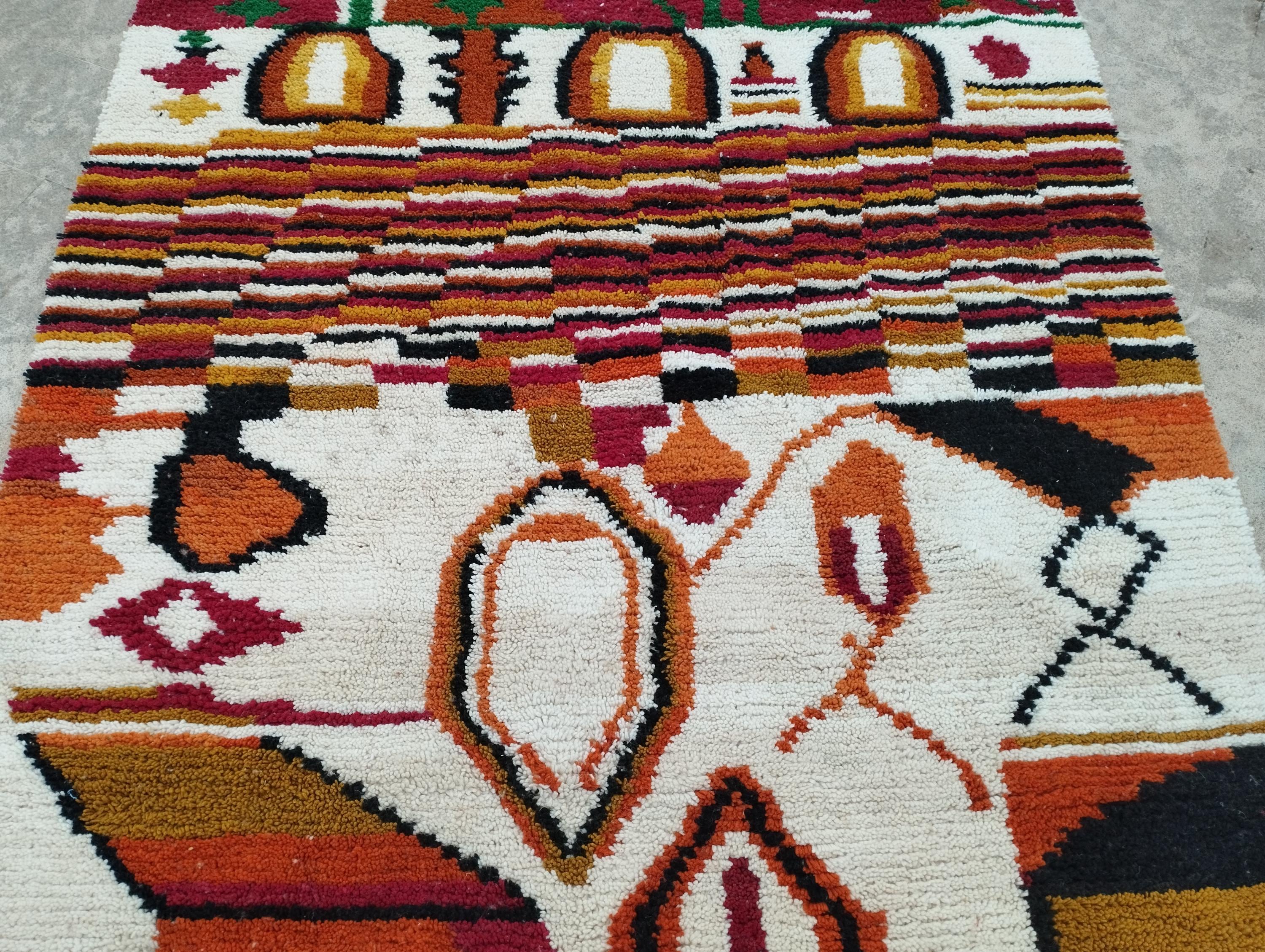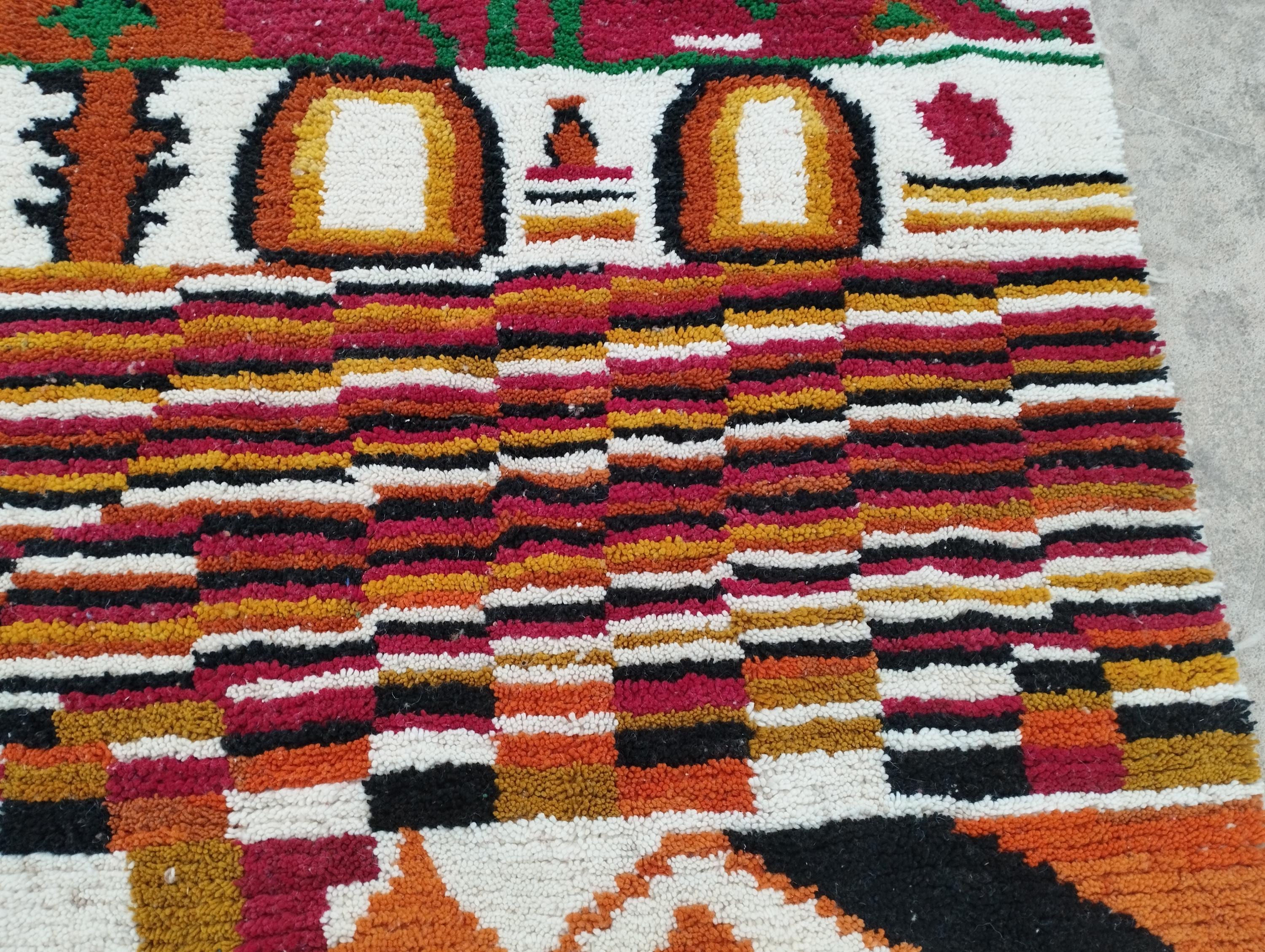 Bring warmth and authenticity into your home with this handwoven Moroccan Berber rug, a stunning example of boho home decor and tribal artistry. This colorful geometric rug features vibrant tones of red, orange, green, and black, making it a perfect statement piece for any living space.